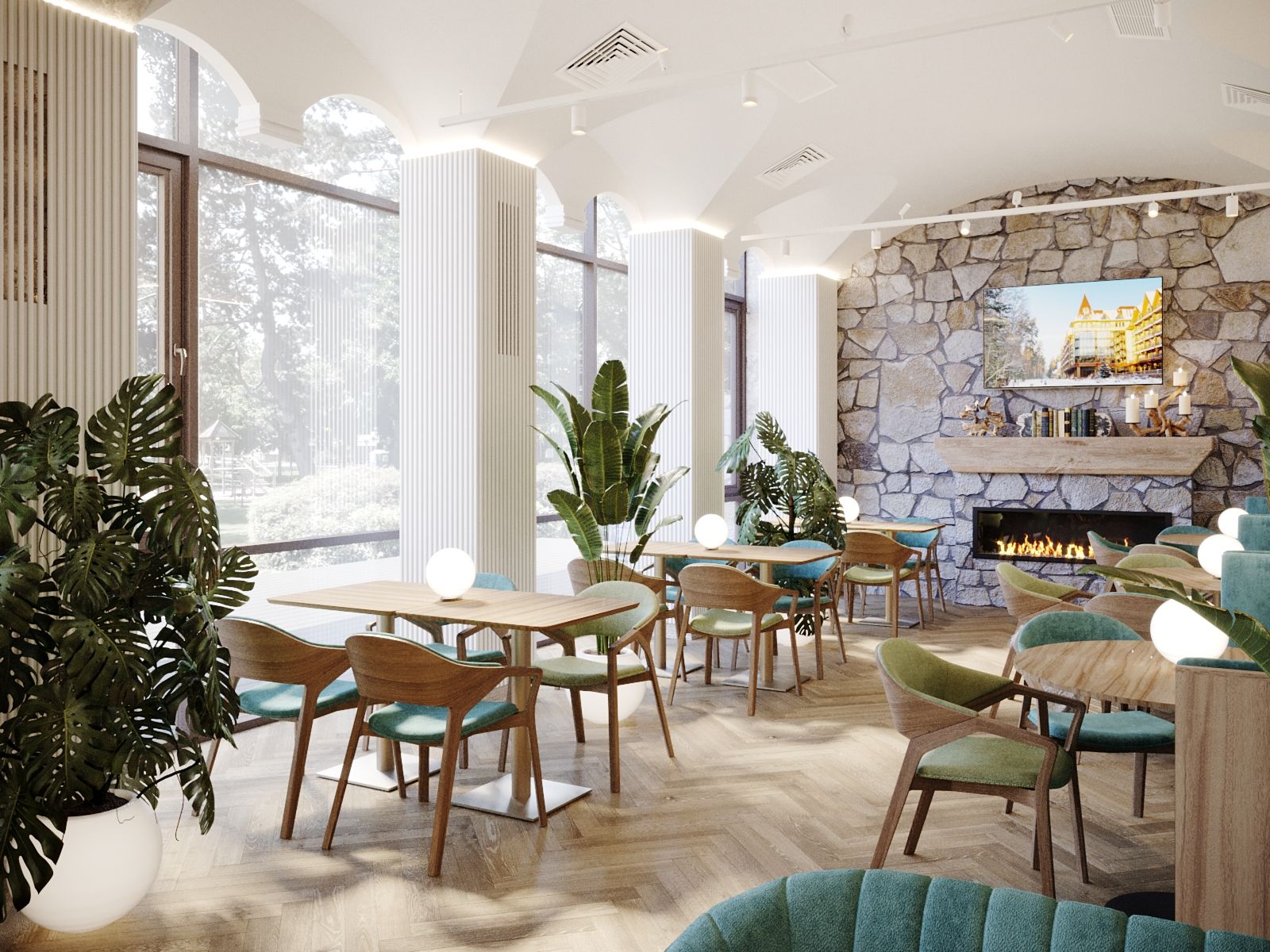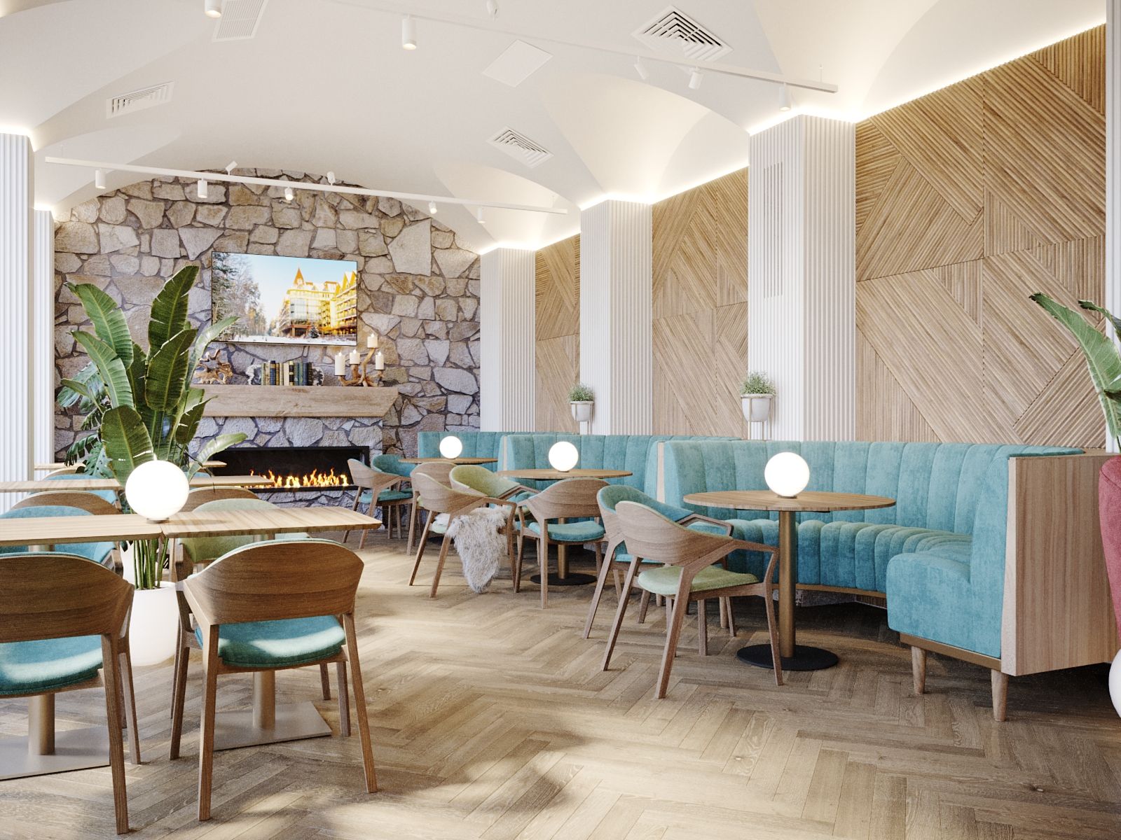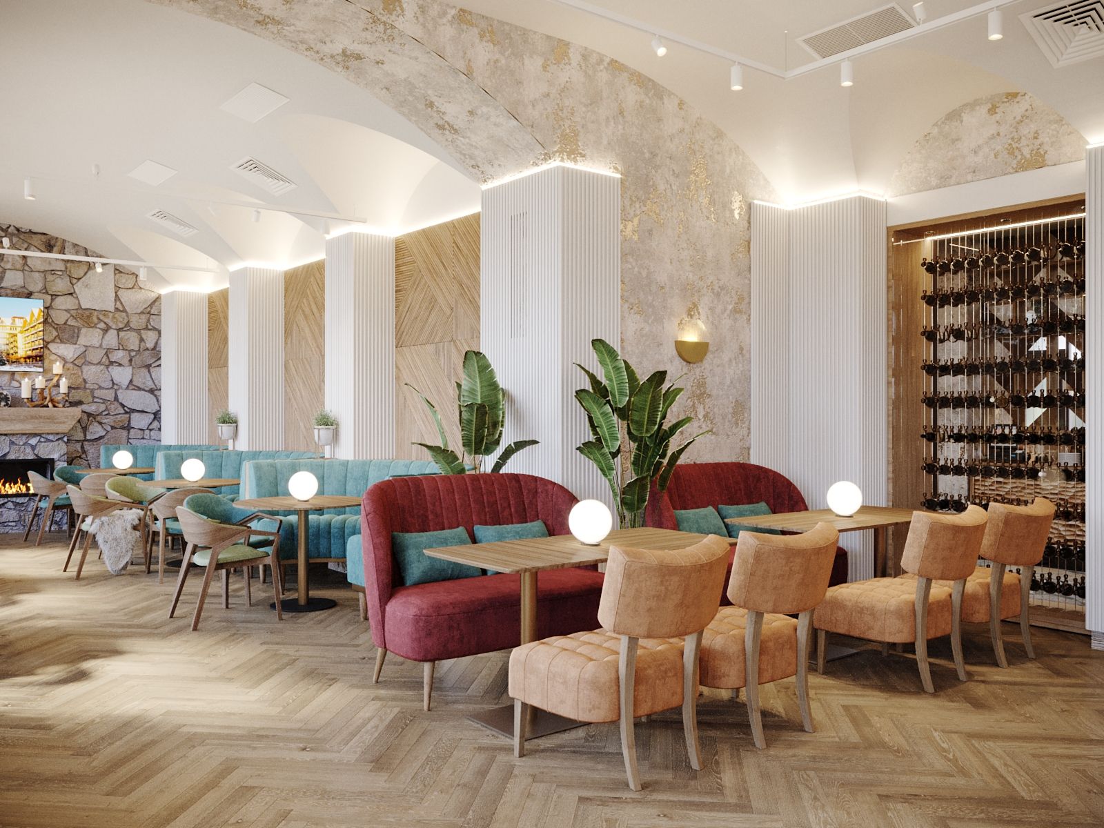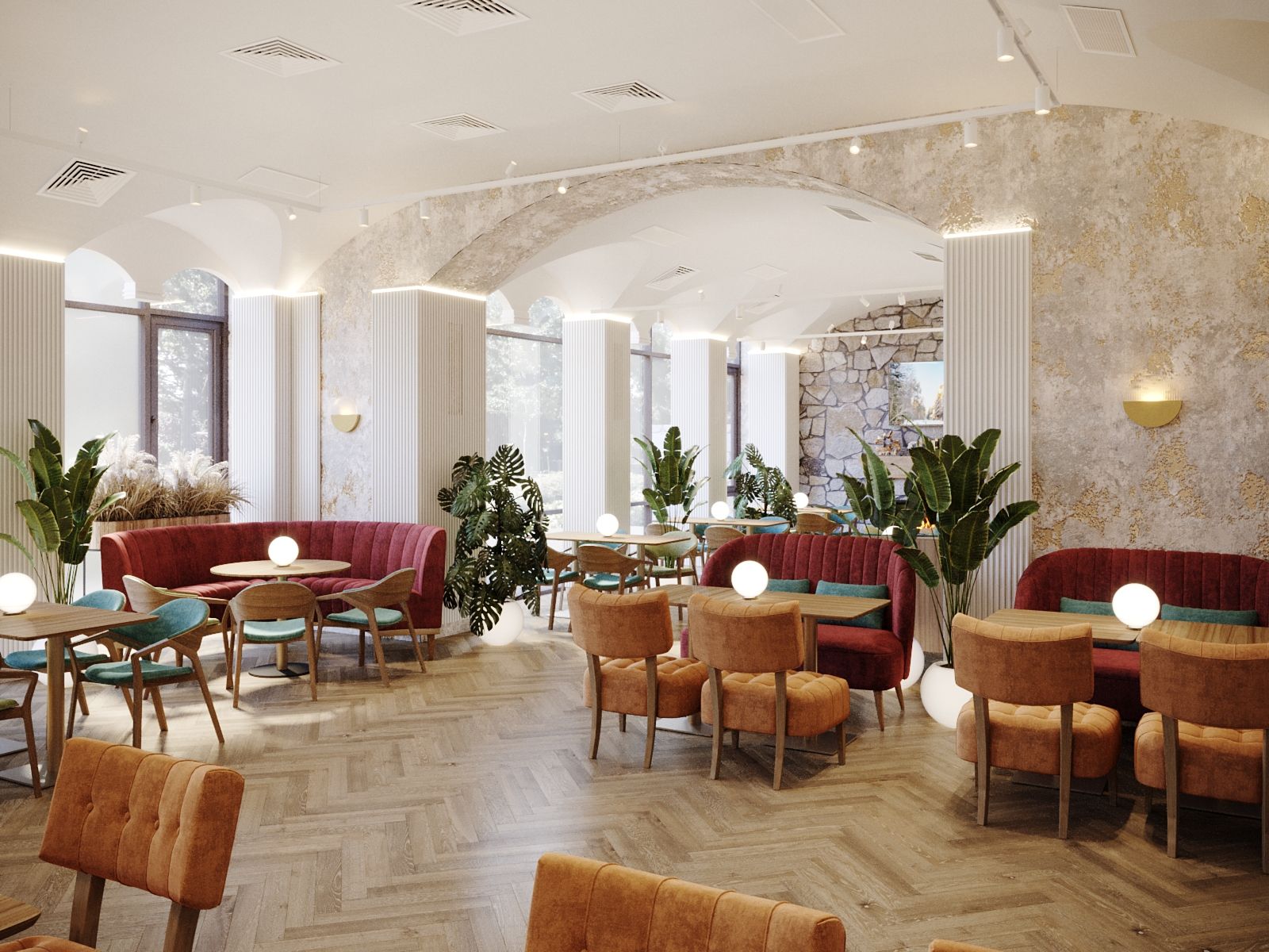 The new interior of the "Alperi" restaurant has a subtle hint of Austrian eco-style, incorporating broken stone and wood. The restaurant hall is divided into two main zones: the mountain peaks zone with a fireplace, a bar counter, and a dance floor, and the Alpine meadows zone with a fresco featuring meadow flowers, a 3D ceiling, and partition shelves. The project included multiple furniture arrangement modes for à la carte service and banquet service. We selected new furniture and wall finishes and created a new lighting concept. Without changing the floor covering (quartz vinyl tiles), a radically different material for the Gallery hall floor finish was chosen, while maintaining the same thickness of the coating (2 mm). It is a microcement imitation of slate.