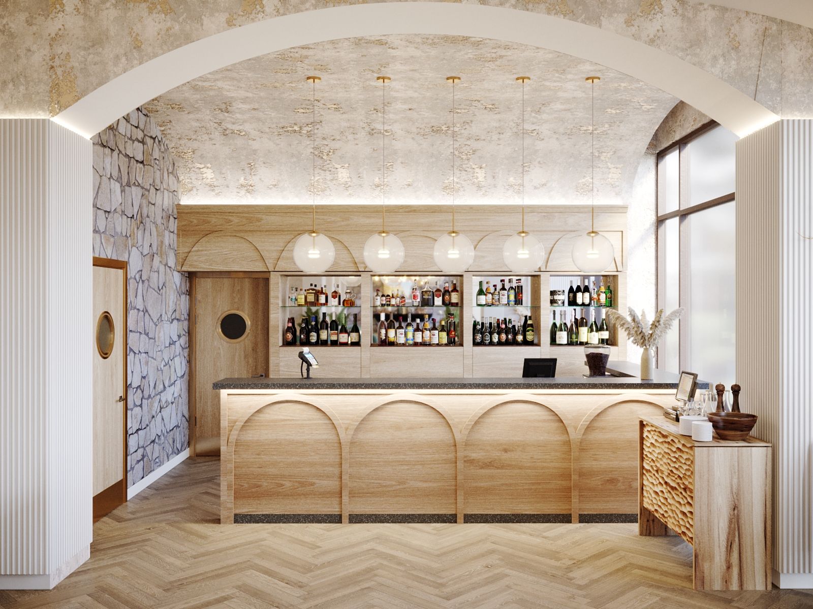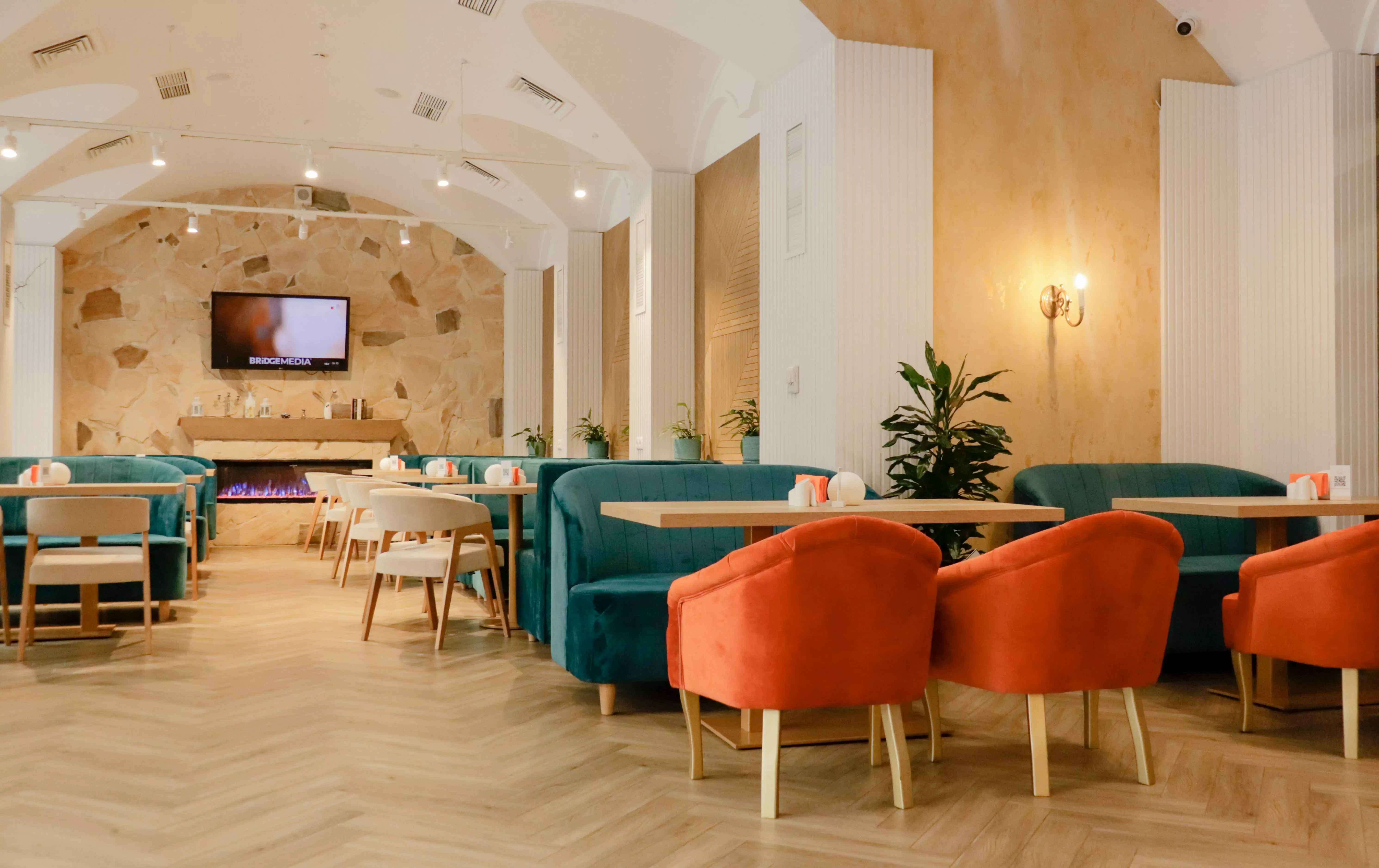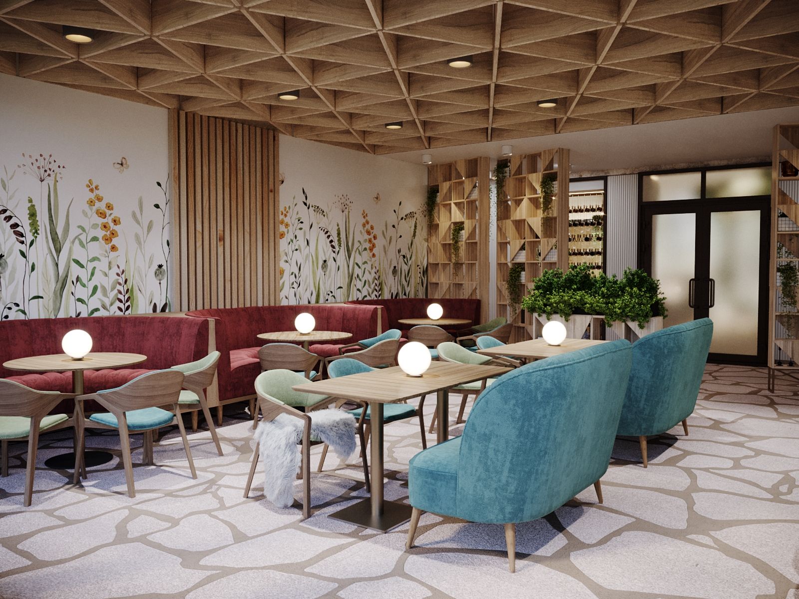 The new interior of the "Alperi" restaurant has a subtle hint of Austrian eco-style, incorporating broken stone and wood. The restaurant hall is divided into two main zones: the mountain peaks zone with a fireplace, a bar counter, and a dance floor, and the Alpine meadows zone with a fresco featuring meadow flowers, a 3D ceiling, and partition shelves. The project included multiple furniture arrangement modes for à la carte service and banquet service. We selected new furniture and wall finishes and created a new lighting concept. Without changing the floor covering (quartz vinyl tiles), a radically different material for the Gallery hall floor finish was chosen, while maintaining the same thickness of the coating (2 mm). It is a microcement imitation of slate.