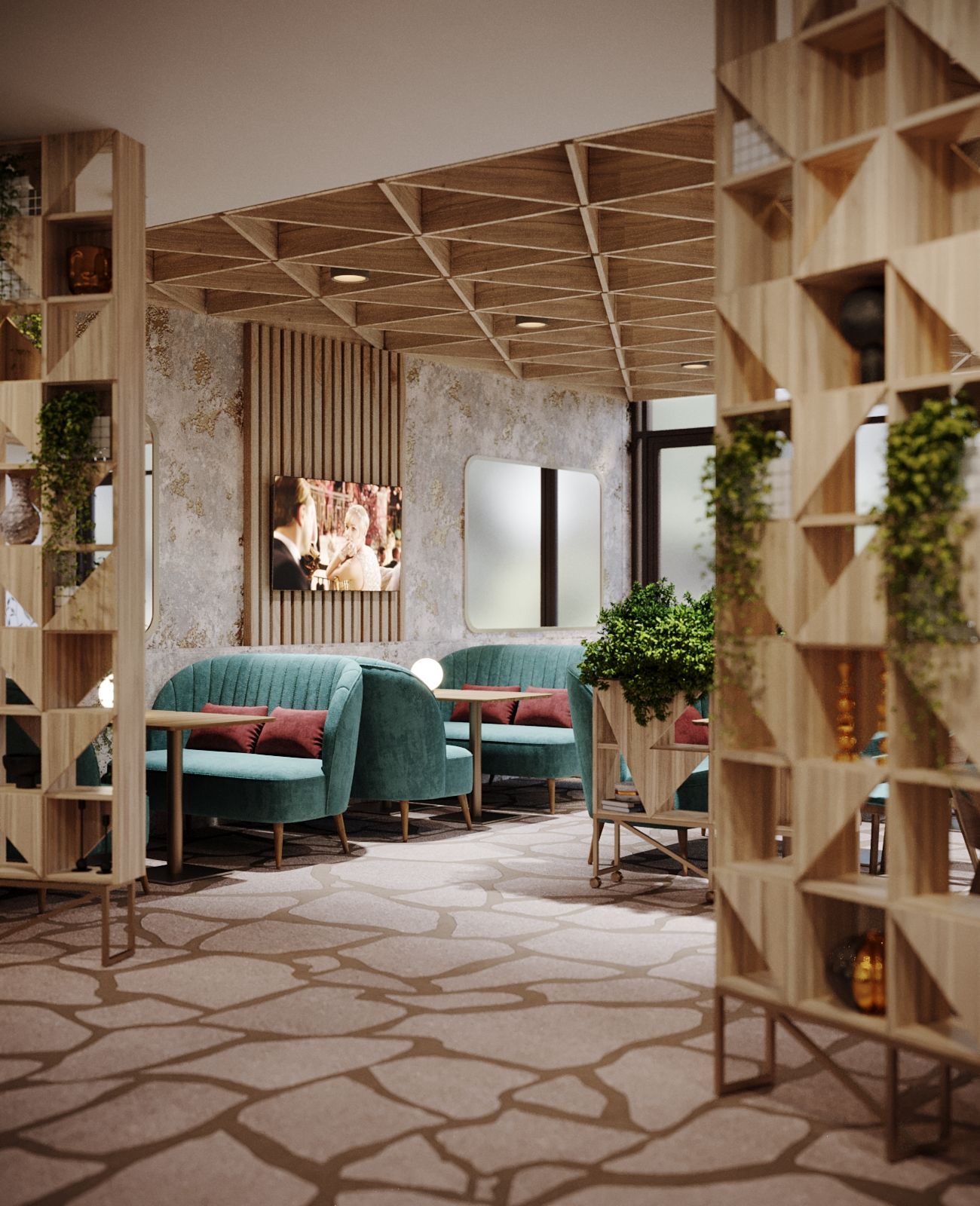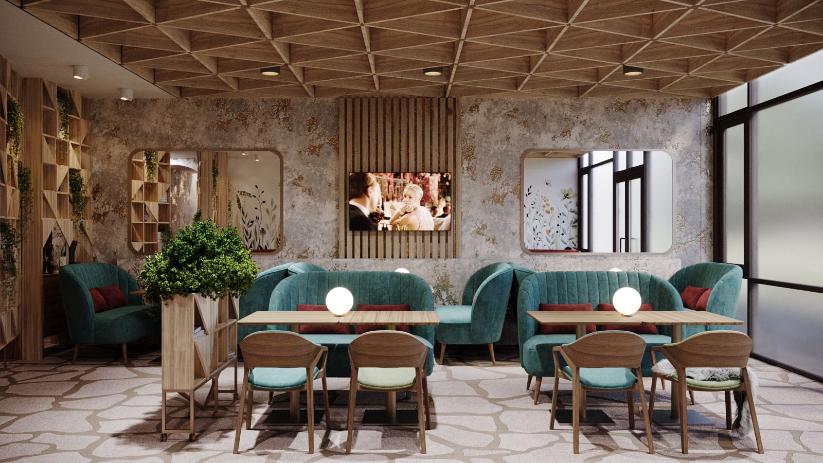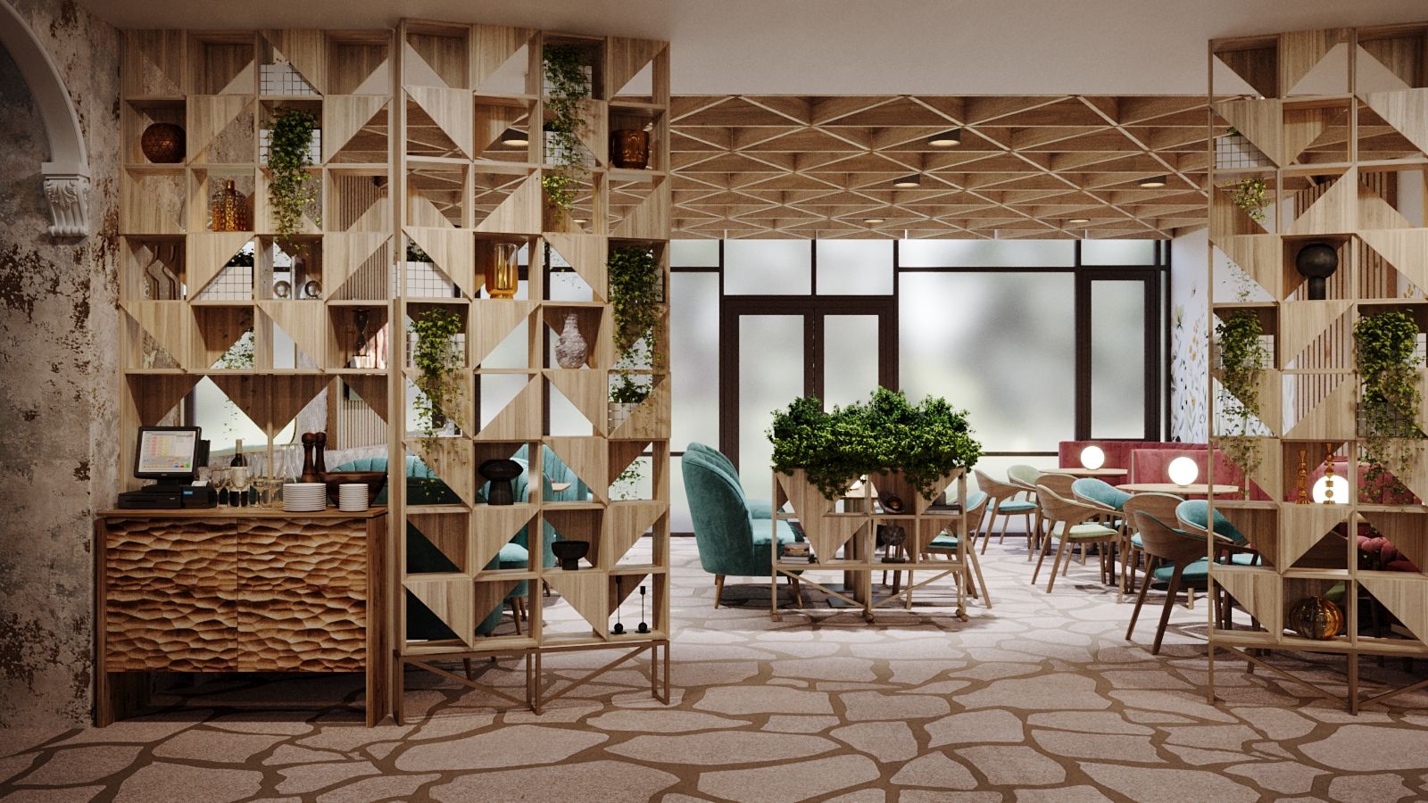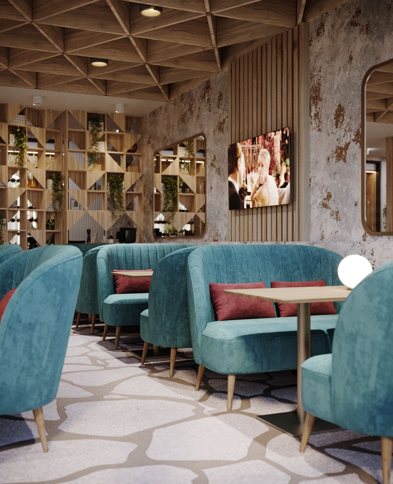 The new interior of the "Alperi" restaurant has a subtle hint of Austrian eco-style, incorporating broken stone and wood. The restaurant hall is divided into two main zones: the mountain peaks zone with a fireplace, a bar counter, and a dance floor, and the Alpine meadows zone with a fresco featuring meadow flowers, a 3D ceiling, and partition shelves. The project included multiple furniture arrangement modes for à la carte service and banquet service. We selected new furniture and wall finishes and created a new lighting concept. Without changing the floor covering (quartz vinyl tiles), a radically different material for the Gallery hall floor finish was chosen, while maintaining the same thickness of the coating (2 mm). It is a microcement imitation of slate.