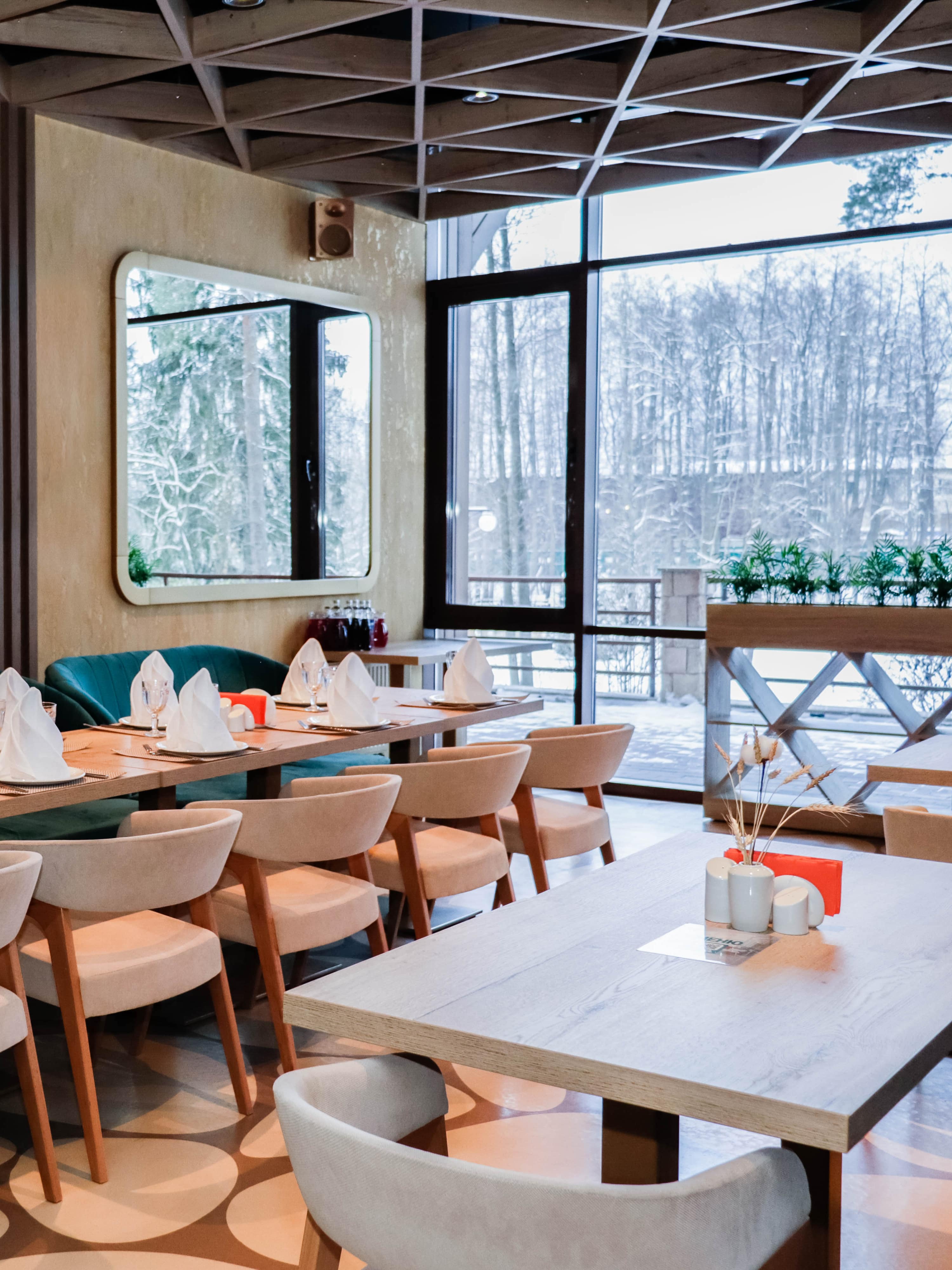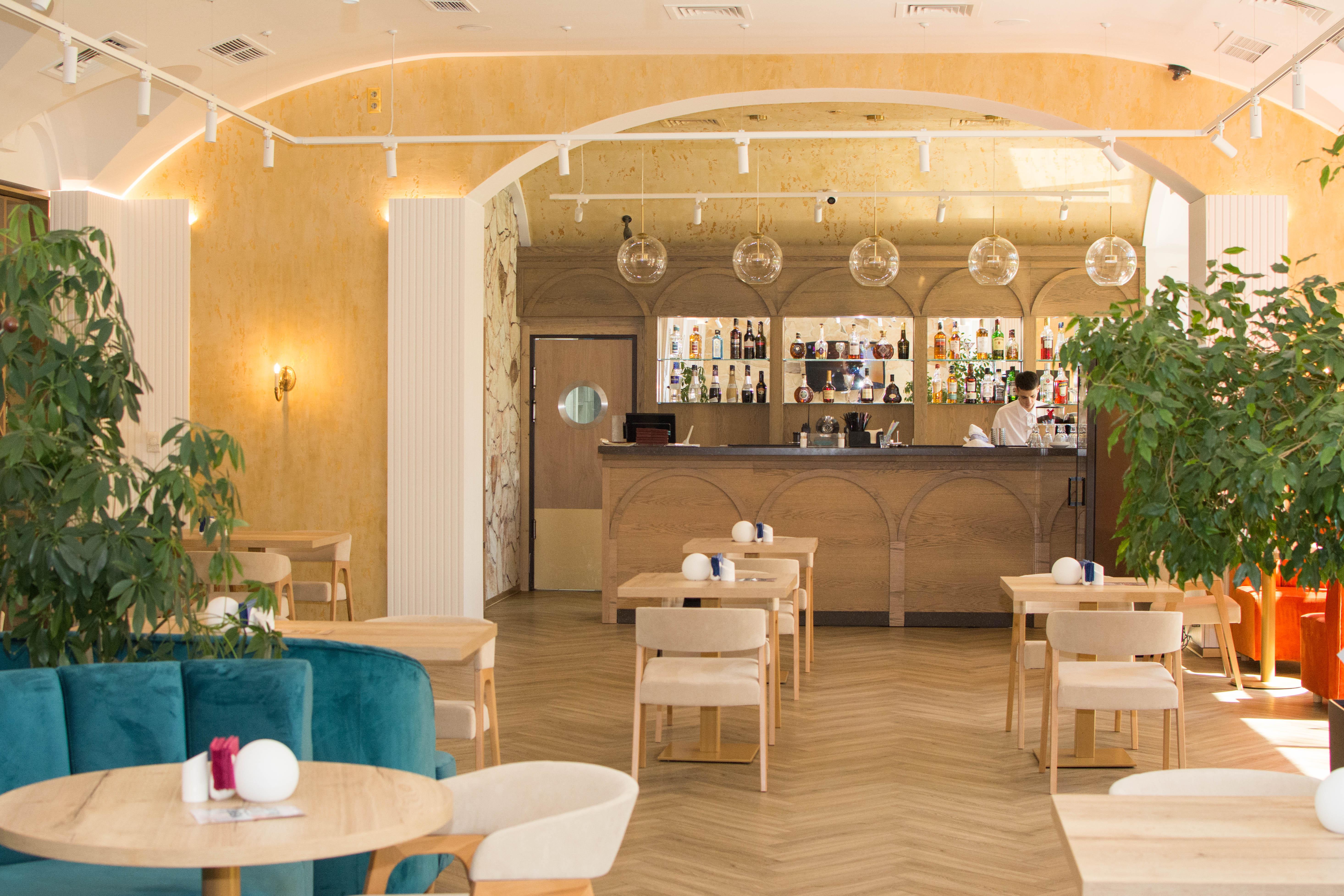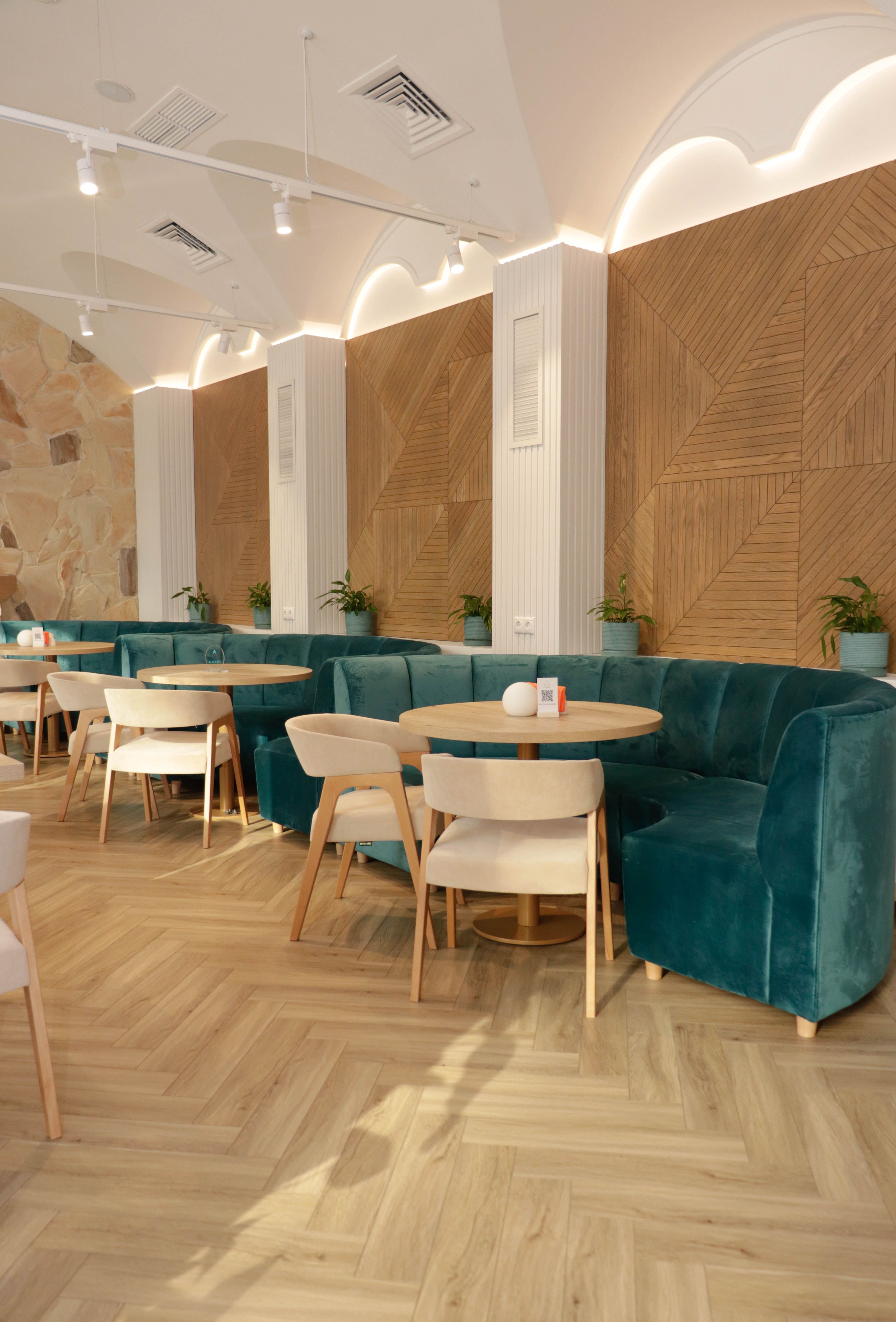 The interior incorporates several lighting scenarios for each use of the space. Round portable lamps are placed on the tables for evenings and celebrations, creating a subdued and non-glaring light (the overhead lights are turned off in this case). General bright overhead lighting is also designed. The vaulted ceiling is additionally illuminated.