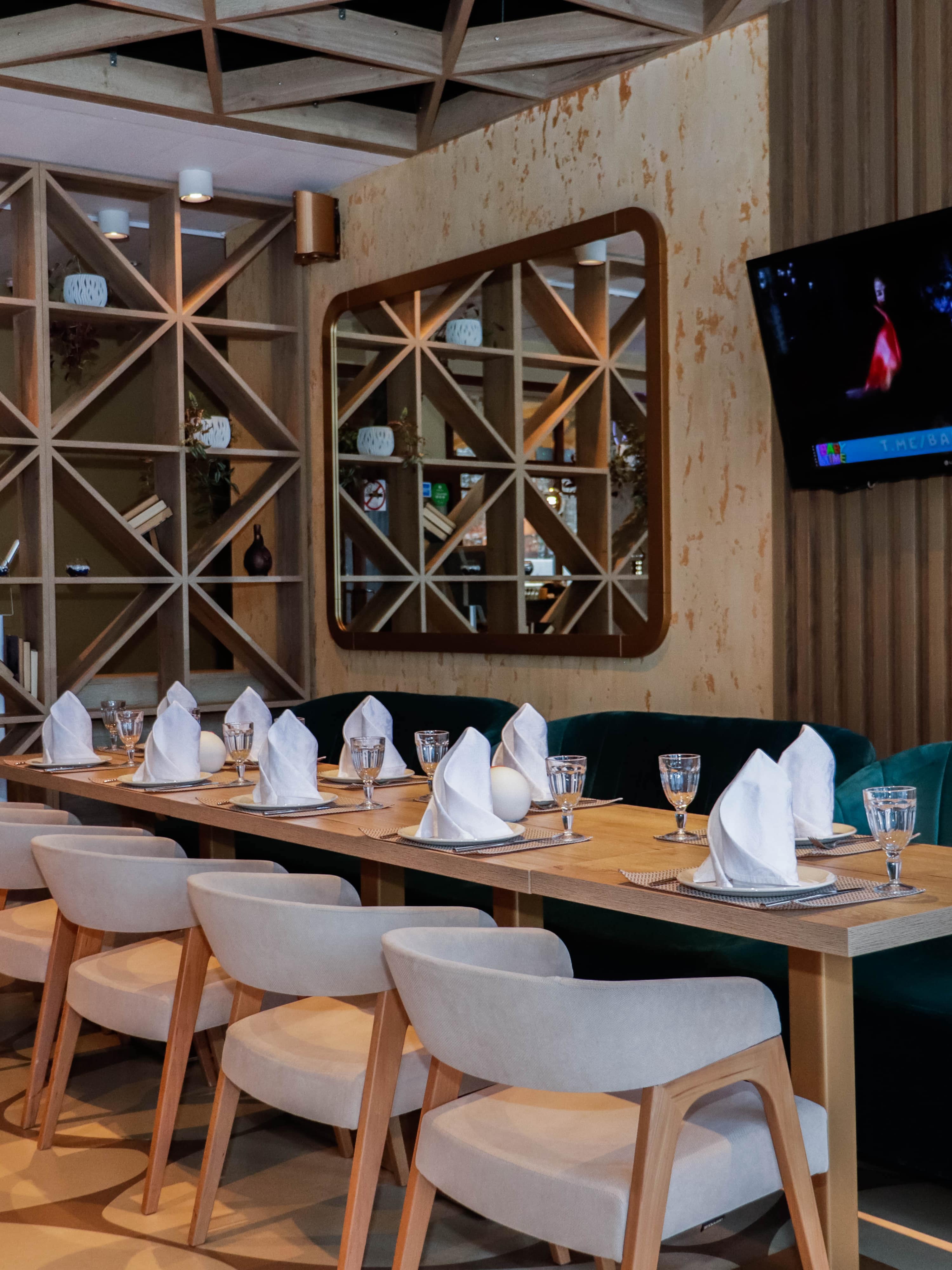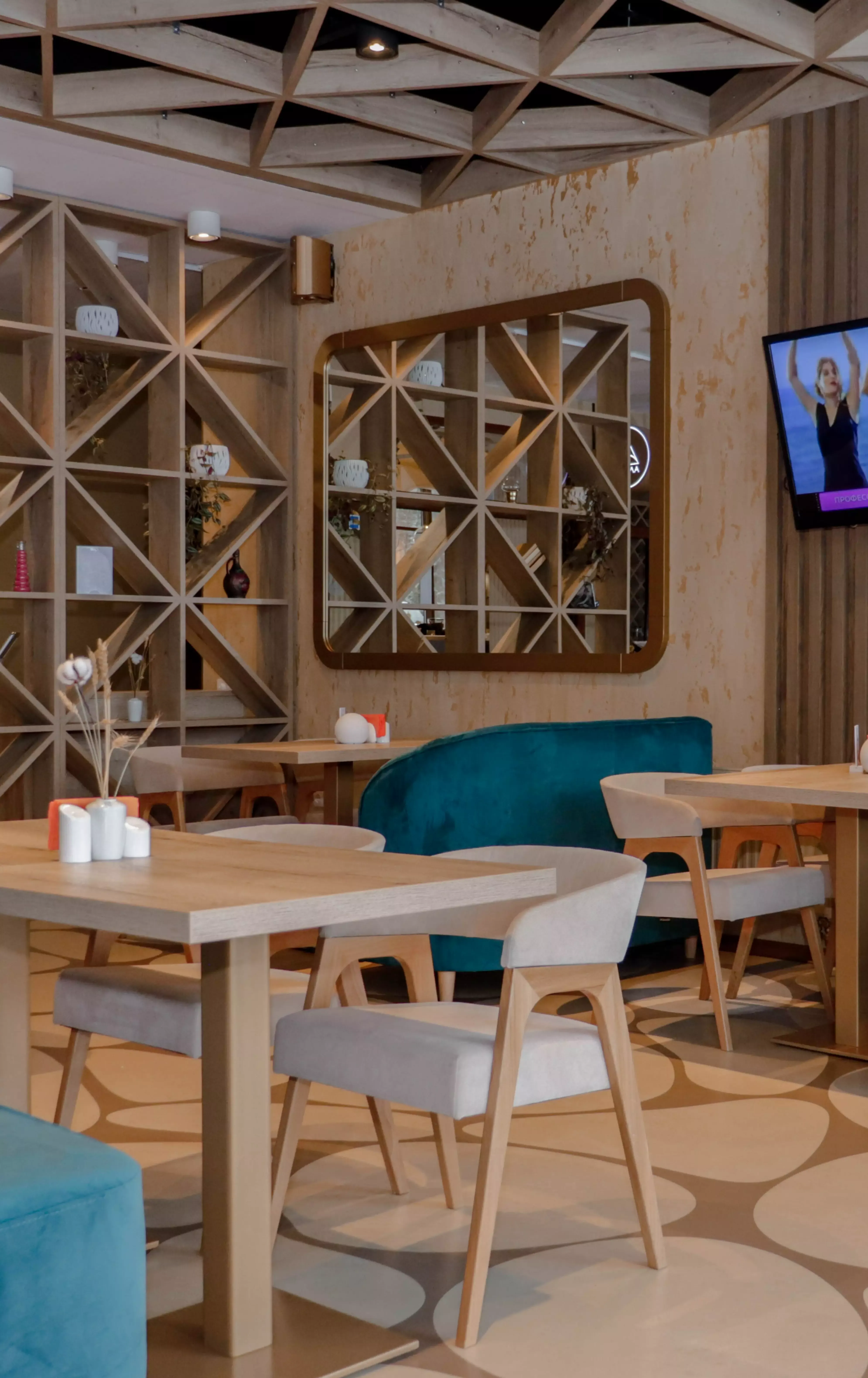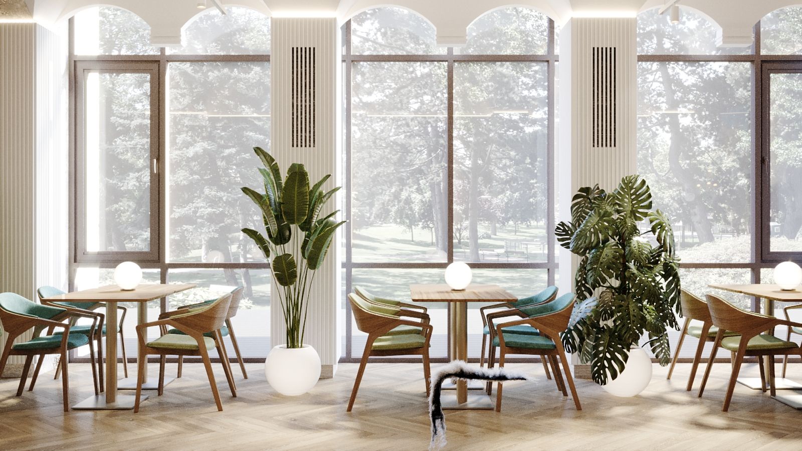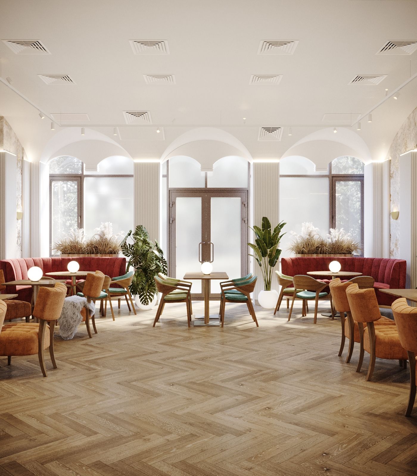 The interior incorporates several lighting scenarios for each use of the space. Round portable lamps are placed on the tables for evenings and celebrations, creating a subdued and non-glaring light (the overhead lights are turned off in this case). General bright overhead lighting is also designed. The vaulted ceiling is additionally illuminated.
