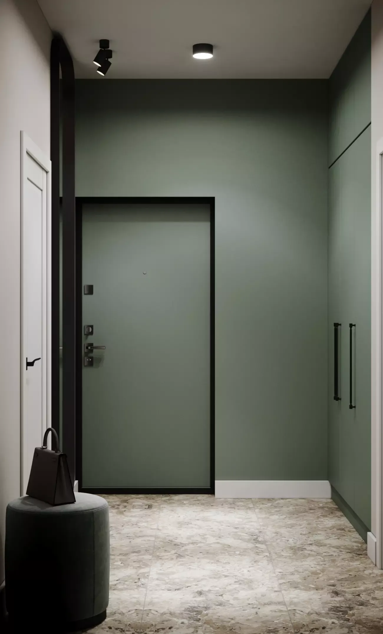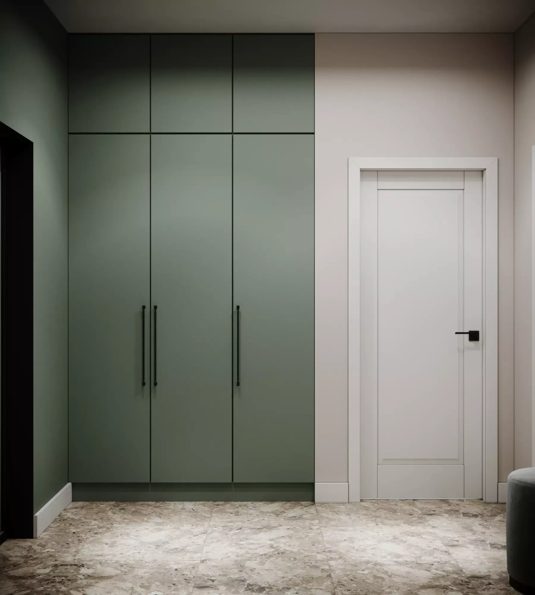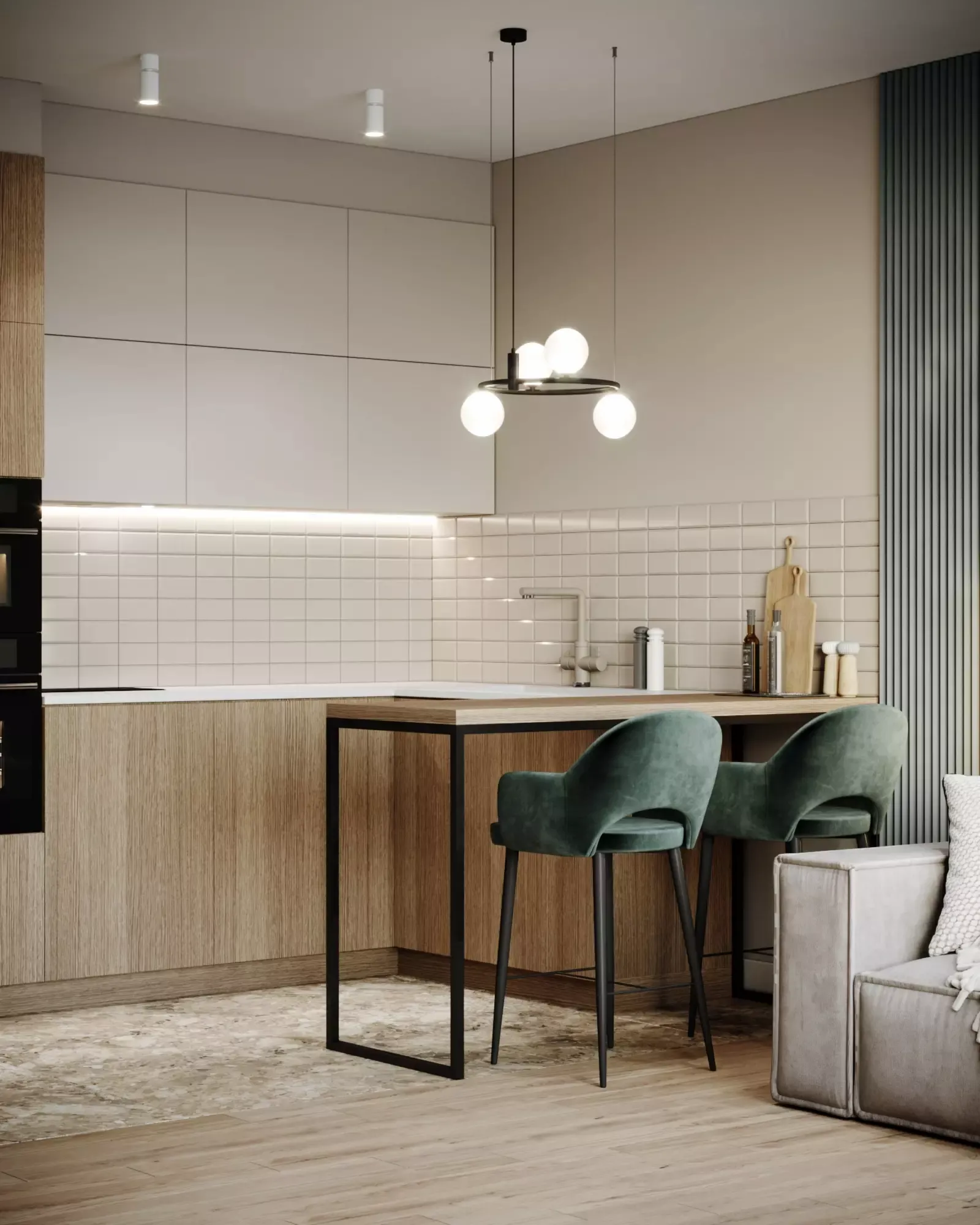 Choosing the color of this apartment, we settled on a calm deep green and neutral beige. This combination of colors was not chosen by chance. Green is a popular choice for interiors due to its ability to create a sense of calm and serenity. This color is associated with nature and freshness, so using it in interior design can bring a sense of harmony and naturalness to the room. In addition, green can be used in different hues, from bright to pastel, which makes it possible to create different moods in the room. For example, bright green furniture or dรฉcor can create a sense of energy and dynamism, while pastel shades of green can add softness and serenity to an interior.