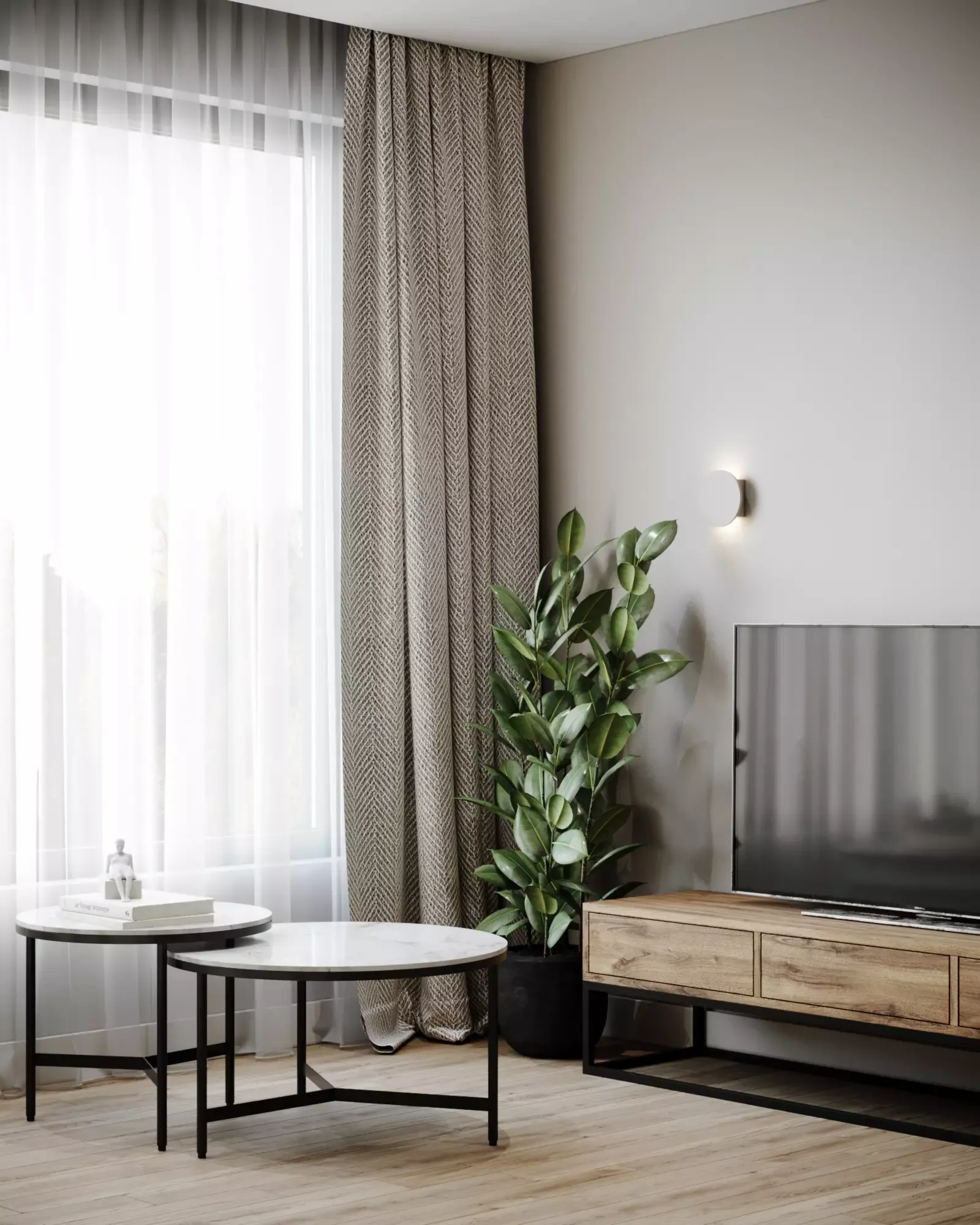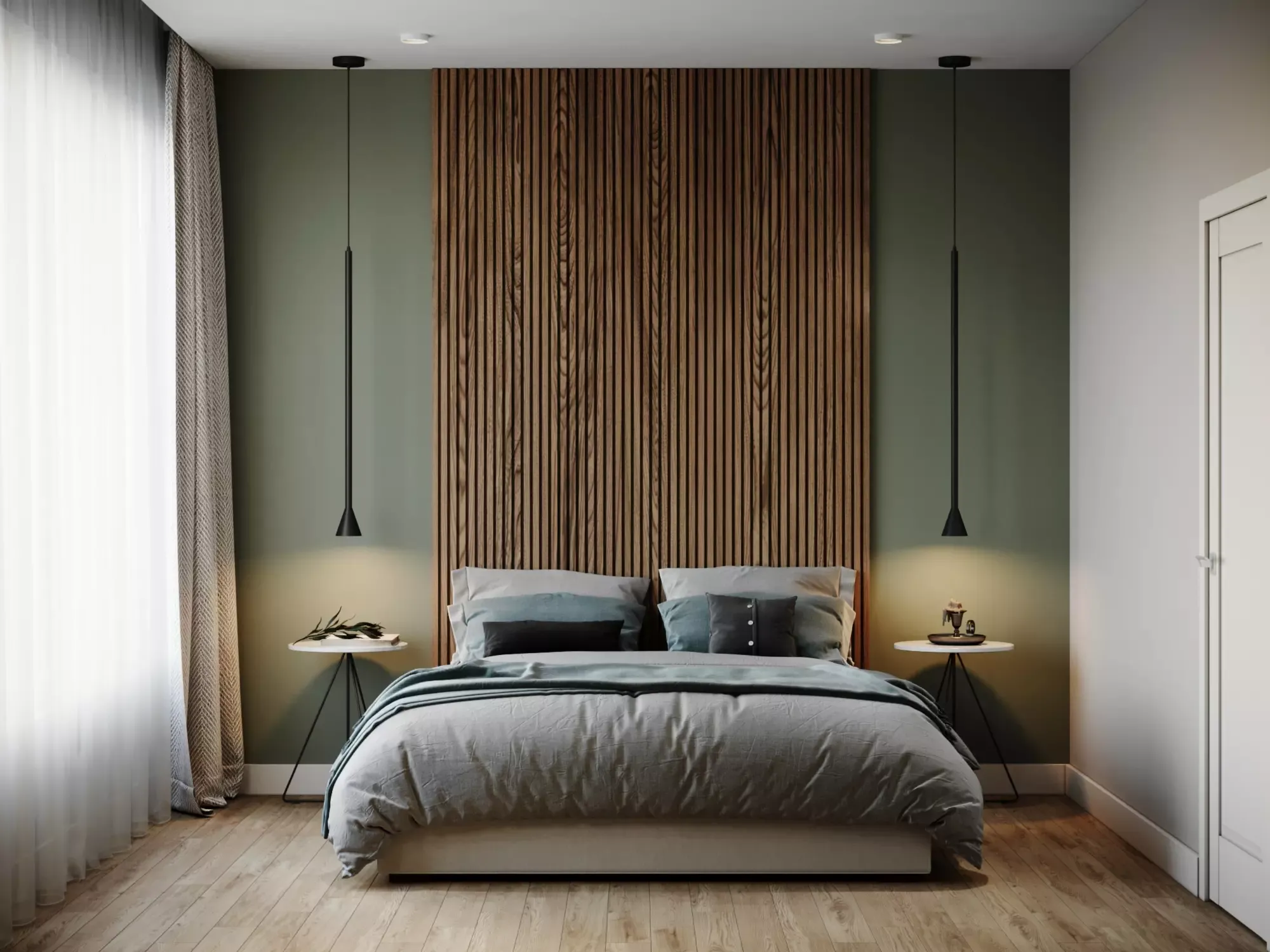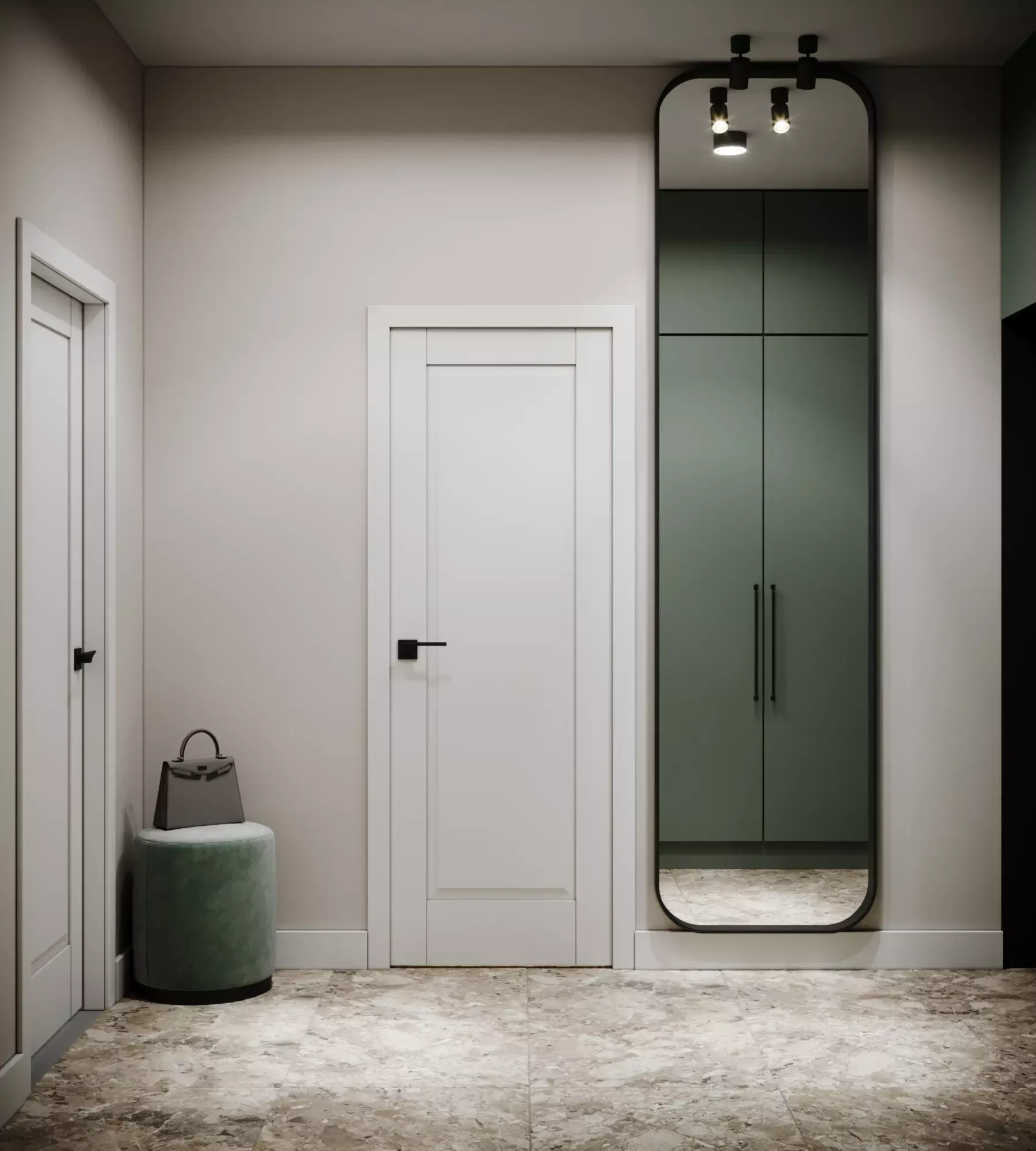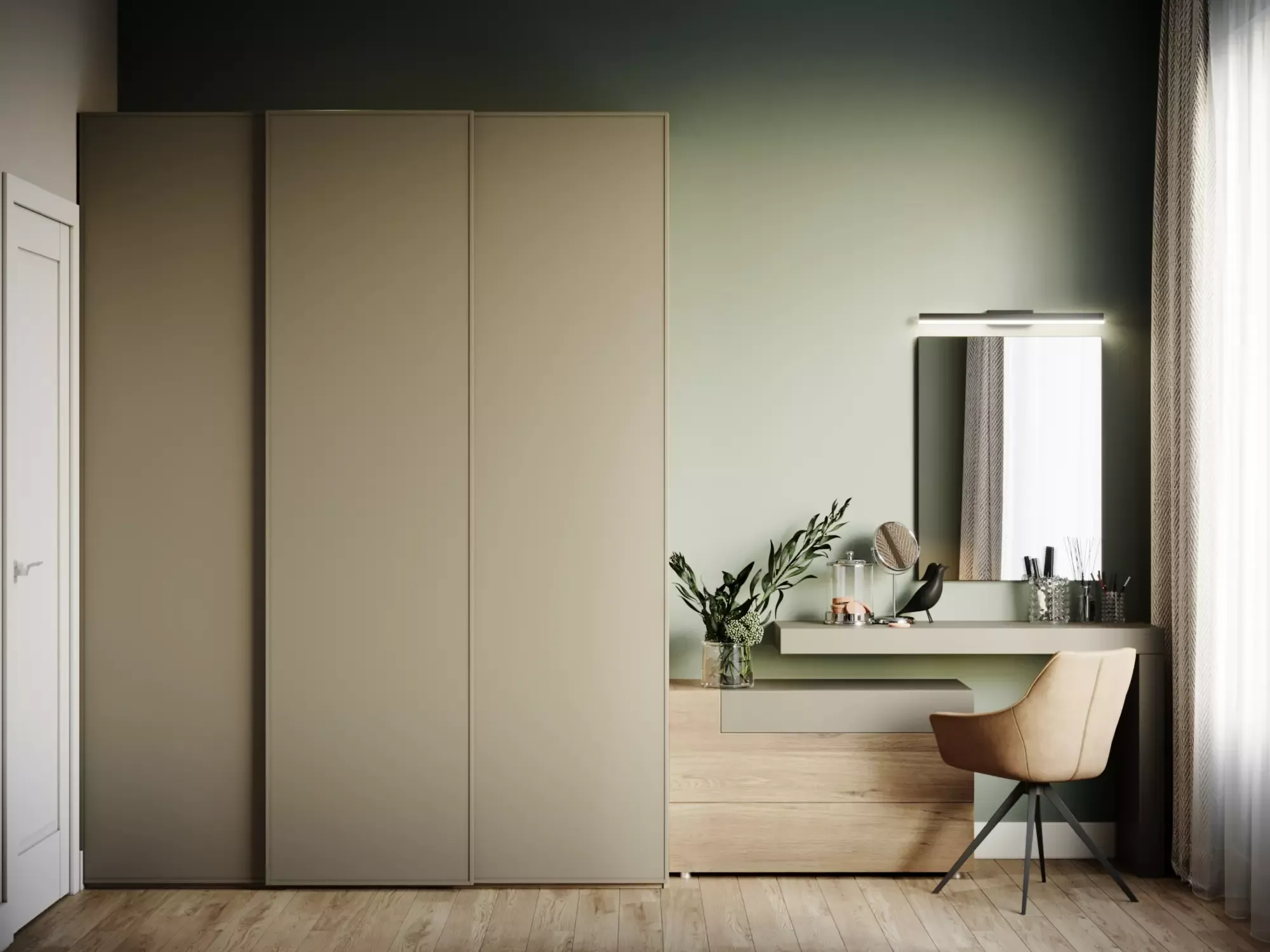 Choosing the color of this apartment, we settled on a calm deep green and neutral beige. This combination of colors was not chosen by chance. Green is a popular choice for interiors due to its ability to create a sense of calm and serenity. This color is associated with nature and freshness, so using it in interior design can bring a sense of harmony and naturalness to the room. In addition, green can be used in different hues, from bright to pastel, which makes it possible to create different moods in the room. For example, bright green furniture or dรฉcor can create a sense of energy and dynamism, while pastel shades of green can add softness and serenity to an interior.