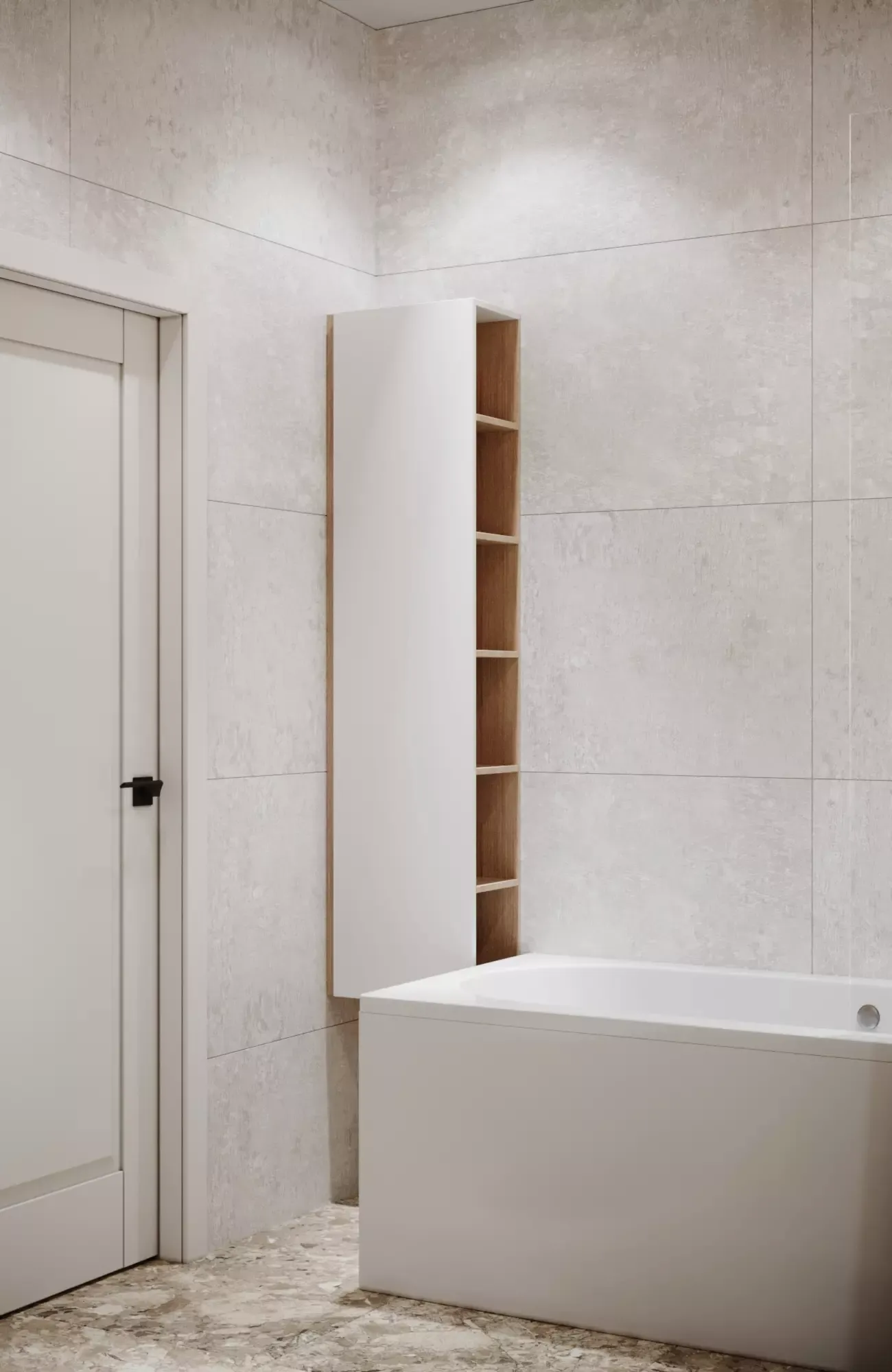 It is designed in a modern minimalist style using soft colors and materials imitating natural stone. Apartment is 45 m2 with a separate bedroom and a large kitchen-living room. In the mudroom there is a wardrobe for outerwear. The second wardrobe is installed in the bedroom. The bathroom has a bath. The entire bathroom is designed to fit both a bathtub and a washing machine, as well as a large worktop for possible baby changing, and a cleaning cabinet for household chemicals. The kitchen is U-shaped, where the dining table is an additional work surface. Semi-bar stools are substituted for it, and the sofa unfolds.