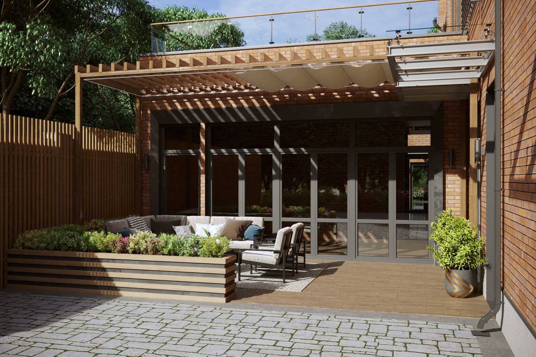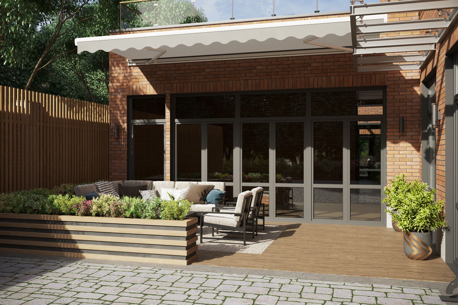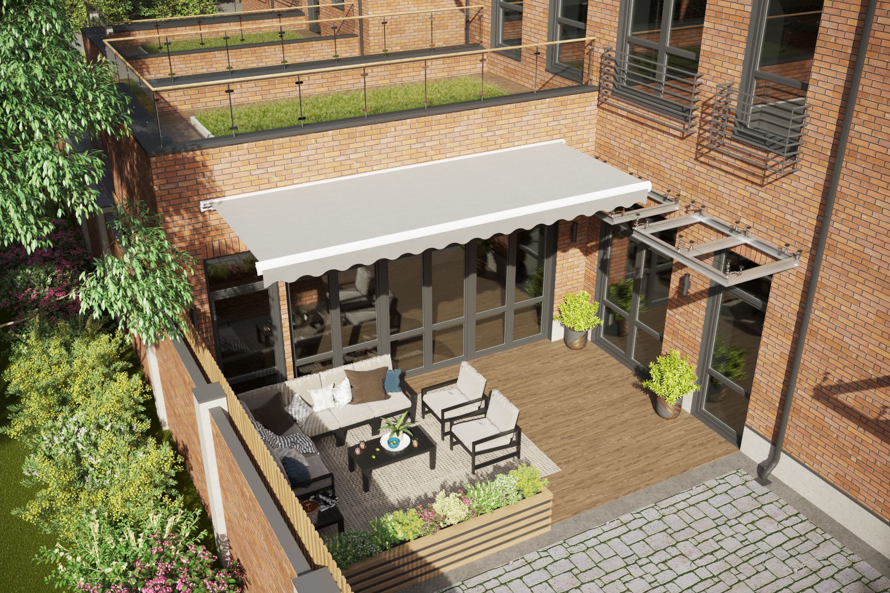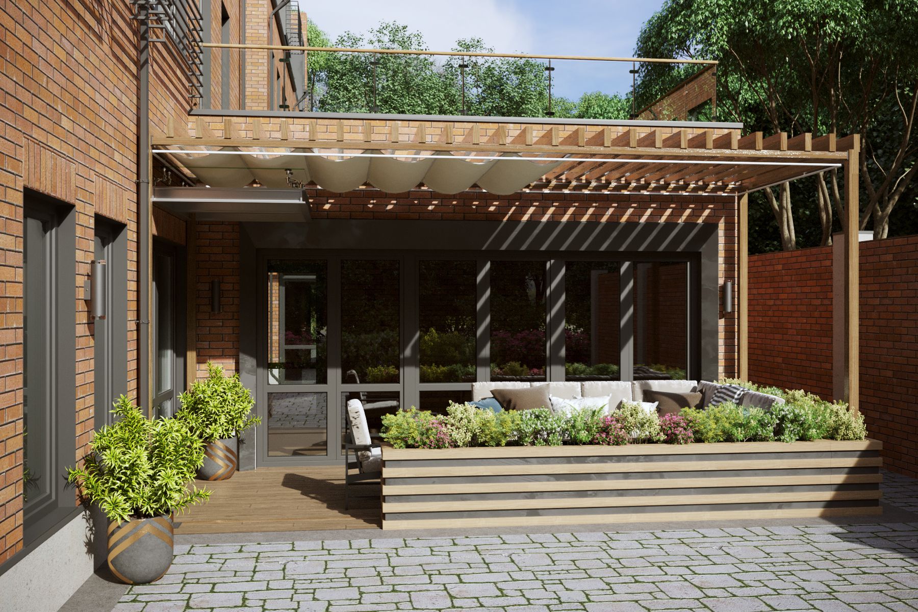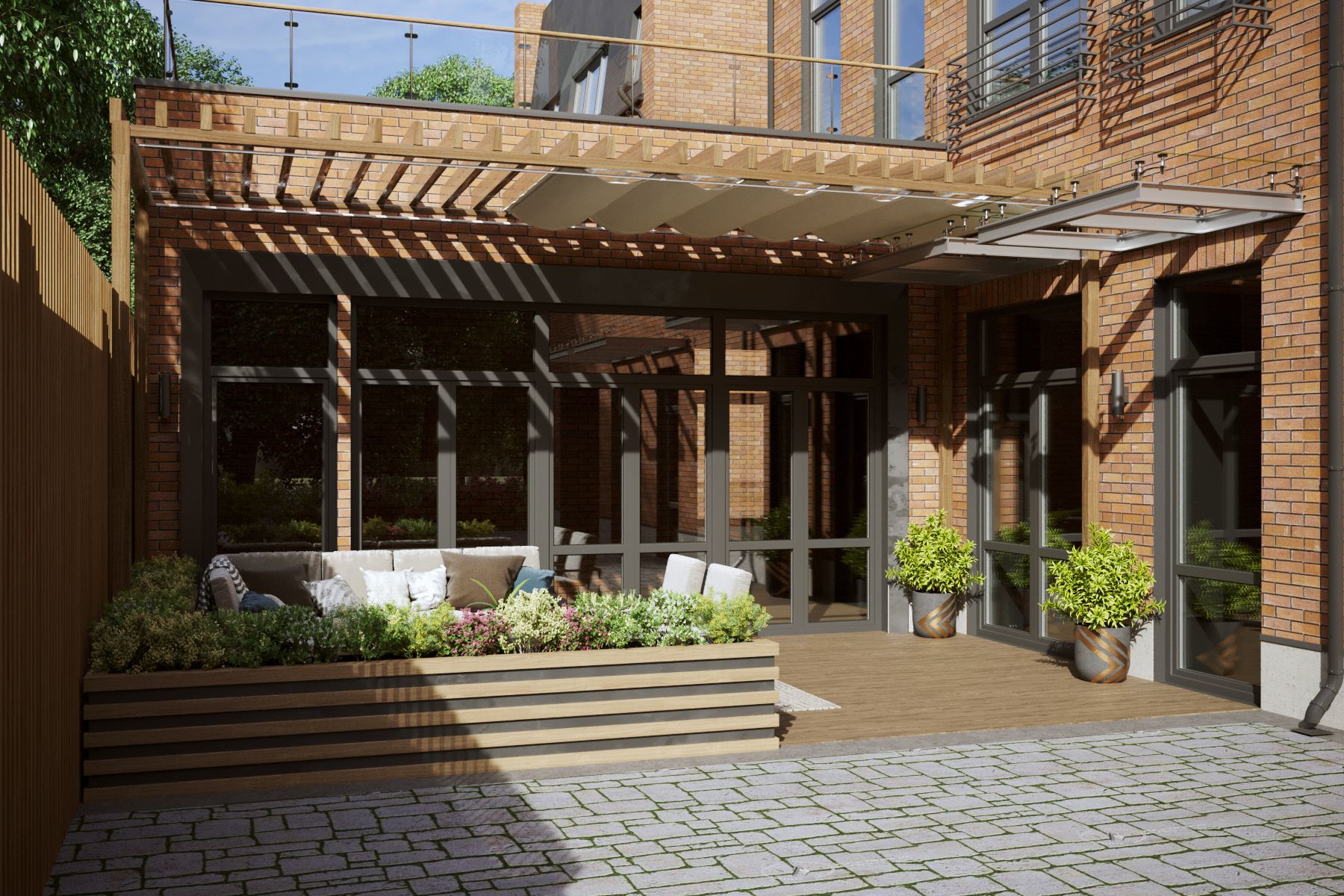 The extensions were designed in two variations: with a canopy in the form of a marquee or a pergola. They were located on the courtyard side and served as protection for the barbecue area from the sun or rain. The roofs of the extensions were designed with usable flat roofs, allowing for the possibility of planting small shrubs and flowers.
