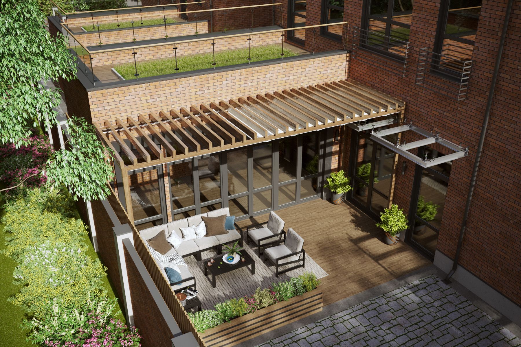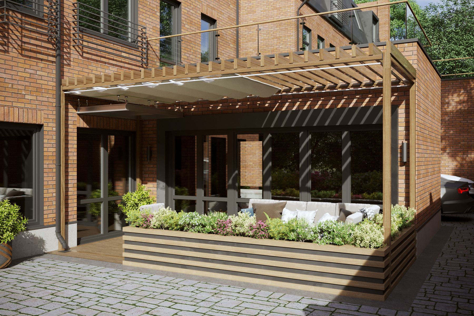 The project not only included functional living room extensions but also a convenient underground parking and the protection and improvement of the space around the townhouses.