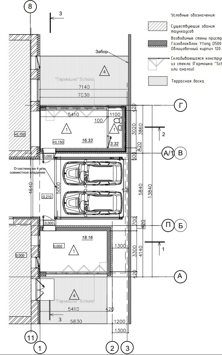 The project involved the construction of two additional living room extensions for two townhouses, which were separated by a driveway. Additionally, the project included the creation of a mechanized underground platform-parking for two parking spaces.
