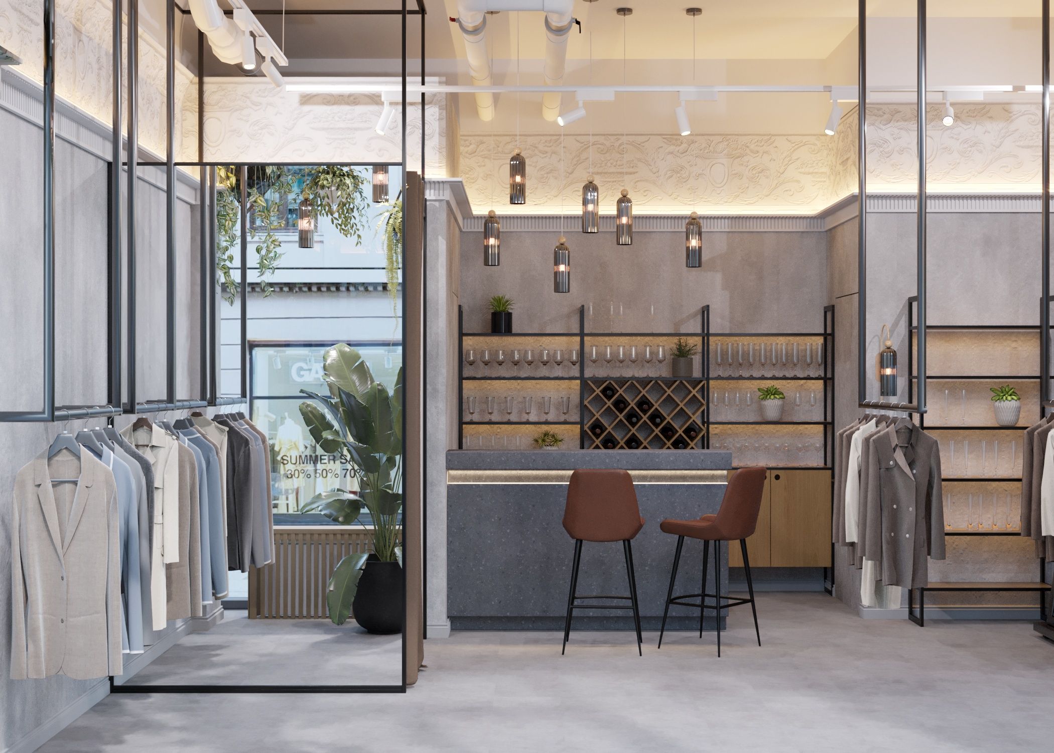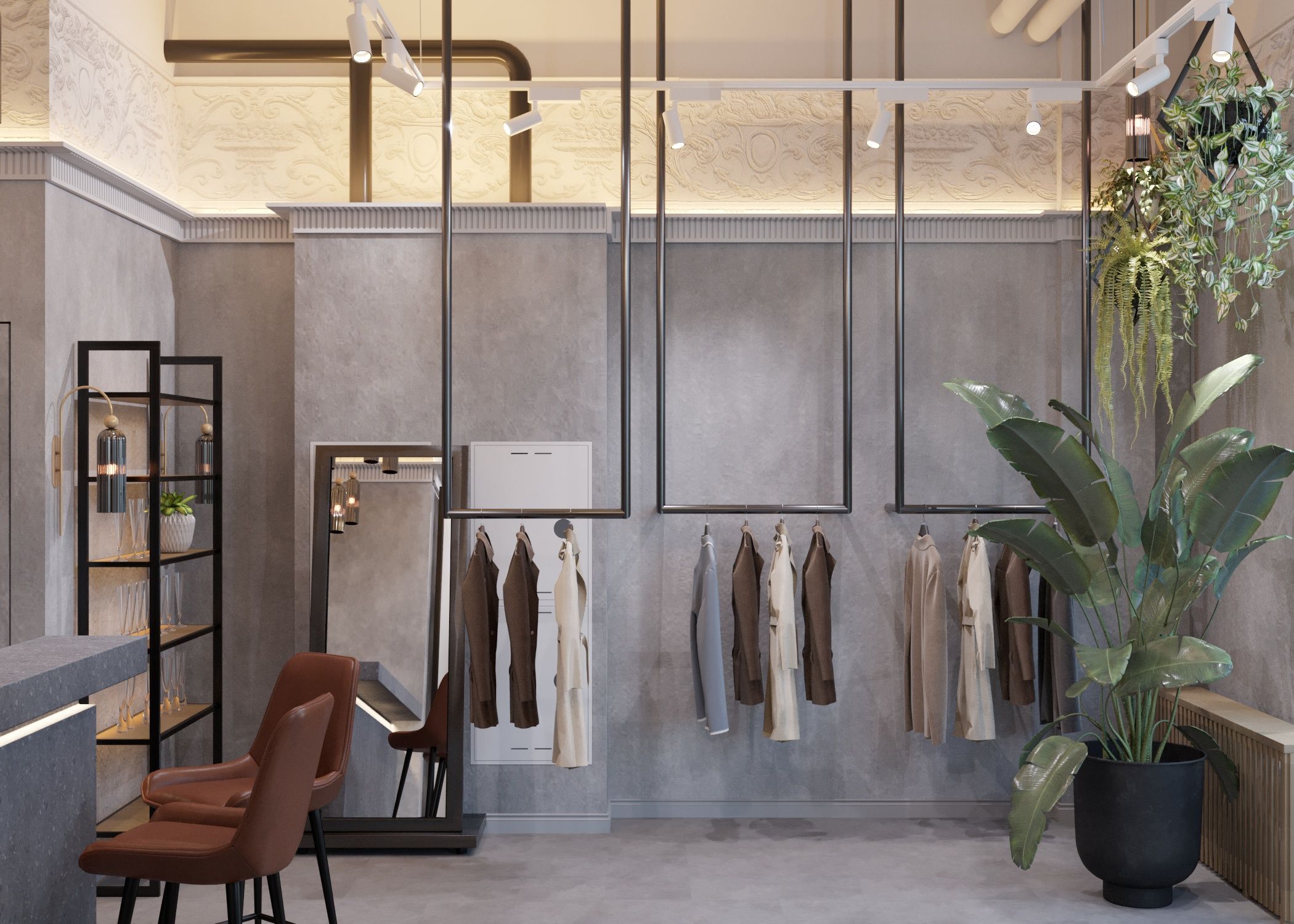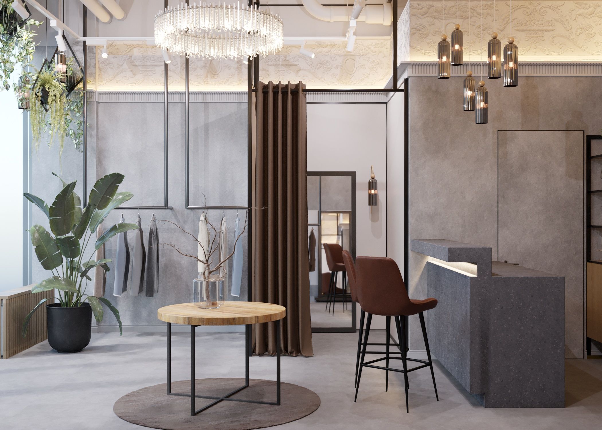The main focus in the design is the gray concrete walls, which serve as an excellent backdrop for the store's products. The walls are adorned with decorative plaster that mimics concrete texture. The display window features an abundance of green plants, while a large crystal chandelier hangs in the center. Along the perimeter of the ceiling, there is an imitation of a sculpted frieze created through photoprinting. Inside the store, there are hanging racks and shelves along the solid walls. The boutique also includes a fitting room and a restroom.