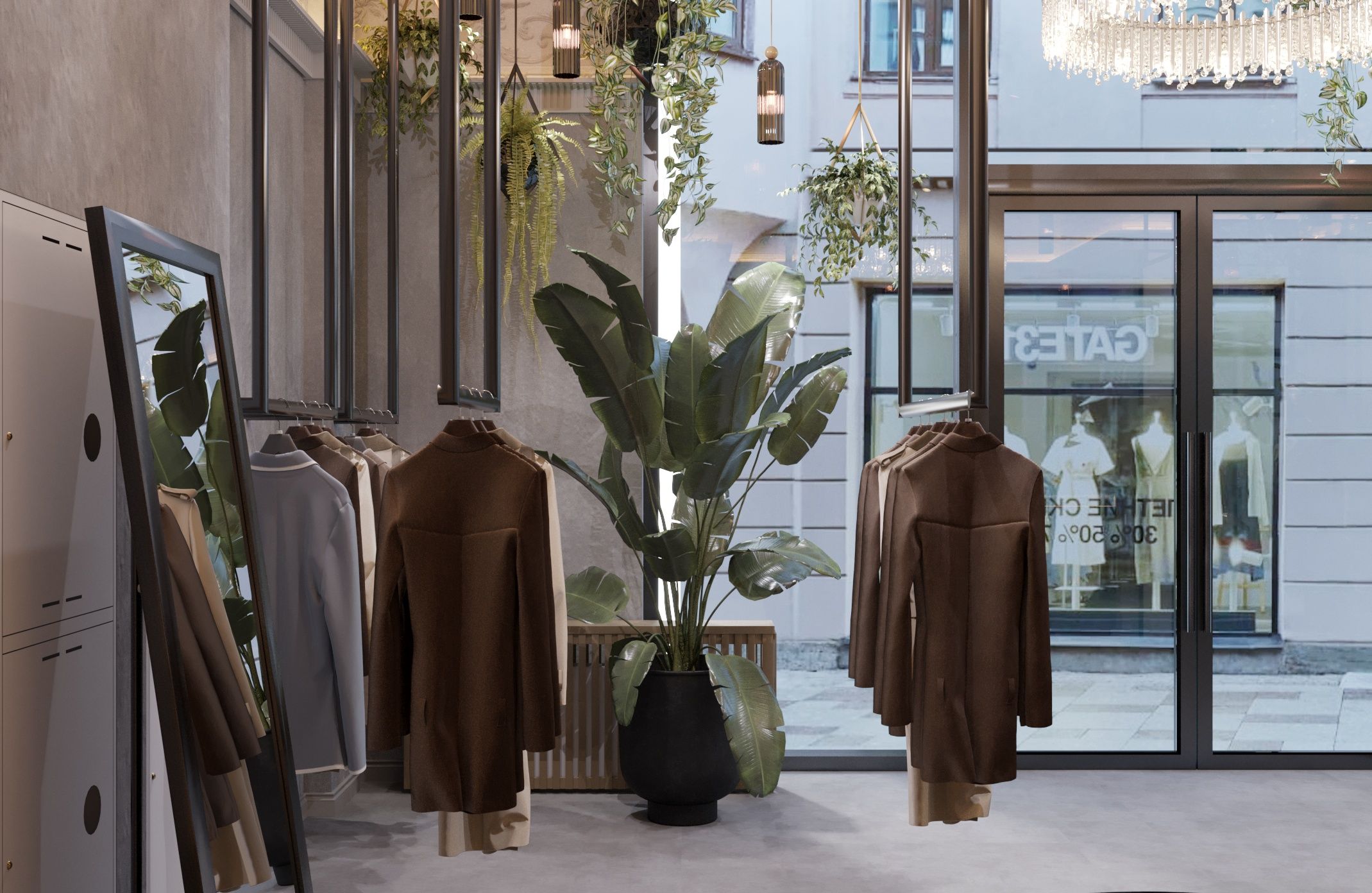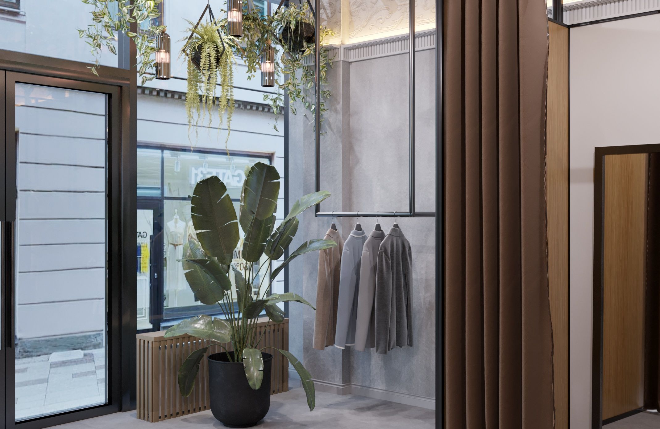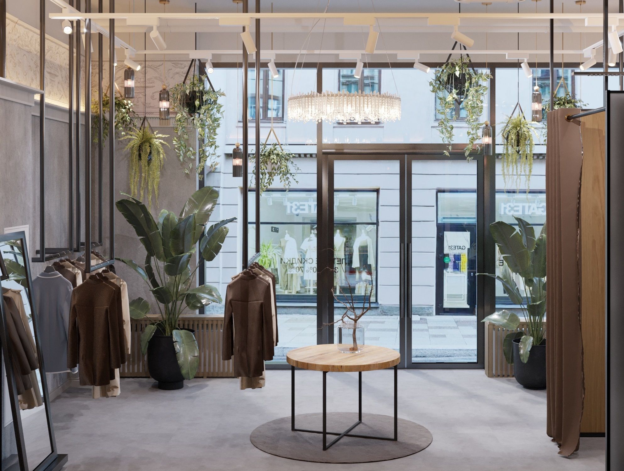 The main focus in the design is the gray concrete walls, which serve as an excellent backdrop for the store's products. The walls are adorned with decorative plaster that mimics concrete texture. The display window features an abundance of green plants, while a large crystal chandelier hangs in the center. Along the perimeter of the ceiling, there is an imitation of a sculpted frieze created through photoprinting. Inside the store, there are hanging racks and shelves along the solid walls. The boutique also includes a fitting room and a restroom.
