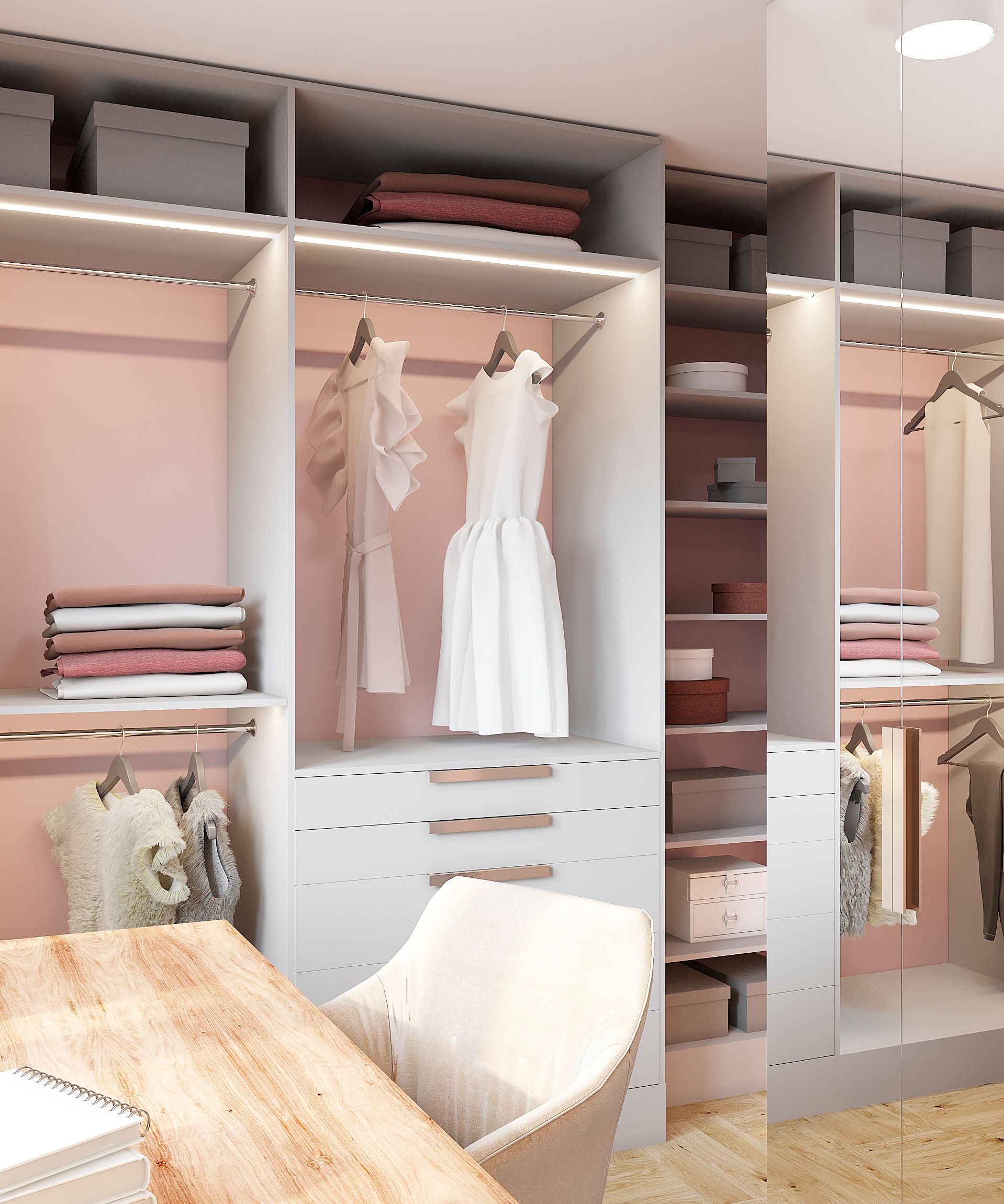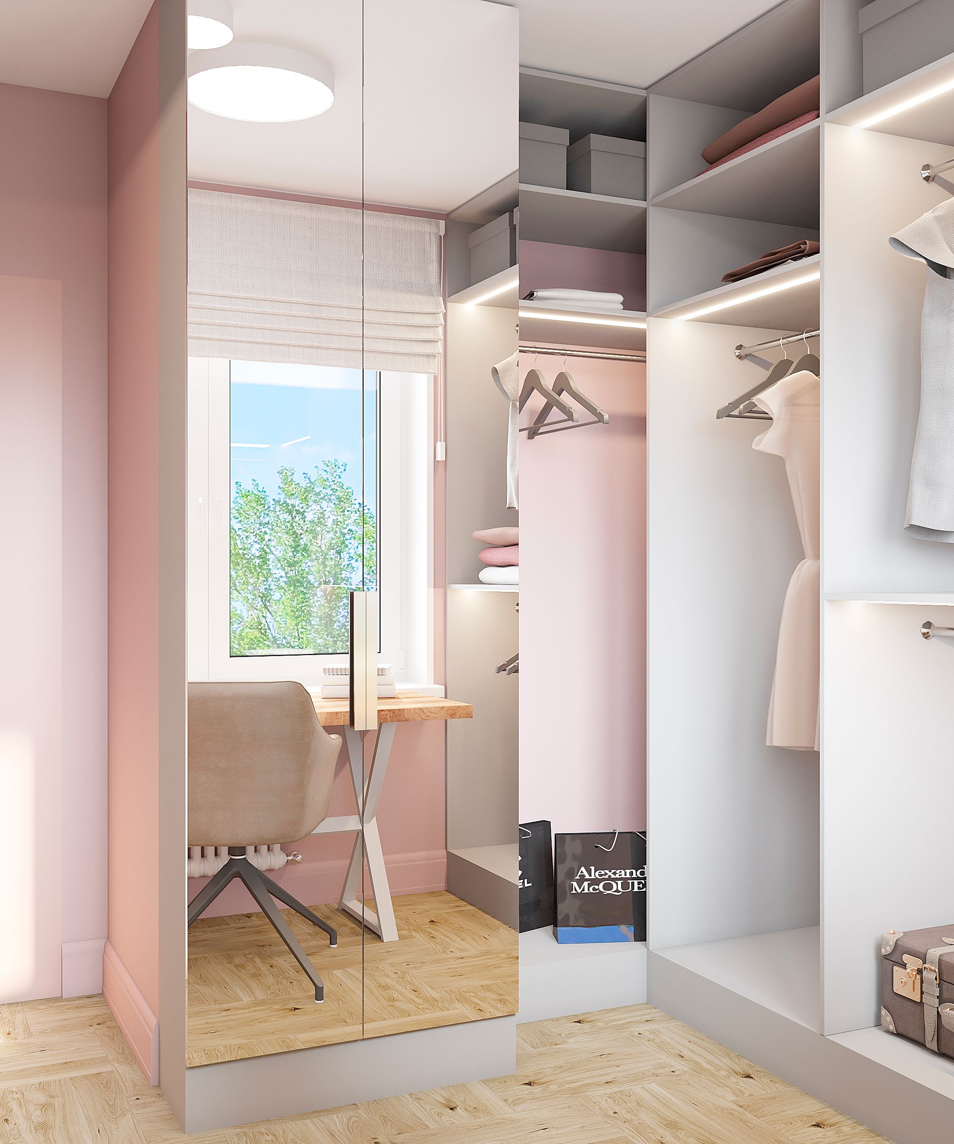 The dressing room with a window is designed for the girl's mother. She engages in handicrafts, sewing, and creates stunning jewelry. Some of the closed cabinets in the dressing room serve as bead storage. The dressing room also accommodates seasonal storage of items and storage of travel suitcases.