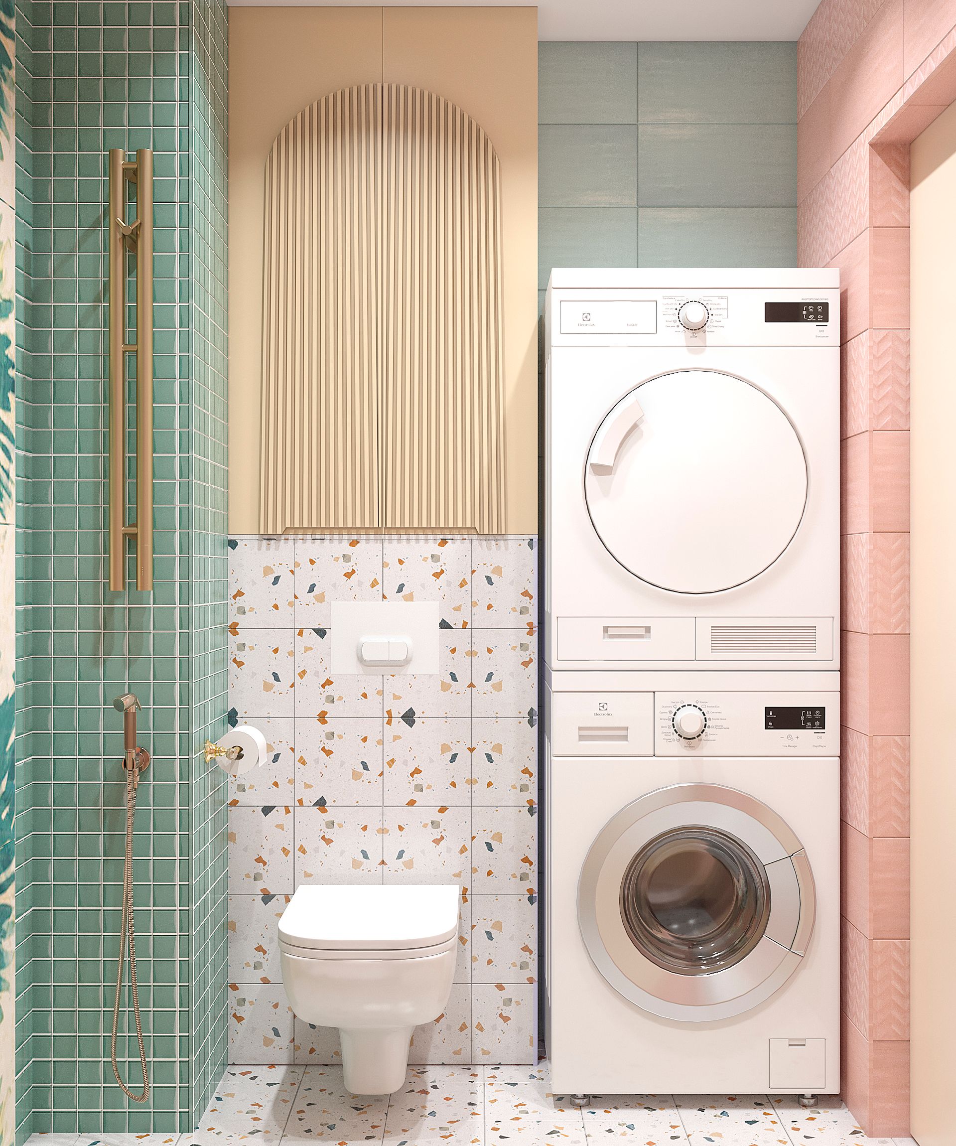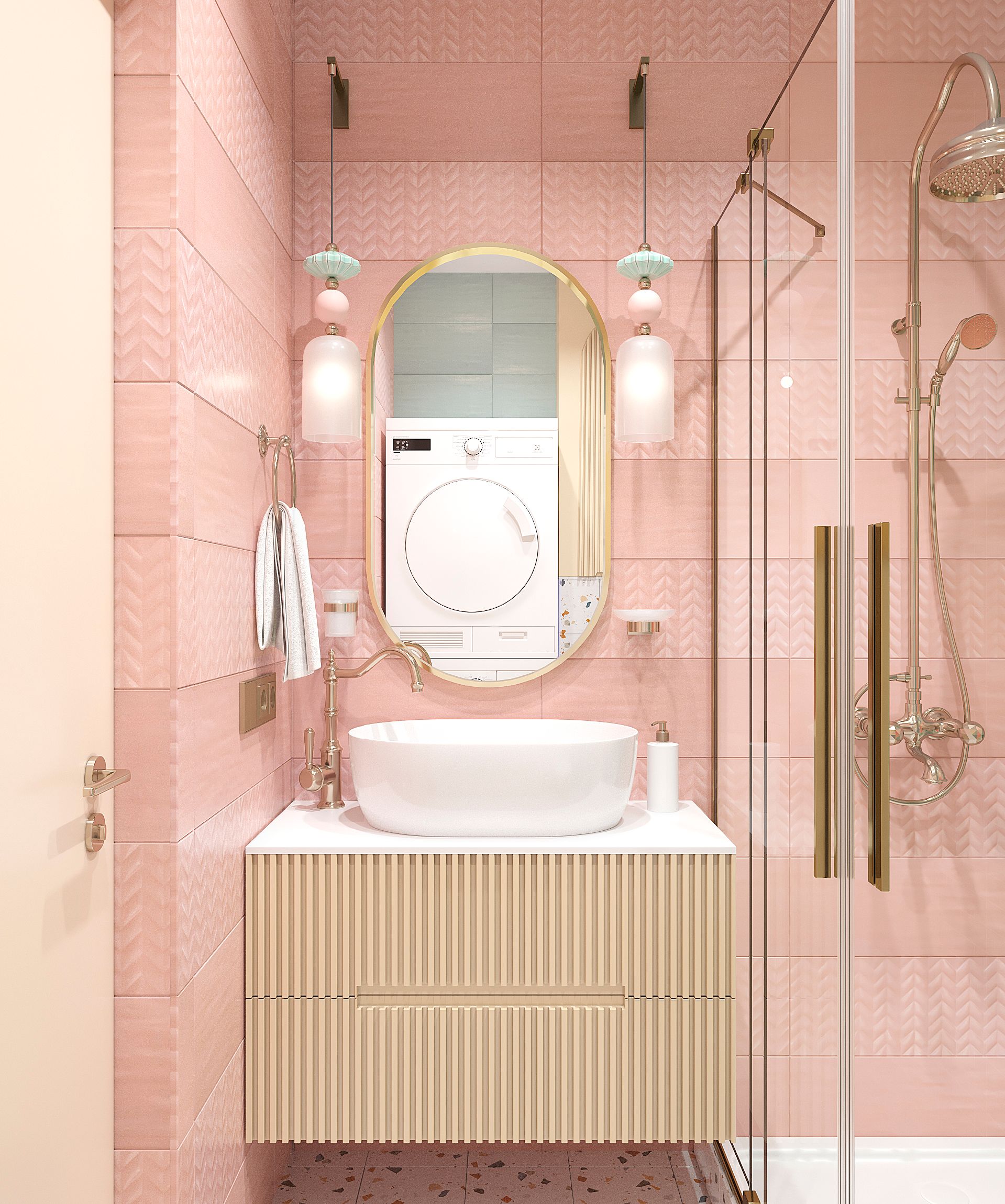 The marshmallow theme continues in the toilet. It is designed in a similar color scheme, using one collection of ceramic tiles. The ceramic panel on the wall with an image of a flamingo in the tropics serves as a decoration and an eye-catching element when entering the toilet. It adds a tropical atmosphere to the toilet. The wall sconces by the mirror also resemble candies.