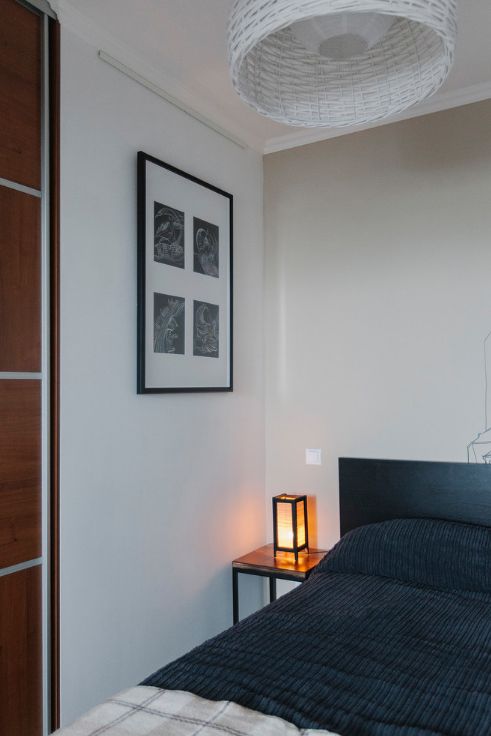 Владелица подбирала многофункциональную мебель для своей квартиры, чтобы максимально использовать пространство. Под диваном есть ящик для хранения постельного белья, а под кроватью с подъемным механизмом хранится коллекция картин, которым не нашлось места на стенах. Дополнительные табуреты используются как прикроватный столик и подставка для цветка.