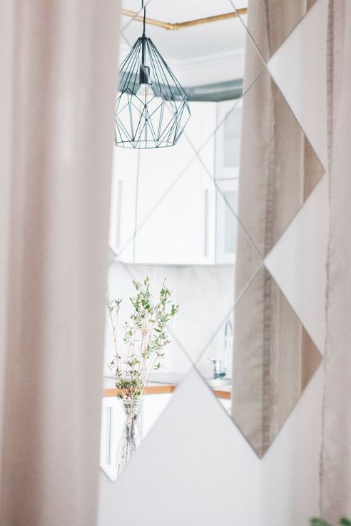 В дополнение к зеркальному панно, которое объединяет пространство между окном и балконной дверью, горшок с традесканцией на монтажном крючке помогает определить границы между кухней-столовой и гостиной.