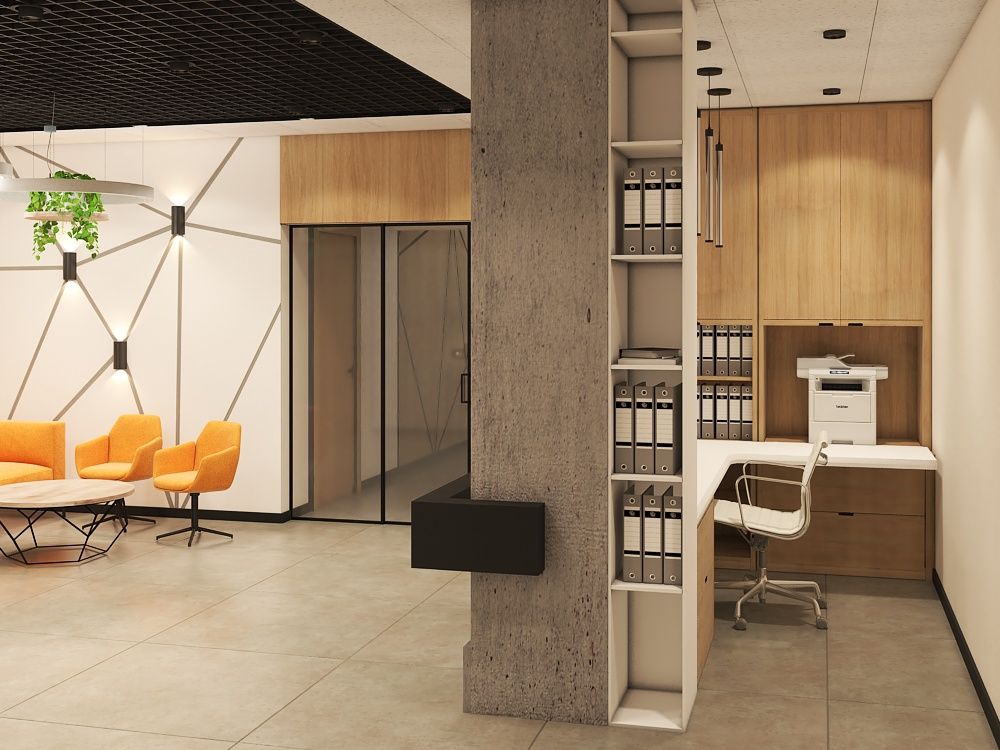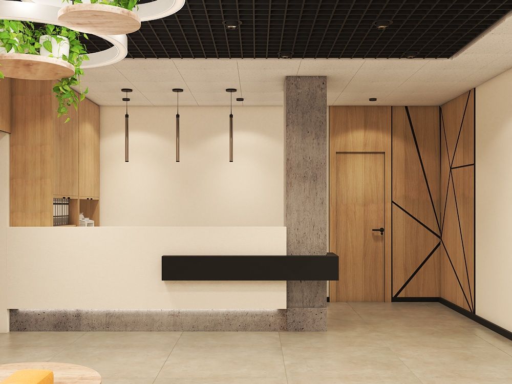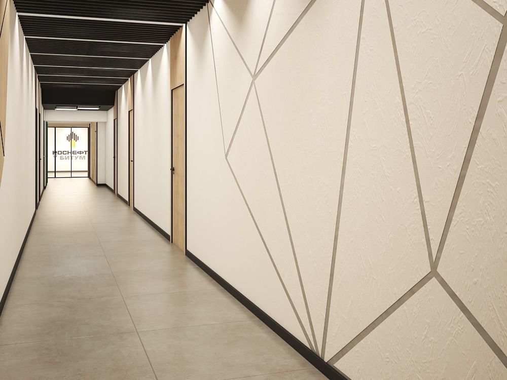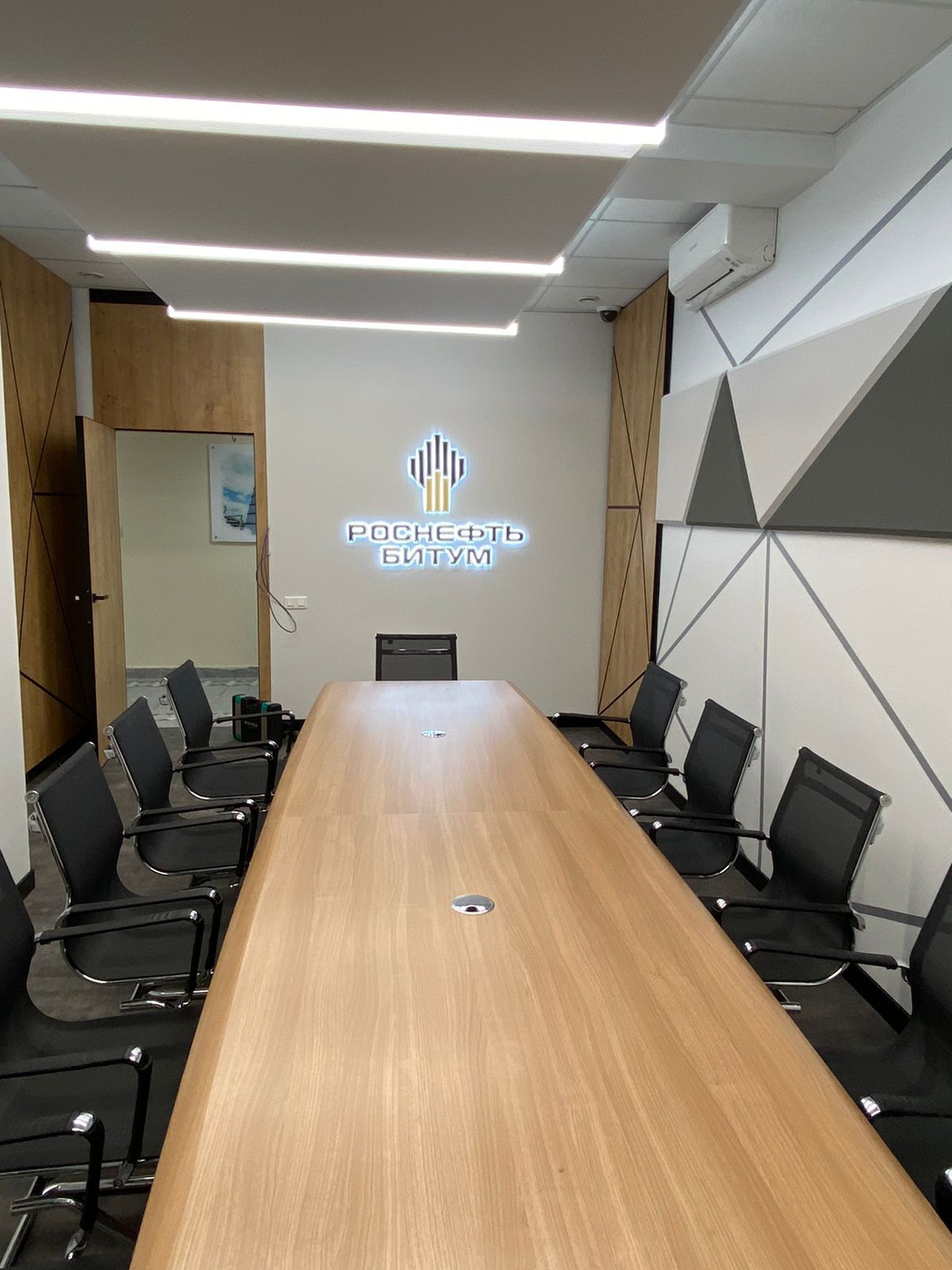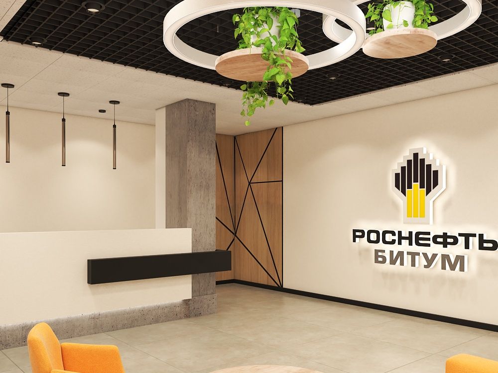 Офис РН-Битум решен в скандинавском стиле, здесь много дерева, бетона и контраста черного и белого. Это яркий офис для приема высокопоставленных гостей компании, проведения онлайн конференций и комфортной работы сотрудников. В дизайне применены шумопоглощающие материалы (потолки, стеновые панели, подвесные акустические конструкции в переговорной) и материалы с высокой износоустойчивостью (напольное покрытие).