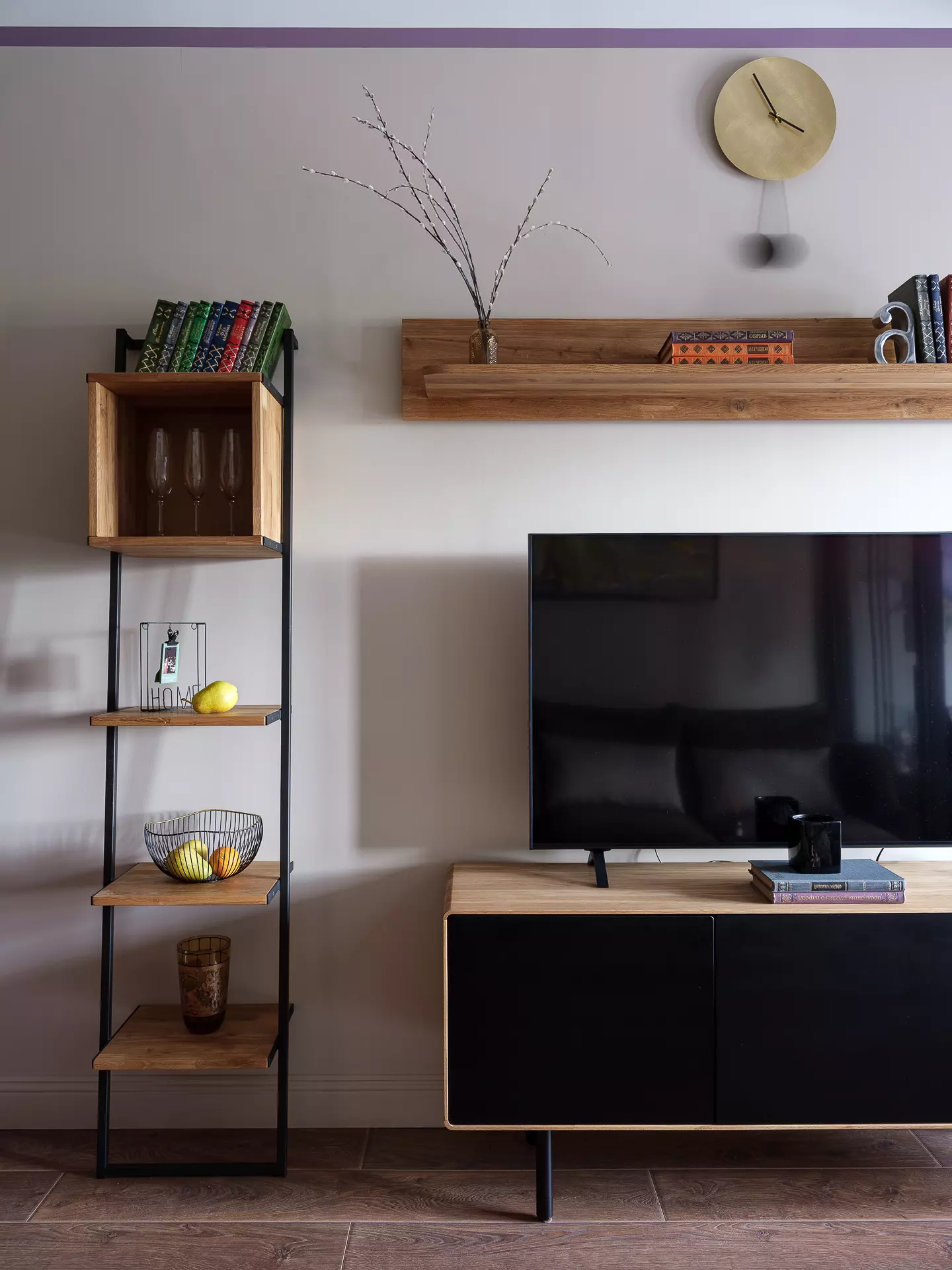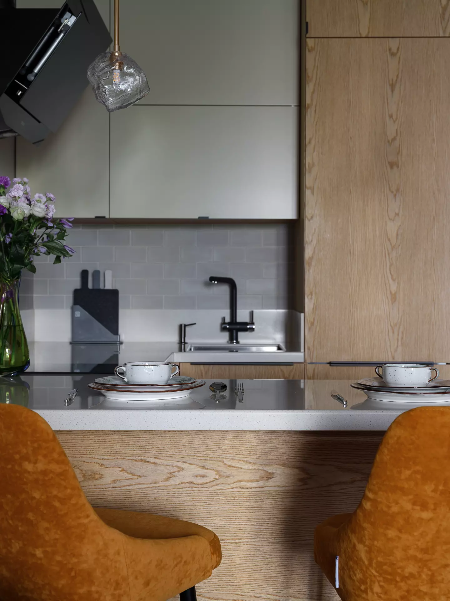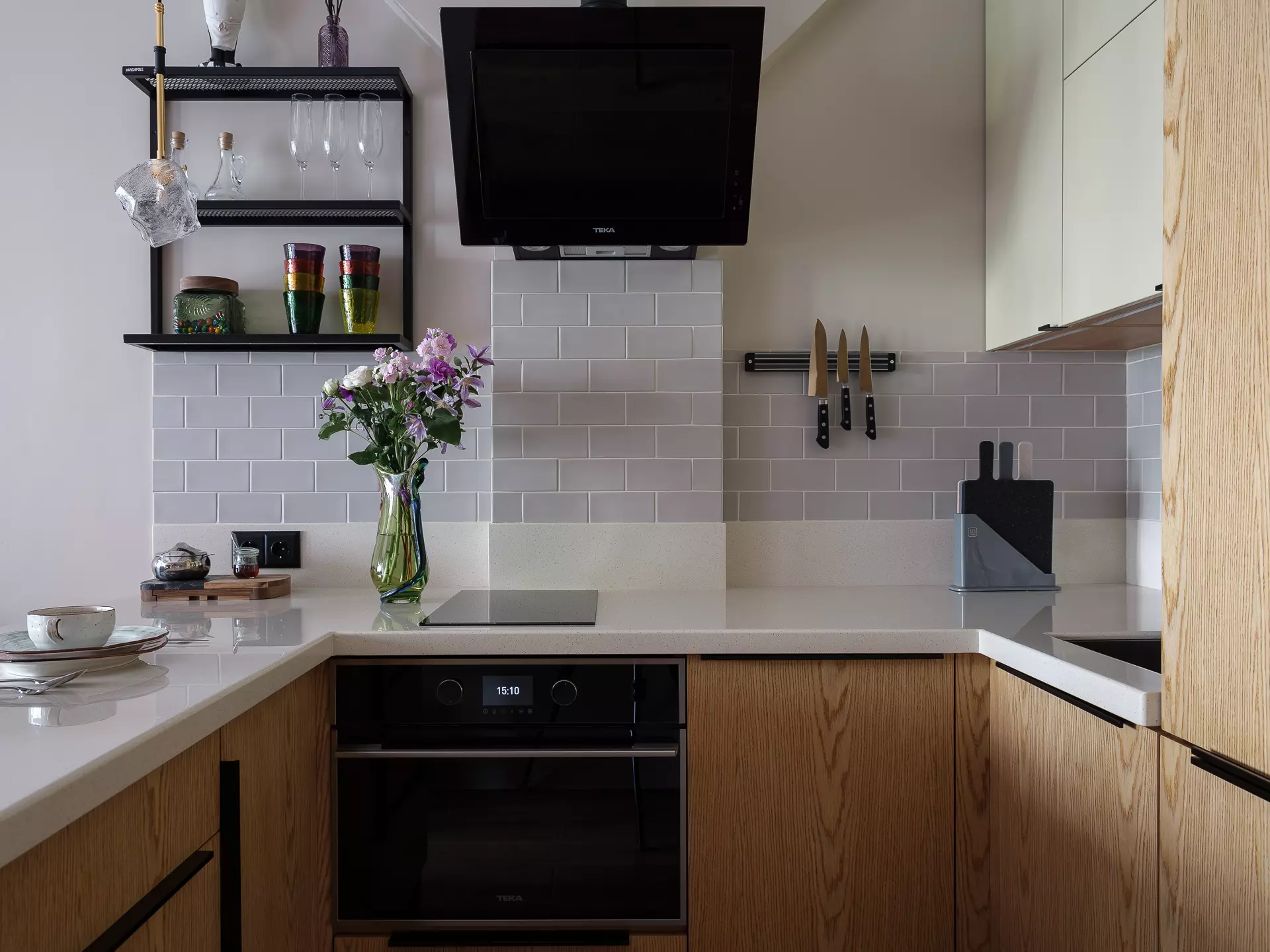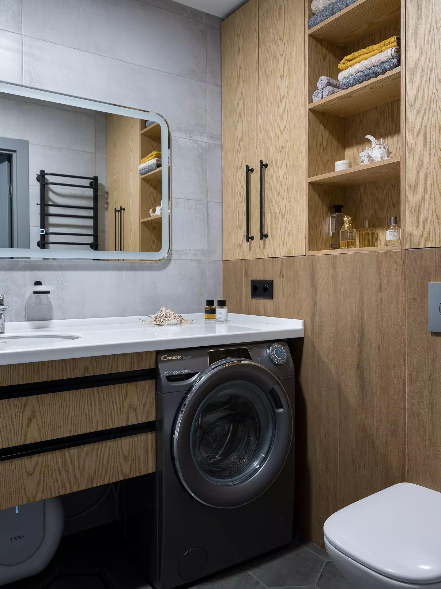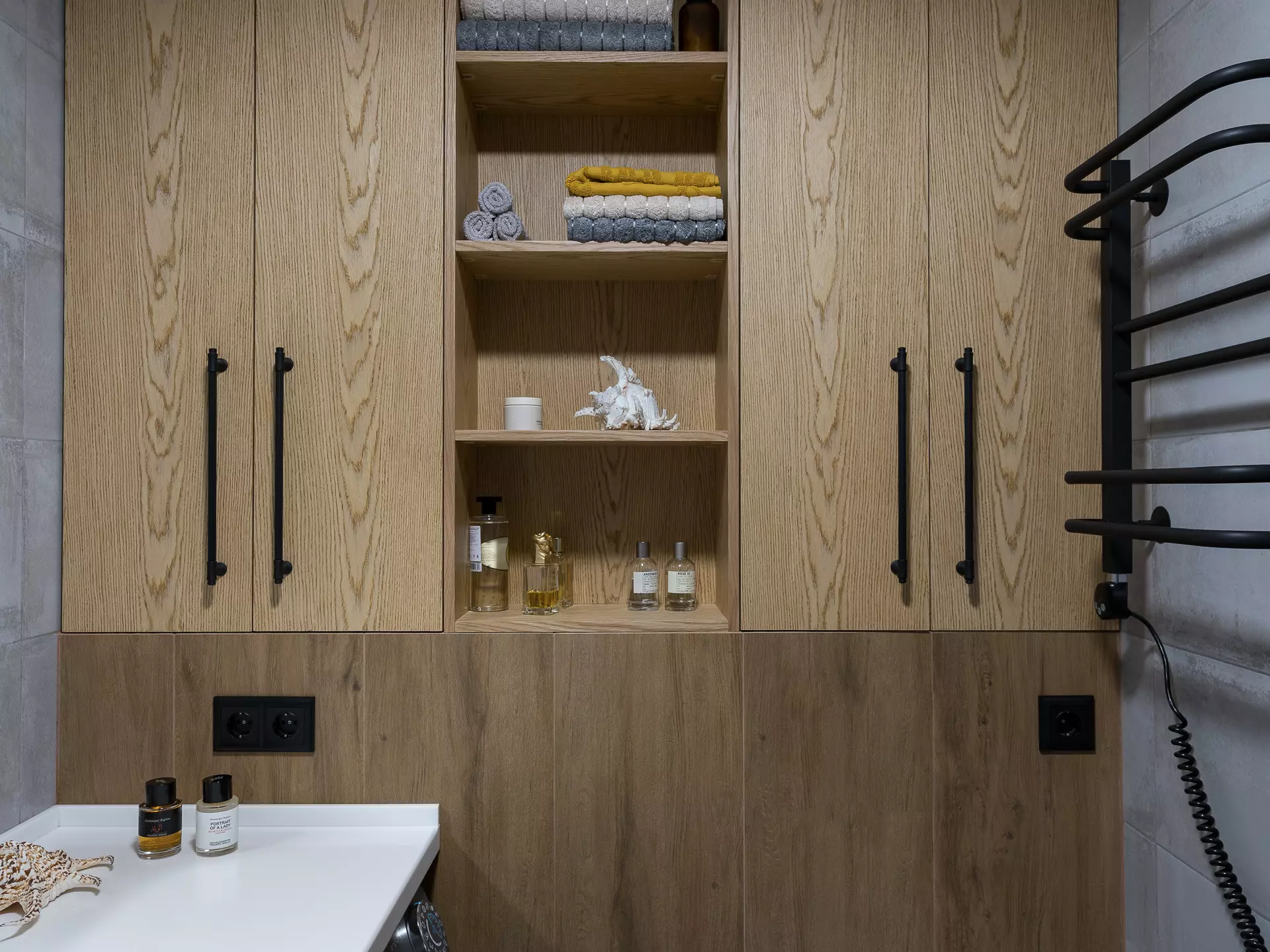 Цвет корпусной мебели мы подбирали чтобы он хорошо сочетался с основной цветовой гаммой и подходит с серой плитке застройщика, которую мы решили не менять. Цвет дубового шпона идеально сочетается с серым.