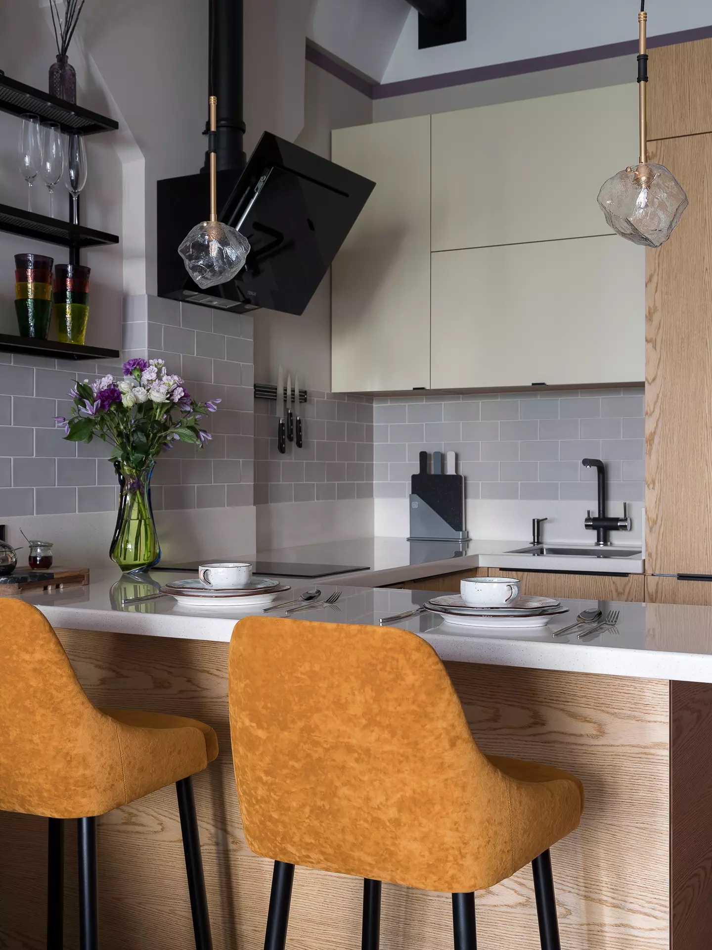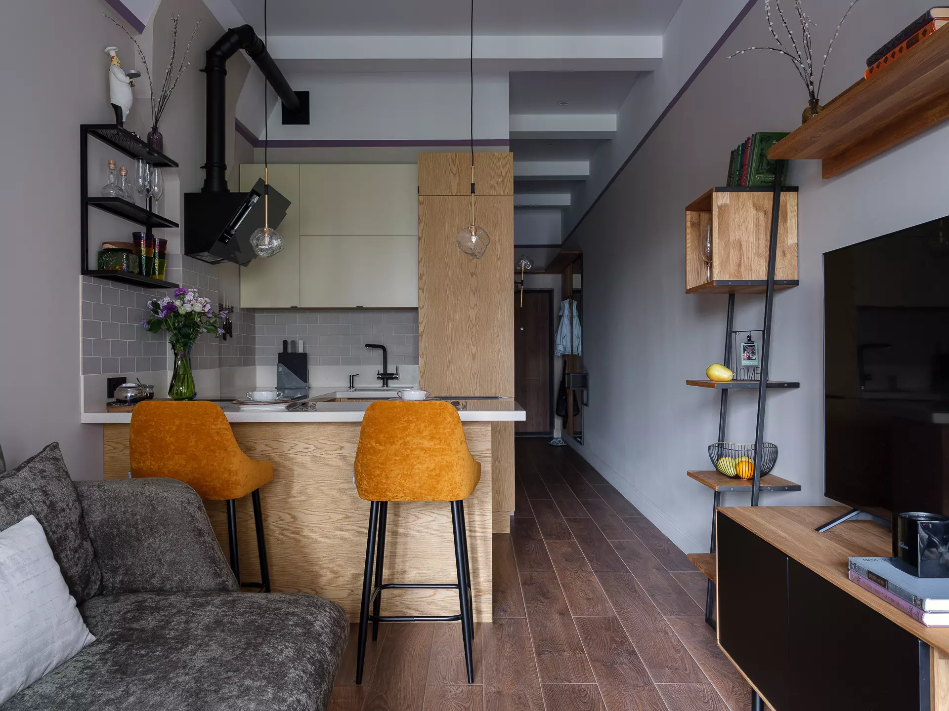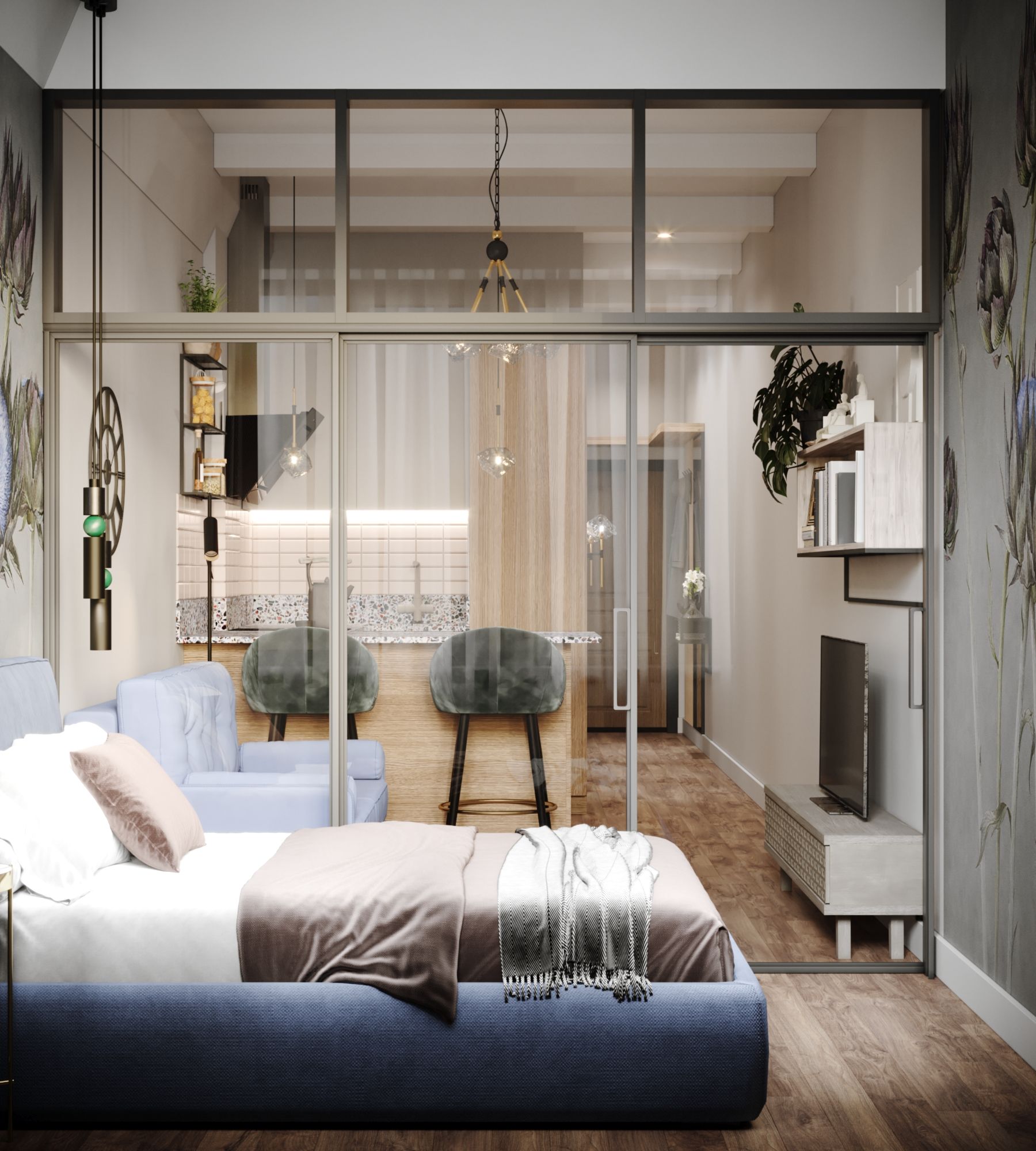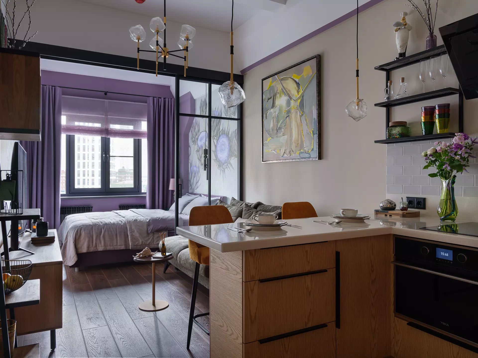Помещения разместились анфиладой: при входе в апартамент расположена вместительная гардеробная-кладовая, далее ванная и мы сразу попадаем на кухню. На кухне расположен полуостров, который является обеденным столом и одновременно объединяет кухню с гостиной. Зона спальни отделена стеклянной перегородкой. Весь апартамент - это одно большое помещение, функционально поделенное на зоны. Отсутствие стен между зонами не позволяет назвать кухню маленькой. Зона кухни небольшая, но тем, что она объединена с гостиной образуется свободное дышащее пространство.