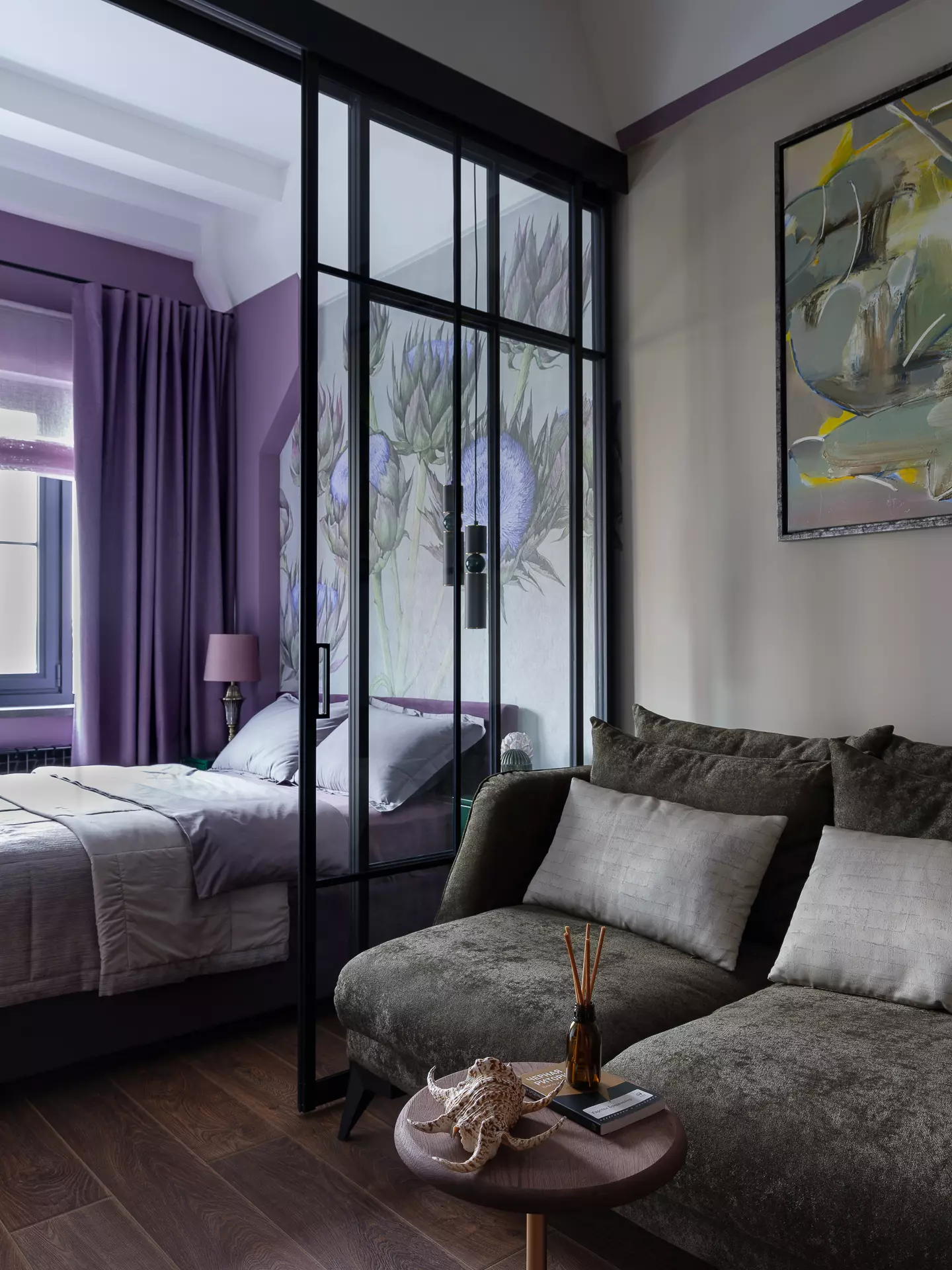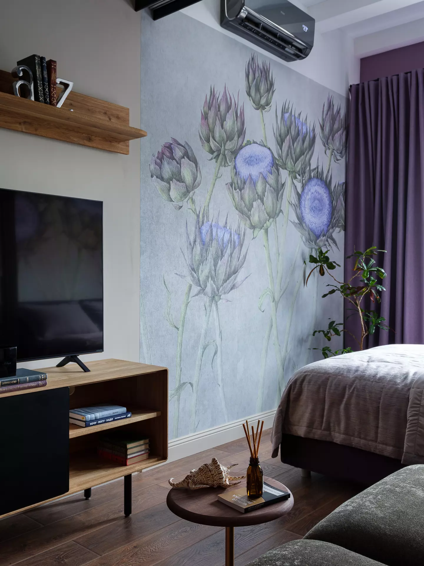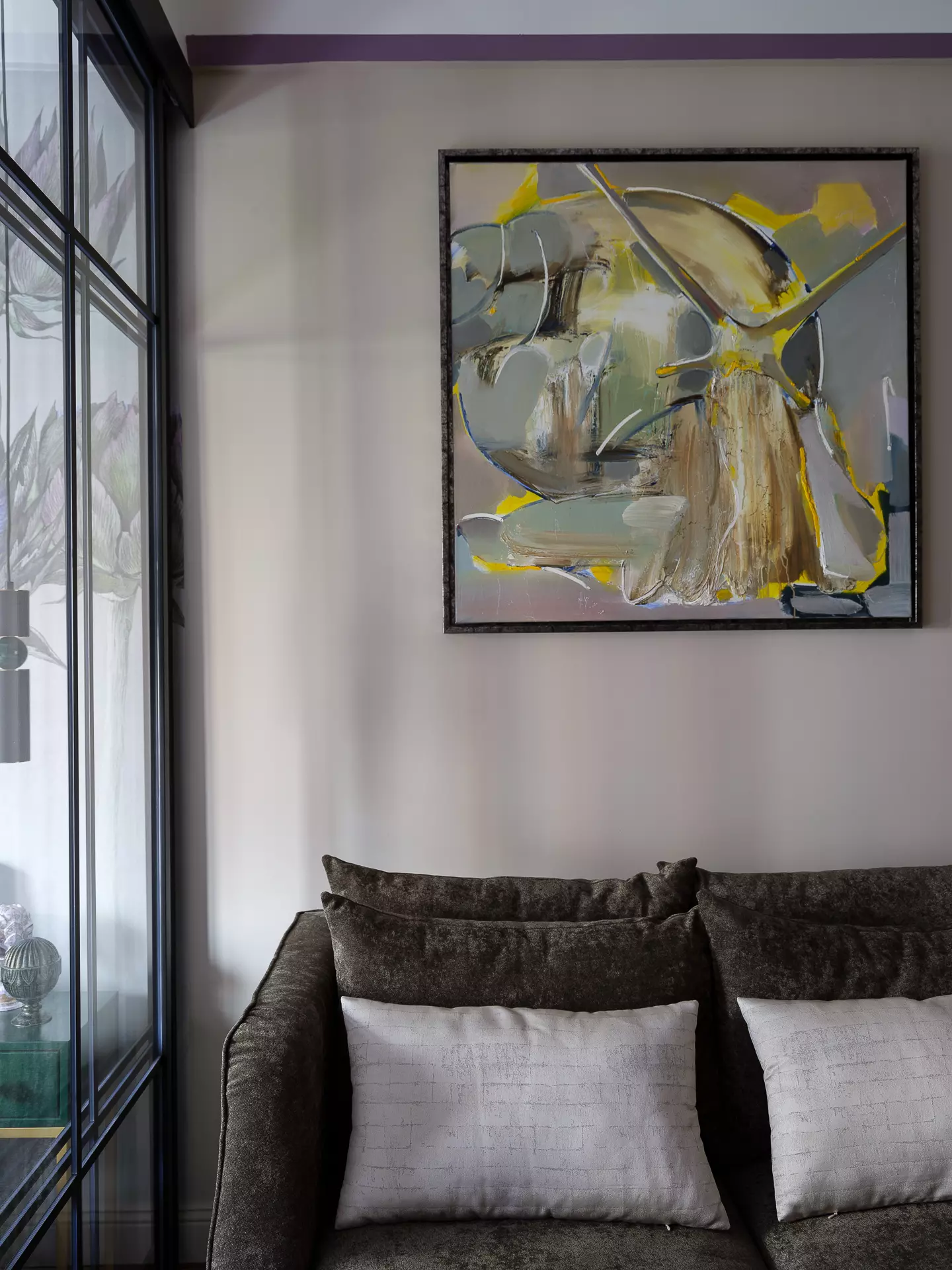 Гигантские цветы выбраны не случайно для небольшого пространства. Они создают необходимый контраст и уют и как будто наоборот увеличивают спальню. Это прием был выбран нарочно. Аметистовая полоса идет по периметру всего апартамента, где основной цвет стены бежево-серый. Апартамент вытянутый и небольшой. Этот декоративный прием визуально уменьшает высоту апартамента, делая его пропорции более сомасштабнее человеку. Помещения-колодцы оставляют после себя очень давящее неприятное ощущение. Зеленый диван отлично сочетается с зелеными артишоками и дает ощущение, что мы находимся где то на цветочной поляне. Оранжевые полубарные кресла отлично смотрятся с песочным цветом шпона дуба на кухне. Мебель в гостиной сделана из массива дуба. Далее мы добавили контрастного аметисту желтого в виде картины специально купленной для этого интерьера у художника Ивана Федорова. Картина”Улитка” сочетает в себе цвета интерьера, а также является альтерэго хозяйки интерьера, по ее словам. Образ улитки совпал с настроением и переживаниями хозяйки, когда она ее увидела. С первого же взгляда она поняла, что картину нужно купить. Мы планировали завершить ремонт за несколько месяцев, а в результате основательно делали его год со всеми перепитиями, сменой строительной бригады, ликвидацией потопа и тд.