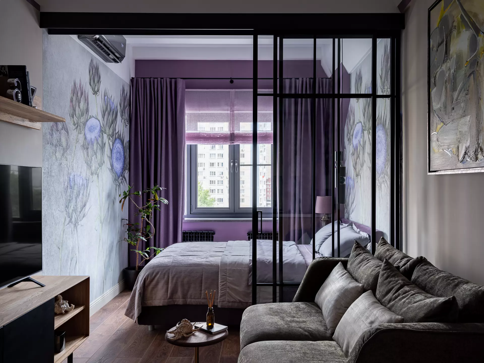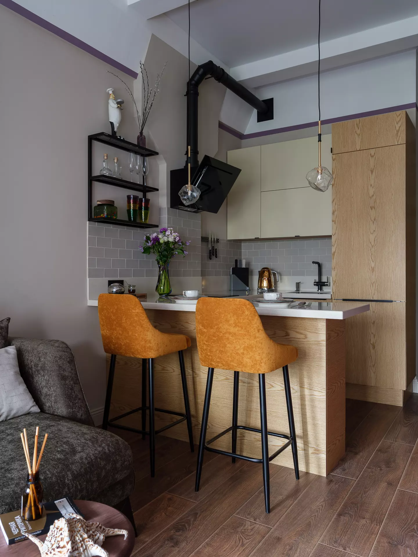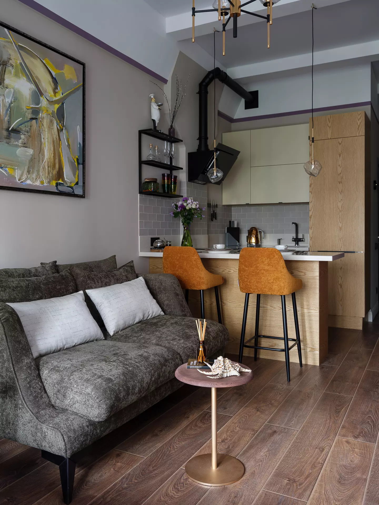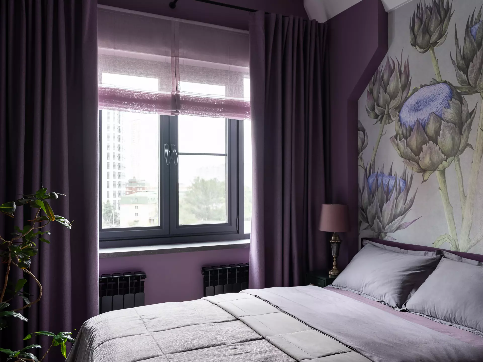 Гигантские цветы выбраны не случайно для небольшого пространства. Они создают необходимый контраст и уют и как будто наоборот увеличивают спальню. Это прием был выбран нарочно. Аметистовая полоса идет по периметру всего апартамента, где основной цвет стены бежево-серый. Апартамент вытянутый и небольшой. Этот декоративный прием визуально уменьшает высоту апартамента, делая его пропорции более сомасштабнее человеку. Помещения-колодцы оставляют после себя очень давящее неприятное ощущение. Зеленый диван отлично сочетается с зелеными артишоками и дает ощущение, что мы находимся где то на цветочной поляне. Оранжевые полубарные кресла отлично смотрятся с песочным цветом шпона дуба на кухне. Мебель в гостиной сделана из массива дуба. Далее мы добавили контрастного аметисту желтого в виде картины специально купленной для этого интерьера у художника Ивана Федорова. Картина”Улитка” сочетает в себе цвета интерьера, а также является альтерэго хозяйки интерьера, по ее словам. Образ улитки совпал с настроением и переживаниями хозяйки, когда она ее увидела. С первого же взгляда она поняла, что картину нужно купить. Мы планировали завершить ремонт за несколько месяцев, а в результате основательно делали его год со всеми перепитиями, сменой строительной бригады, ликвидацией потопа и тд.