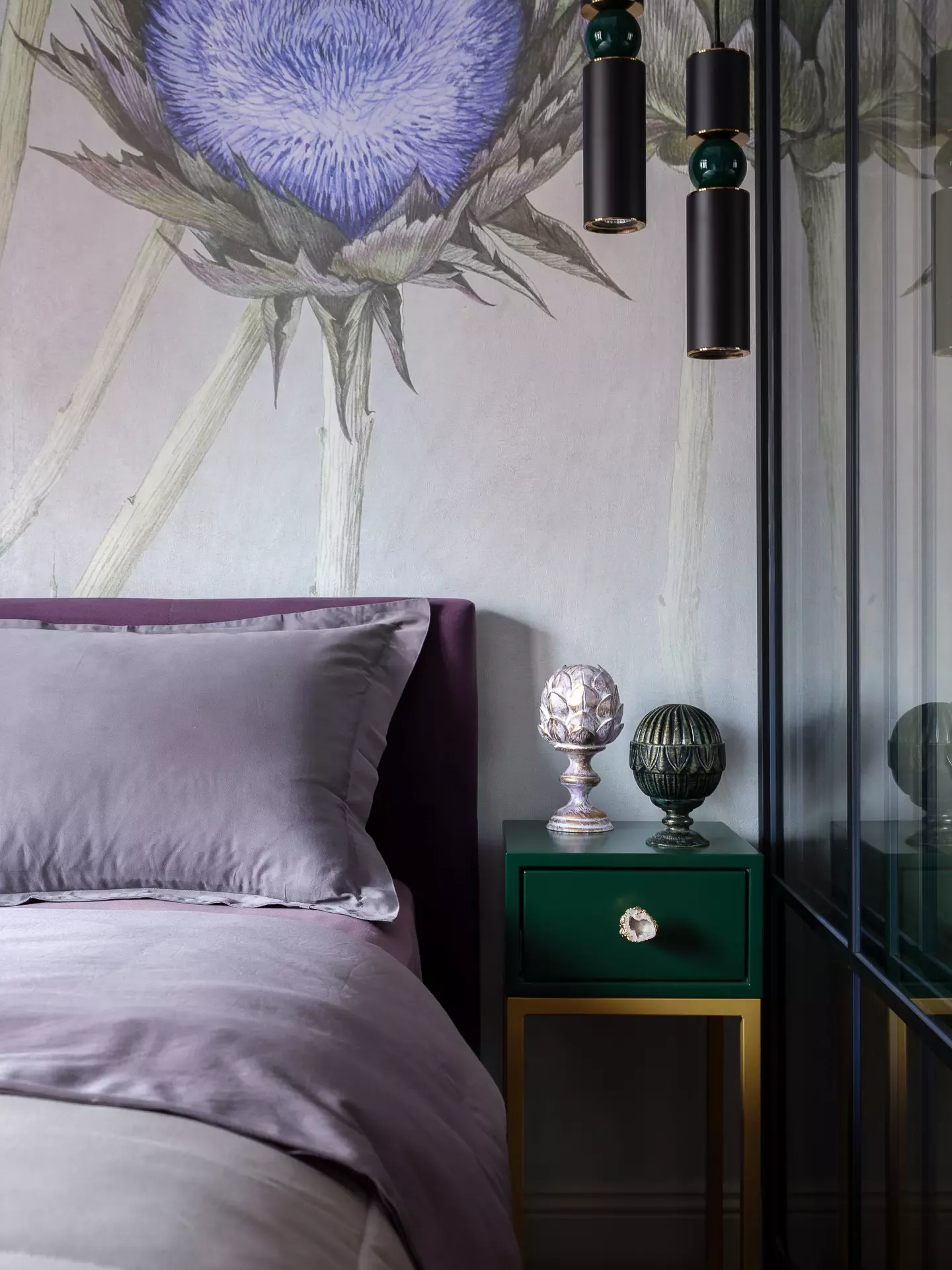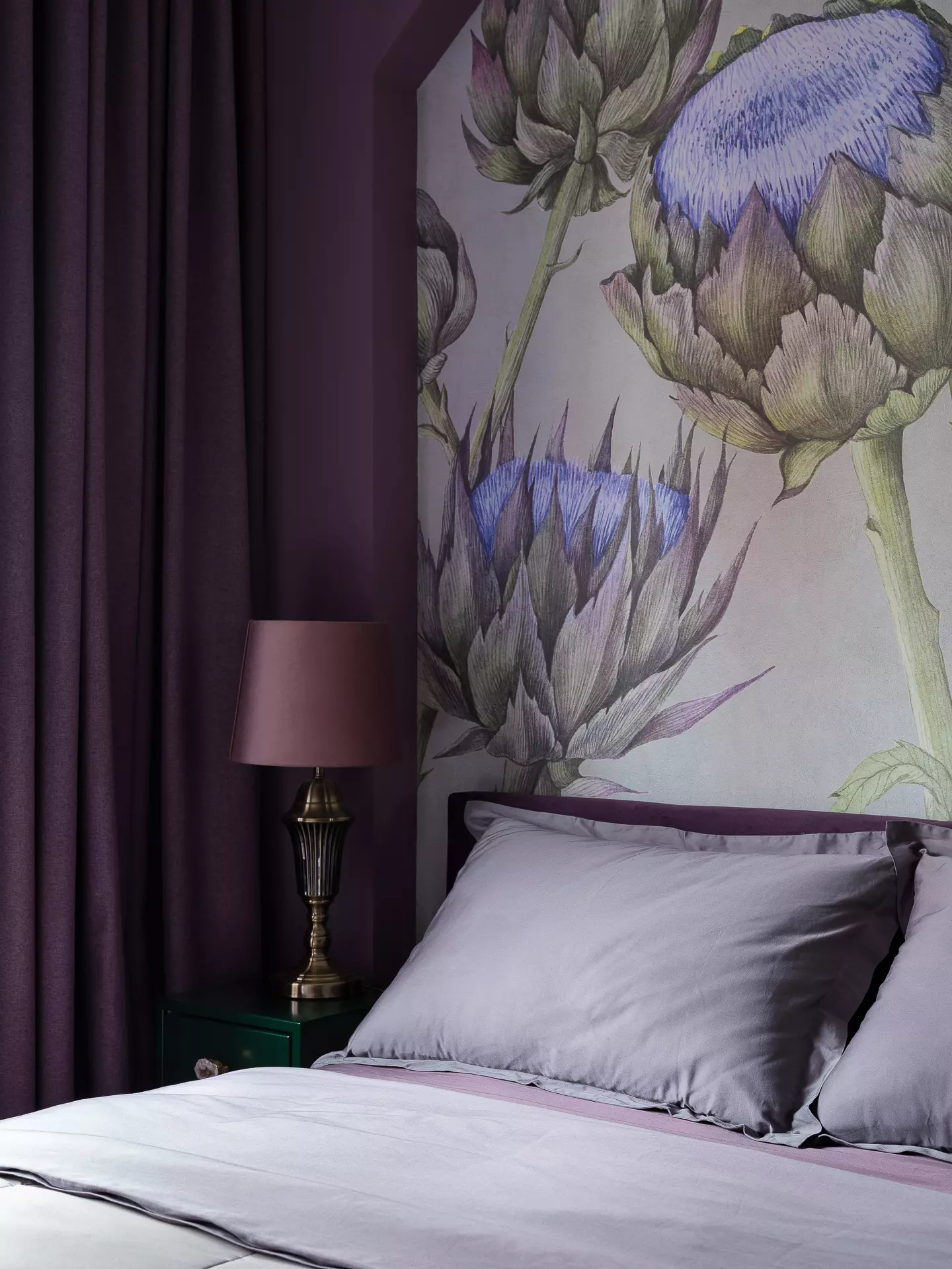 Мы хотели создать эффект цветочной поляны. Цветовая палитра этого интерьера из необычных насыщенных цветов: розово-фиолетового, зеленого, желтого, песочного и оранжевого. Бросается в глаза цвет аметиста - сиренево-розовый, а приятный бежево-серый базовый цвет служит базой. Им покрашен коридор и кухня-гостиная. Аметист мы использовали в спальне, чтобы добавить его к акцентным фрескам с изображениями гигантских артишоков. Чуть-чуть этого цвета есть на самих цветах.