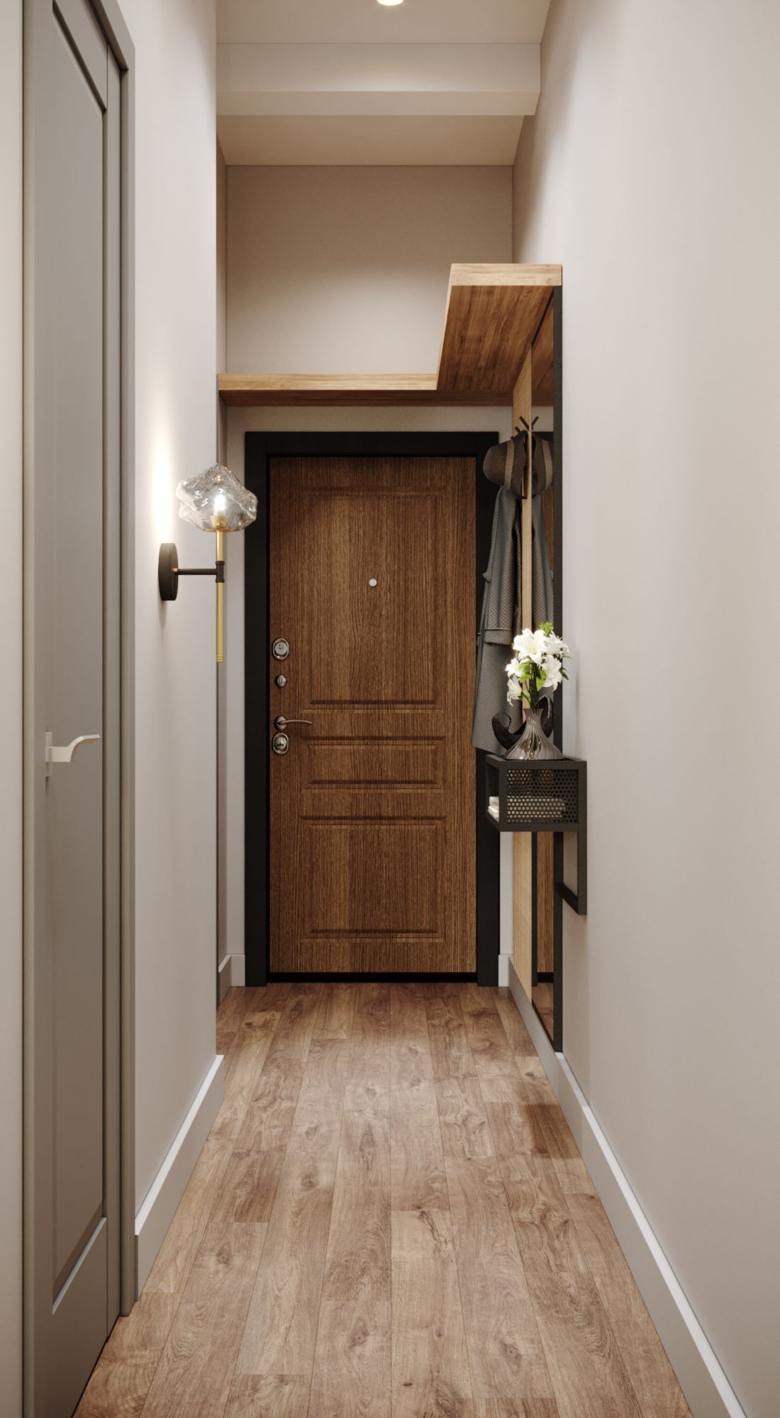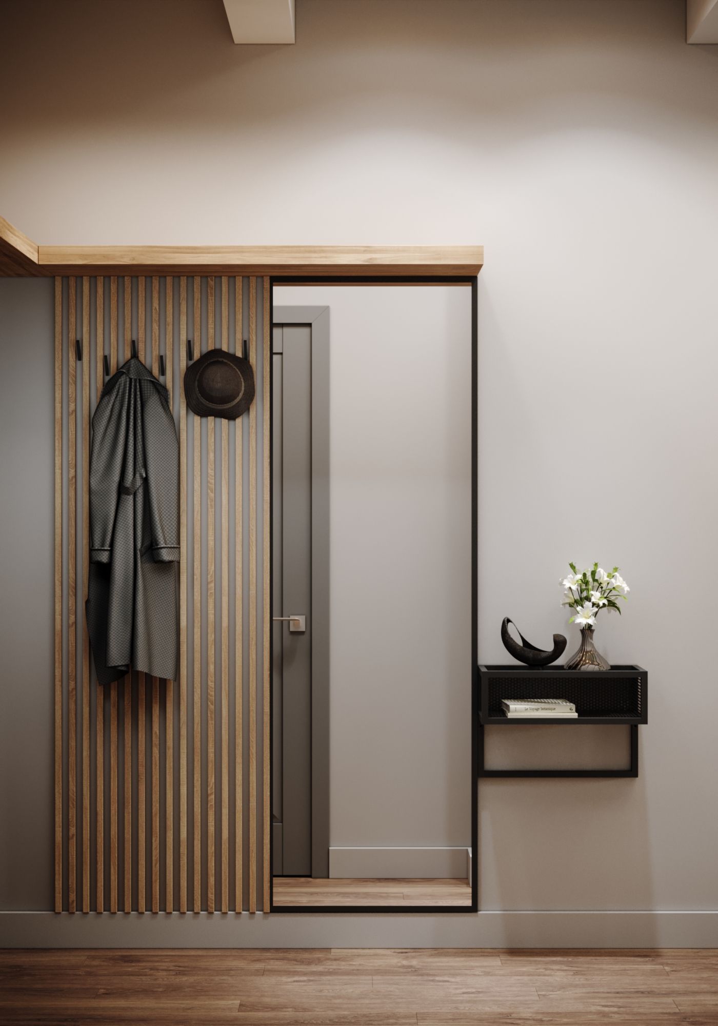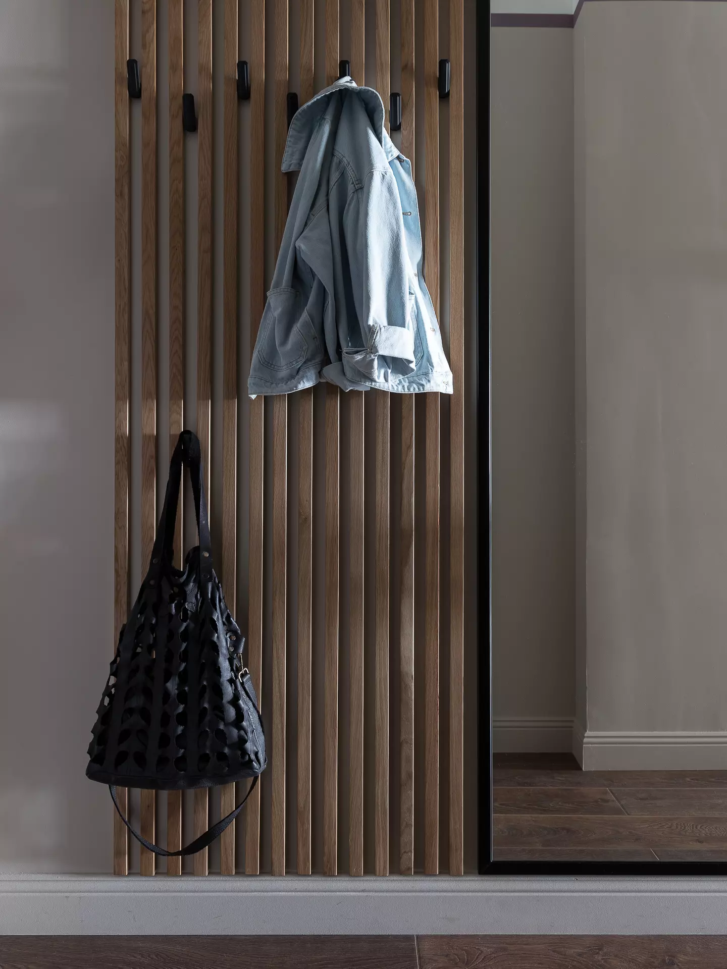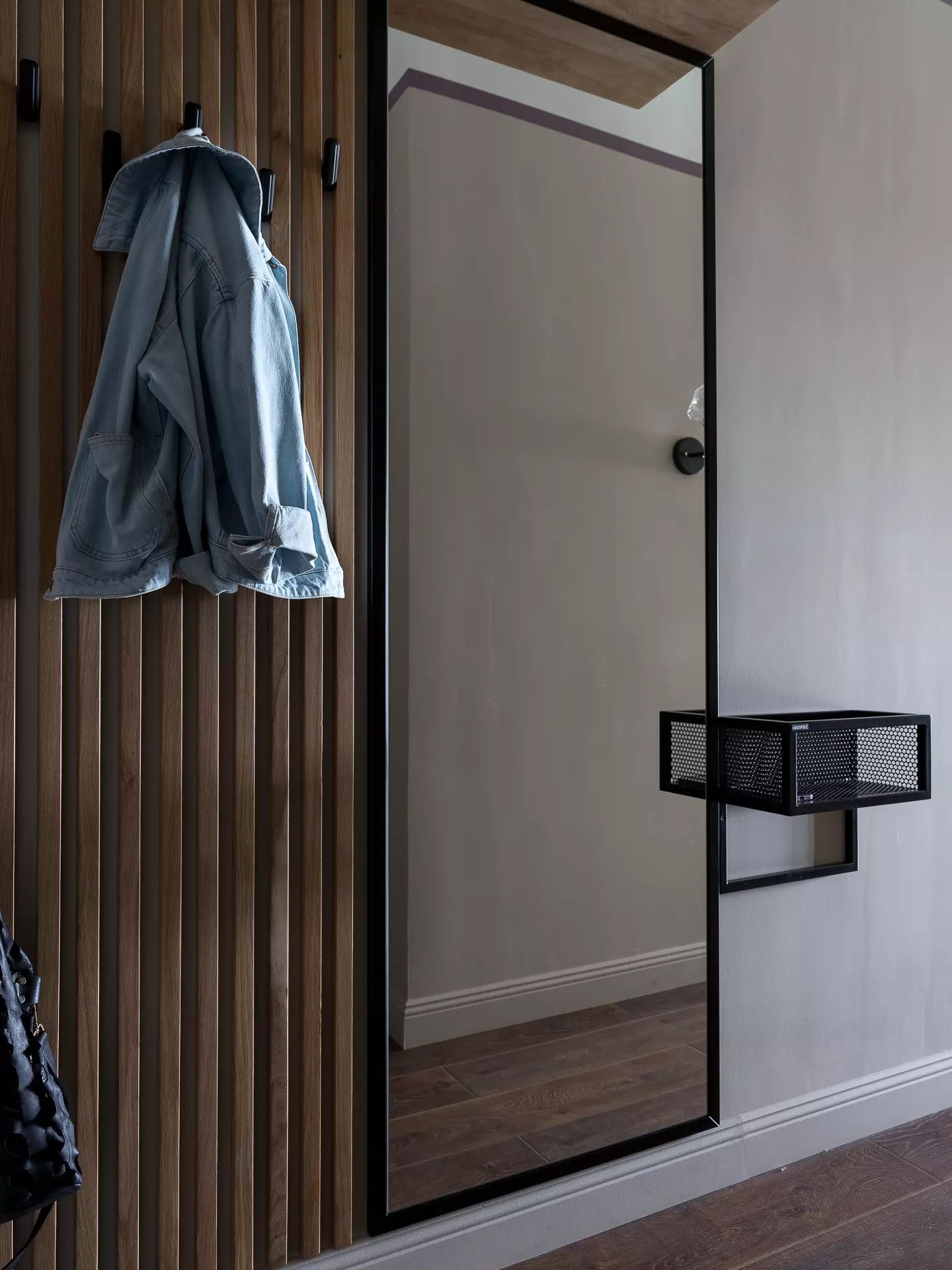 Гардеробная система разместилась в кладовой-гардеробной. При входе в самом коридоре мы разместили евро-раздевалку с открытыми крючками, чтобы повесить верхнюю одежду или сумку. Разместили зеркало в рост, чтобы можно было смотреться целиков - это обязательное требование для отелей, которые знают все о человеческом комфорте. Также рядом с зеркалом разместилась навесная тумба для ключей.