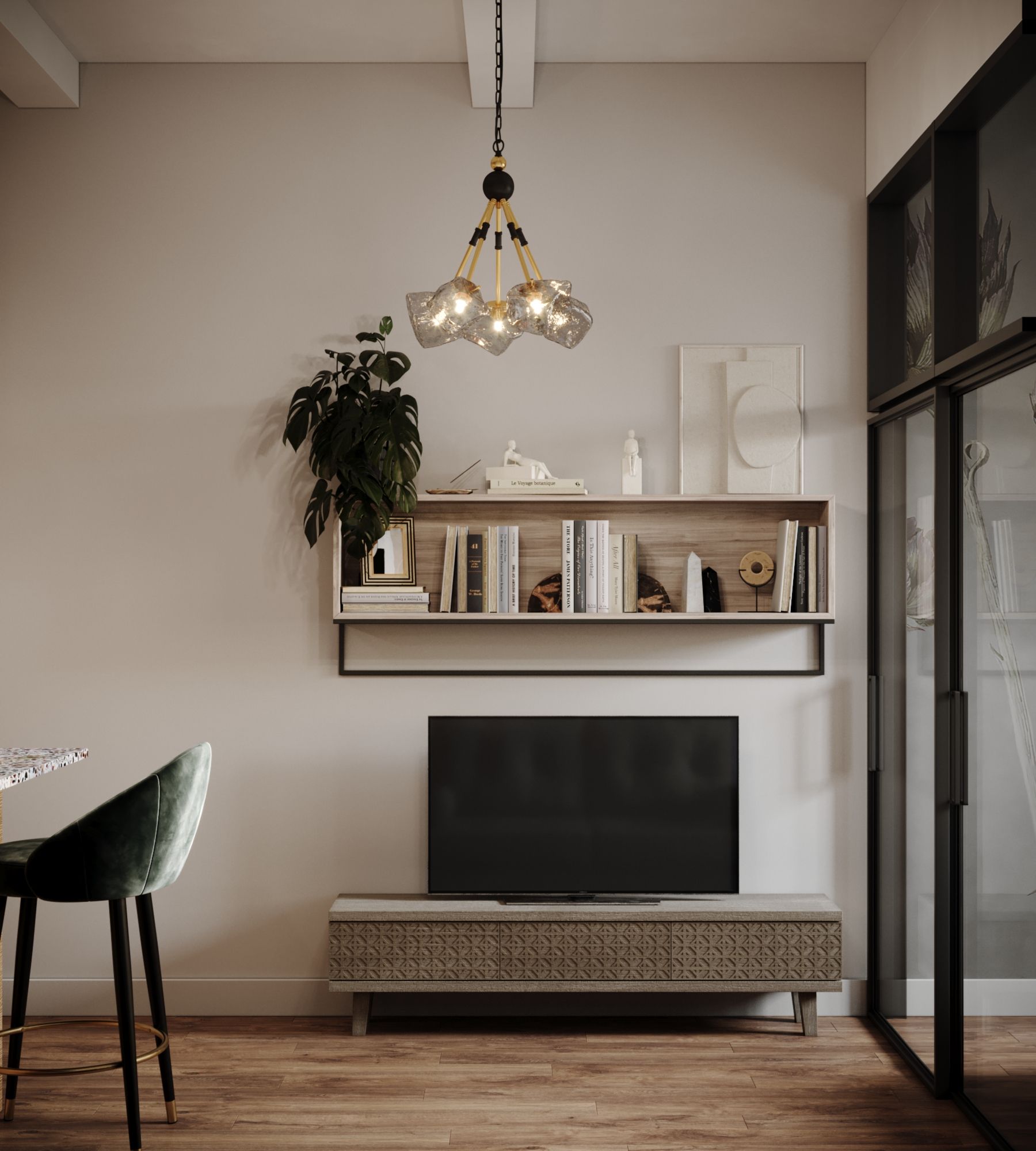 В каждой зоне размещены световые акценты и выведен свой свет. В коридоре мы добавили два бра слева/справа от двери в ванную. Бра интересной формы, напоминающей кубики льда. На кухне мы сделали акцент над столом в виде двухподвесов с теми же кубиками льда. В гостиной акцентная “ледяная” люстра. Плюсом в этих помещениях идет встроенный верхний свет, если хочется поярче. У кухни есть подсветка.