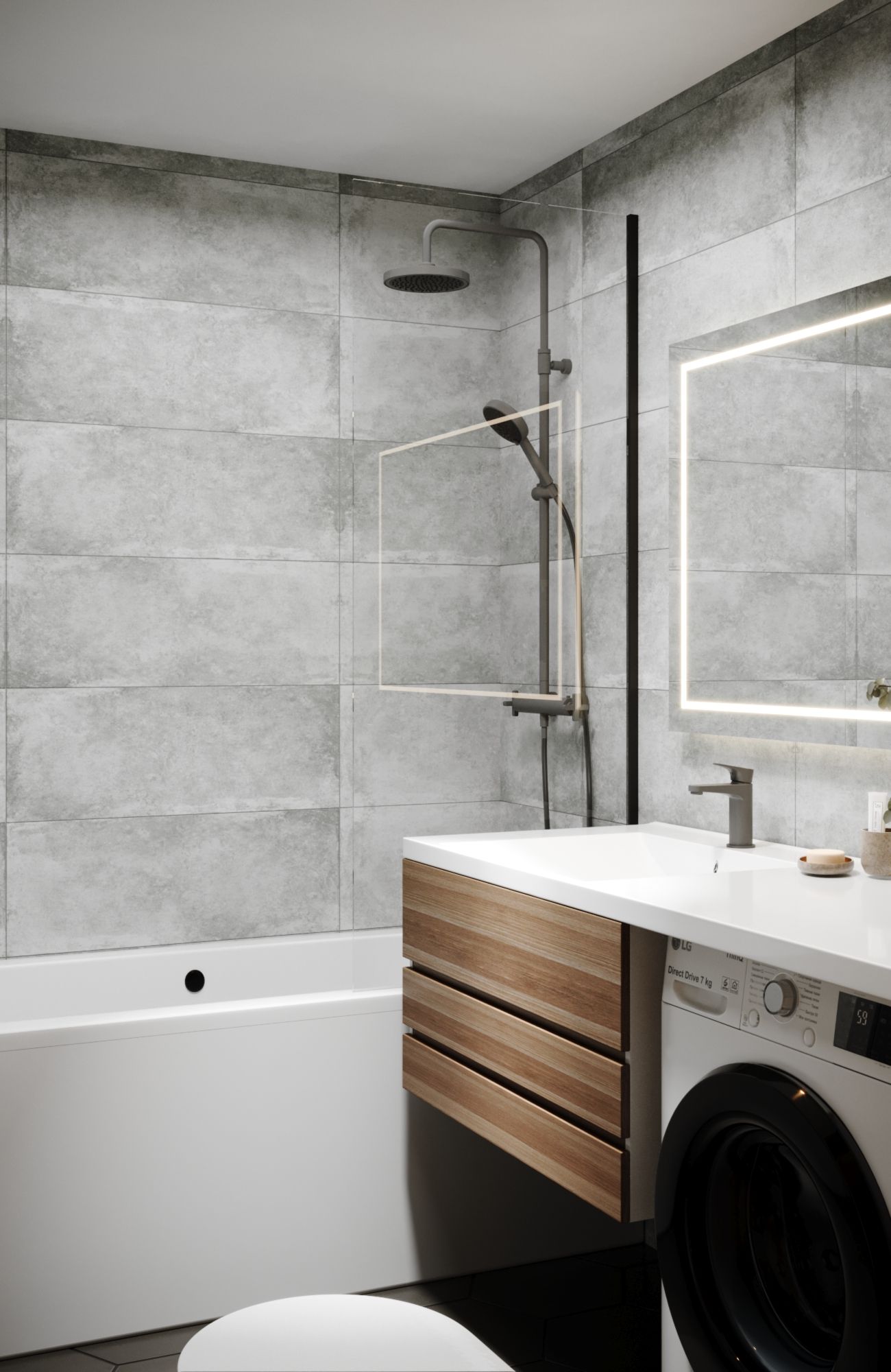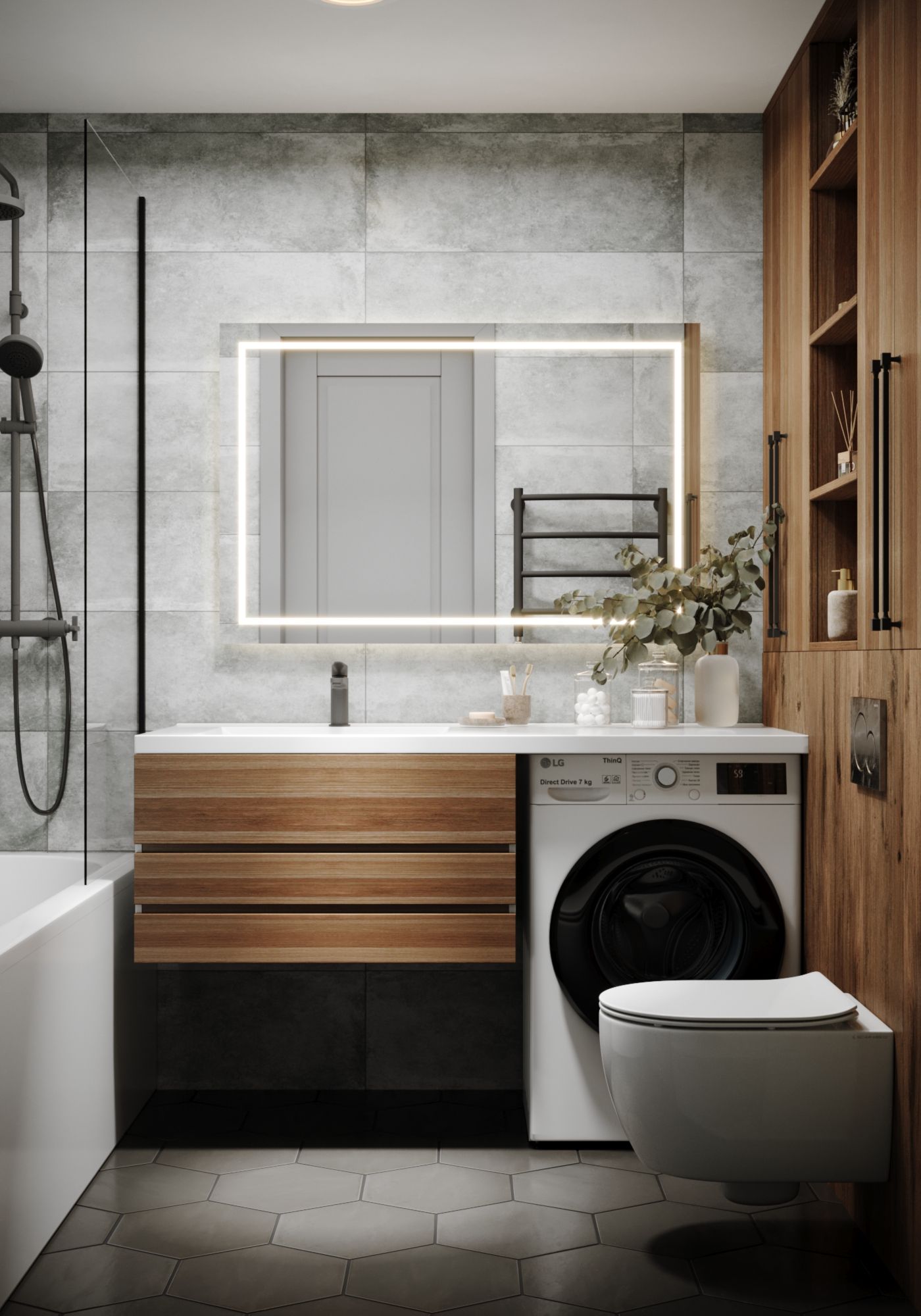Перепланировки не было. Хотели быстро сделать ремонт. Плитку в туалете и сантехнику оставили от застройщика. Демонтировали биде в туалете. Повесили унитаз на инсталляции и разместили стиральную машину в ванной.