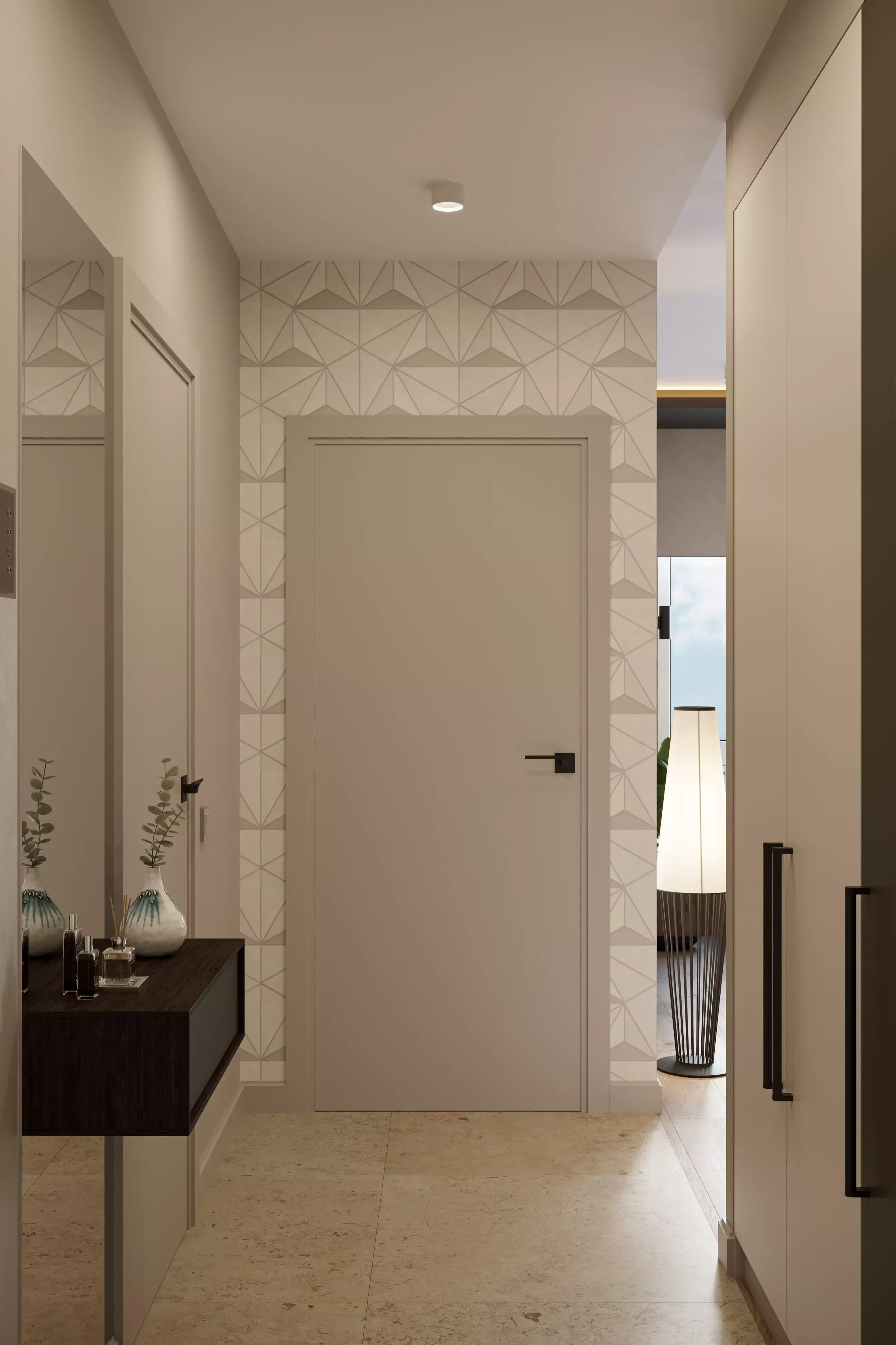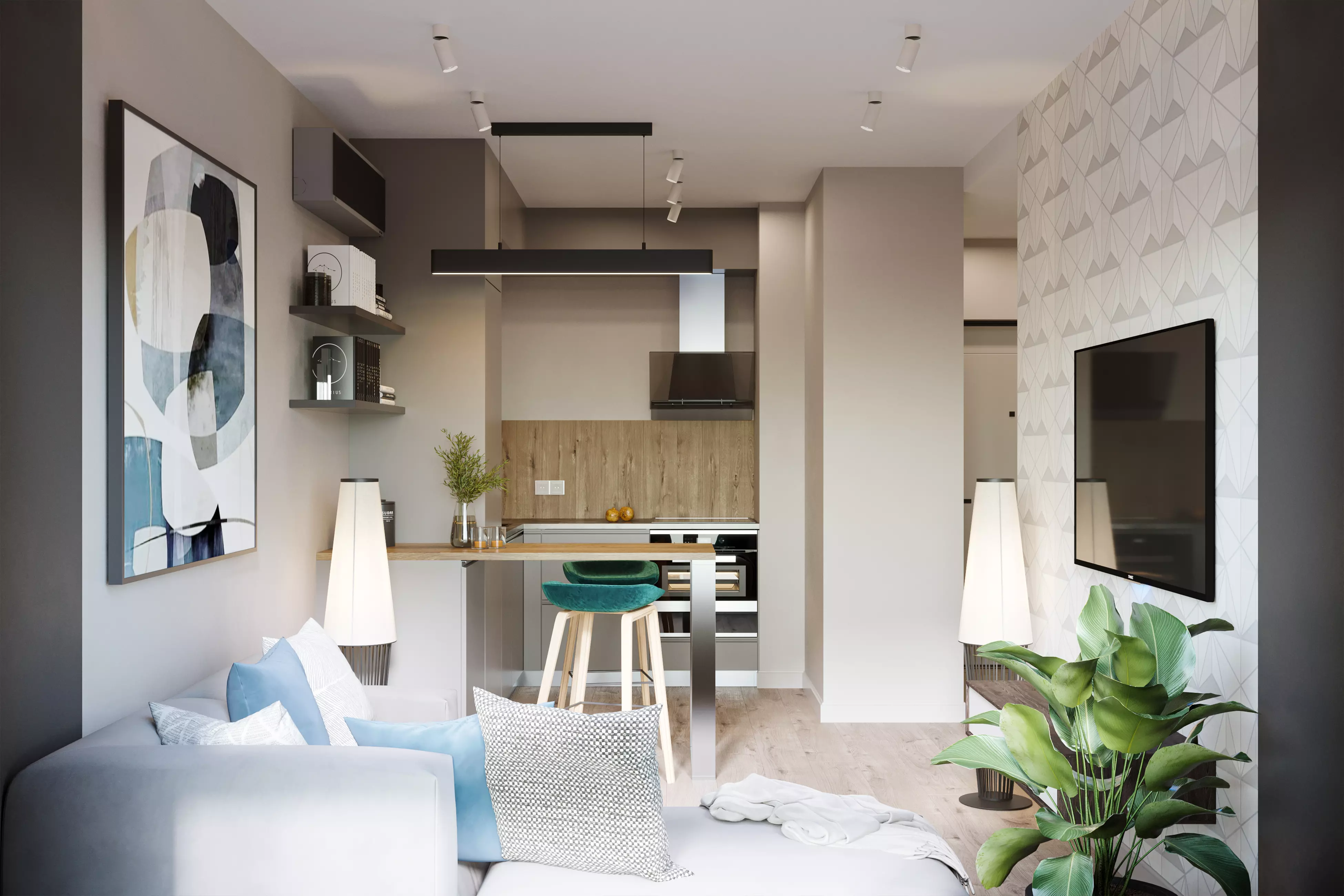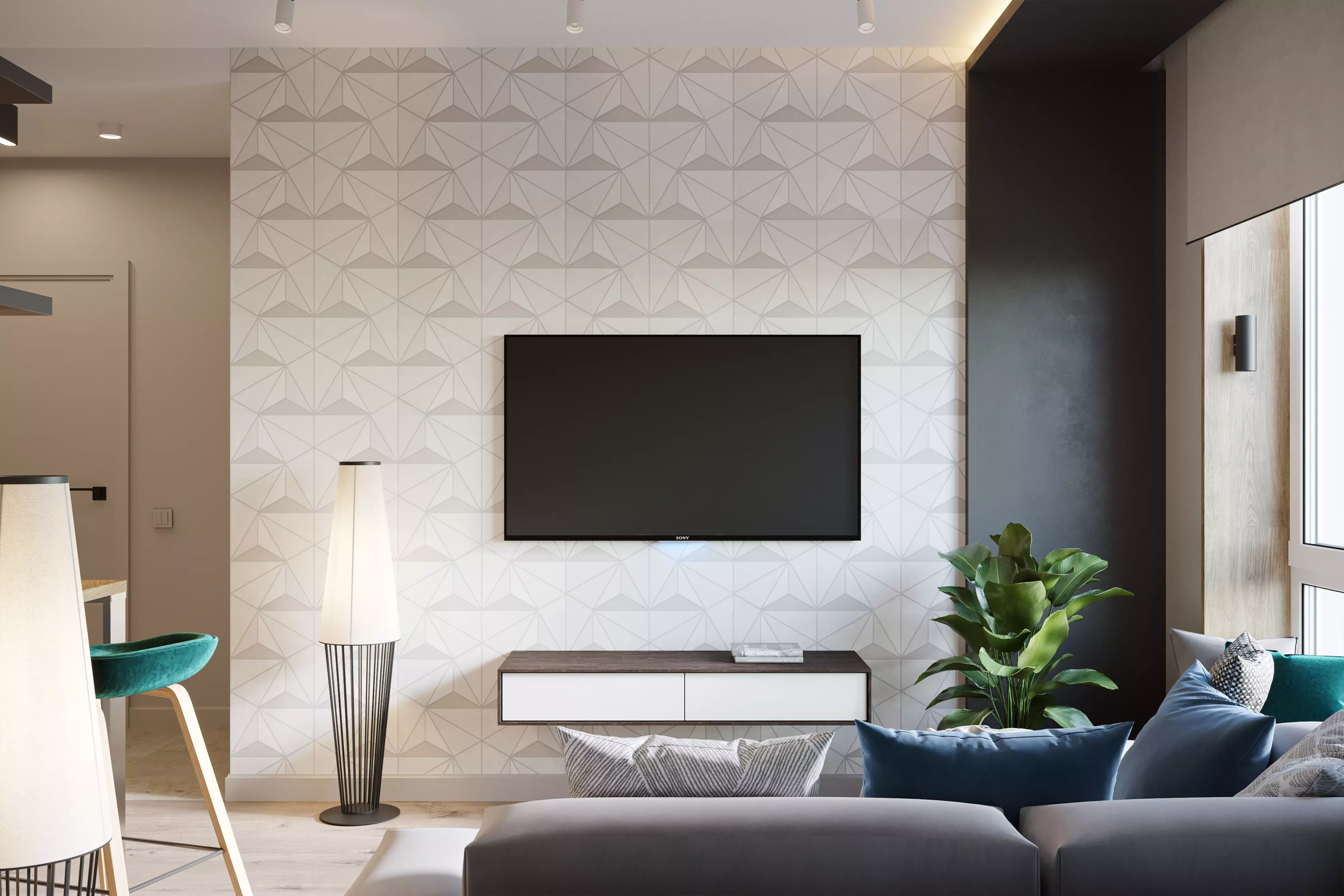 ΠΡΠ΄Π΅Π»ΠΊΠ° ΡΡΠ΅Π½ ΠΊΠ²Π°ΡΡΠΈΡΡ - ΠΏΠΎΠΊΡΠ°ΡΠΊΠ°. ΠΠΈΠ·ΡΠ°Π»ΡΠ½ΡΠ΅ Π°ΠΊΡΠ΅Π½ΡΡ Π² ΠΏΠΎΠΌΠ΅ΡΠ΅Π½ΠΈΡΡ ΡΠ°ΡΡΡΠ°Π²Π»Π΅Π½Ρ ΠΏΡΠΈΠΌΠ΅Π½Π΅Π½ΠΈΠ΅ΠΌ ΠΎΠ±ΠΎΠ΅Π² Ρ ΠΏΡΠΈΡΡΠ½ΡΠΌ Π³Π΅ΠΎΠΌΠ΅ΡΡΠΈΡΠ΅ΡΠΊΠΈΠΌ ΠΎΡΠ½Π°ΠΌΠ΅Π½ΡΠΎΠΌ. Π ΠΊΠ²Π°ΡΡΠΈΡΠ΅ Π΅Π²ΡΠΎΠ΄Π²ΡΡΠΊΠ΅ - ΡΡΠΎ ΡΡΠ΅Π½Π° Ρ ΡΠ΅Π»Π΅Π²ΠΈΠ·ΠΎΡΠΎΠΌ ΠΈ ΠΎΡΠ΄Π΅Π»ΠΊΠ° Π΄Π²ΡΡ ΡΡΠ΅Π½ (ΠΎΠ΄Π½Π° Π½Π°ΠΏΡΠΎΡΠΈΠ² Π΄ΡΡΠ³ΠΎΠΉ) Π² ΡΠΏΠ°Π»ΡΠ½Π΅. Π ΡΡΠ°Π»Π΅ΡΠ°Ρ ΠΏΡΠΈΠΌΠ΅Π½Π΅Π½Π° ΠΏΠ»ΠΈΡΠΊΠ° Ρ ΠΈΠΌΠΈΡΠ°ΡΠΈΠ΅ΠΉ Π΄Π΅ΡΠ΅Π²Π°.