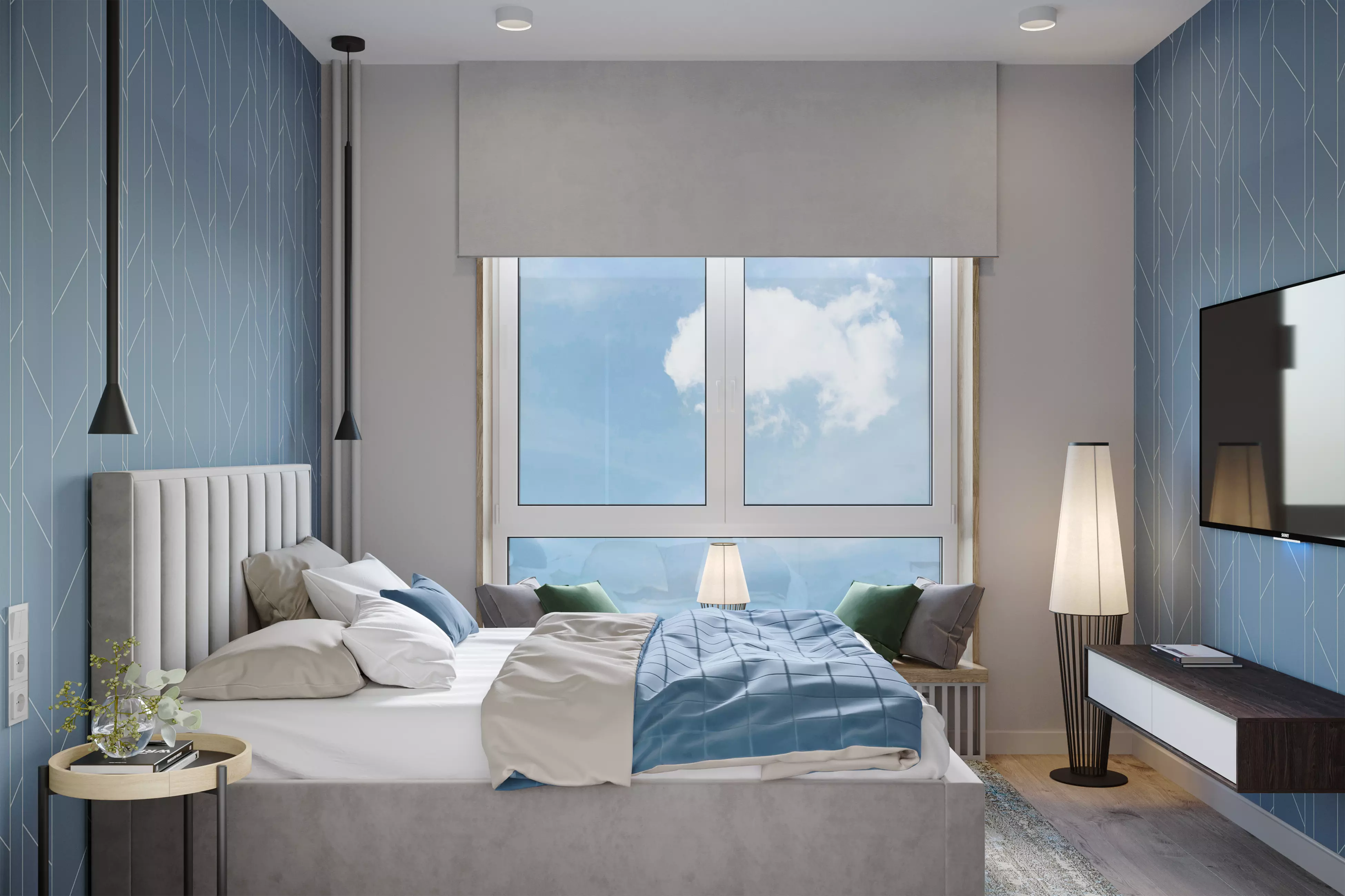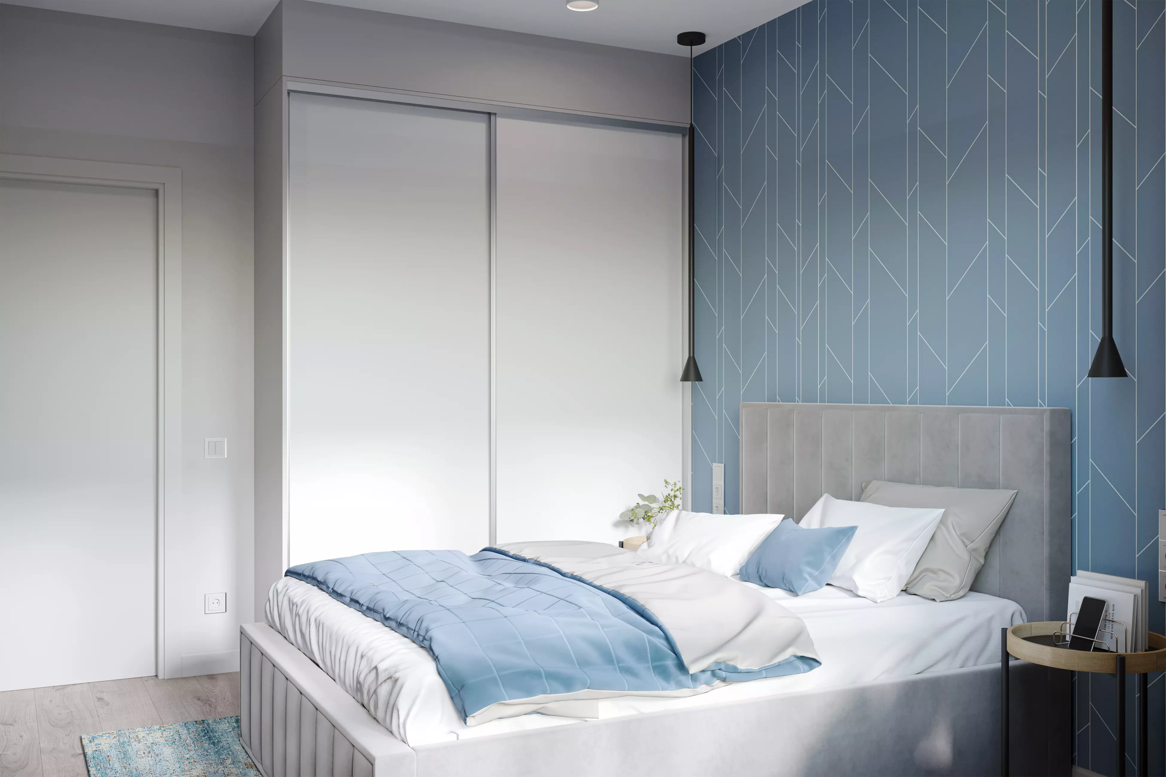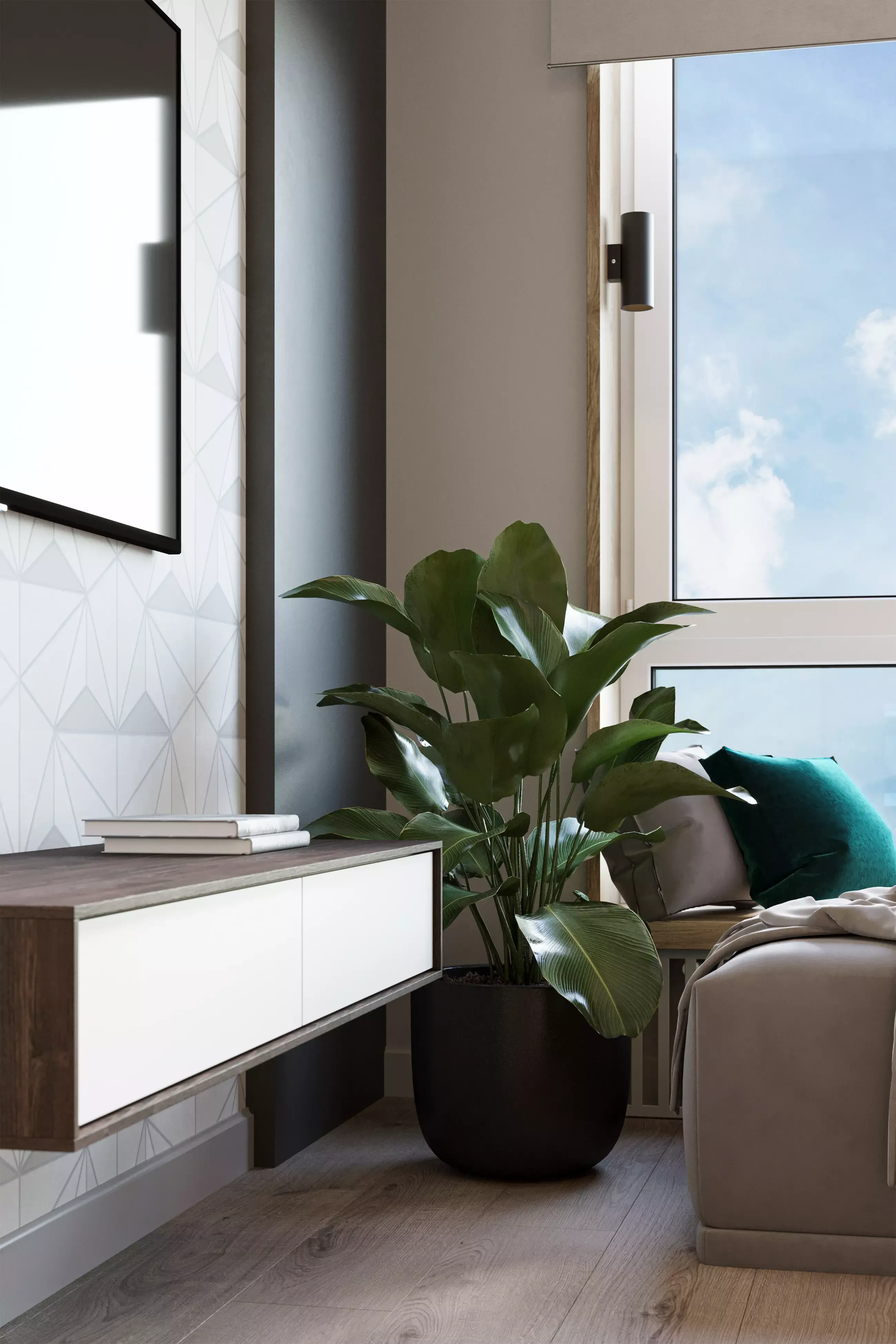 ΠΡΠ΄Π΅Π»ΠΊΠ° ΡΡΠ΅Π½ ΠΊΠ²Π°ΡΡΠΈΡΡ - ΠΏΠΎΠΊΡΠ°ΡΠΊΠ°. ΠΠΈΠ·ΡΠ°Π»ΡΠ½ΡΠ΅ Π°ΠΊΡΠ΅Π½ΡΡ Π² ΠΏΠΎΠΌΠ΅ΡΠ΅Π½ΠΈΡΡ ΡΠ°ΡΡΡΠ°Π²Π»Π΅Π½Ρ ΠΏΡΠΈΠΌΠ΅Π½Π΅Π½ΠΈΠ΅ΠΌ ΠΎΠ±ΠΎΠ΅Π² Ρ ΠΏΡΠΈΡΡΠ½ΡΠΌ Π³Π΅ΠΎΠΌΠ΅ΡΡΠΈΡΠ΅ΡΠΊΠΈΠΌ ΠΎΡΠ½Π°ΠΌΠ΅Π½ΡΠΎΠΌ. Π ΠΊΠ²Π°ΡΡΠΈΡΠ΅ Π΅Π²ΡΠΎΠ΄Π²ΡΡΠΊΠ΅ - ΡΡΠΎ ΡΡΠ΅Π½Π° Ρ ΡΠ΅Π»Π΅Π²ΠΈΠ·ΠΎΡΠΎΠΌ ΠΈ ΠΎΡΠ΄Π΅Π»ΠΊΠ° Π΄Π²ΡΡ ΡΡΠ΅Π½ (ΠΎΠ΄Π½Π° Π½Π°ΠΏΡΠΎΡΠΈΠ² Π΄ΡΡΠ³ΠΎΠΉ) Π² ΡΠΏΠ°Π»ΡΠ½Π΅. Π ΡΡΠ°Π»Π΅ΡΠ°Ρ ΠΏΡΠΈΠΌΠ΅Π½Π΅Π½Π° ΠΏΠ»ΠΈΡΠΊΠ° Ρ ΠΈΠΌΠΈΡΠ°ΡΠΈΠ΅ΠΉ Π΄Π΅ΡΠ΅Π²Π°.