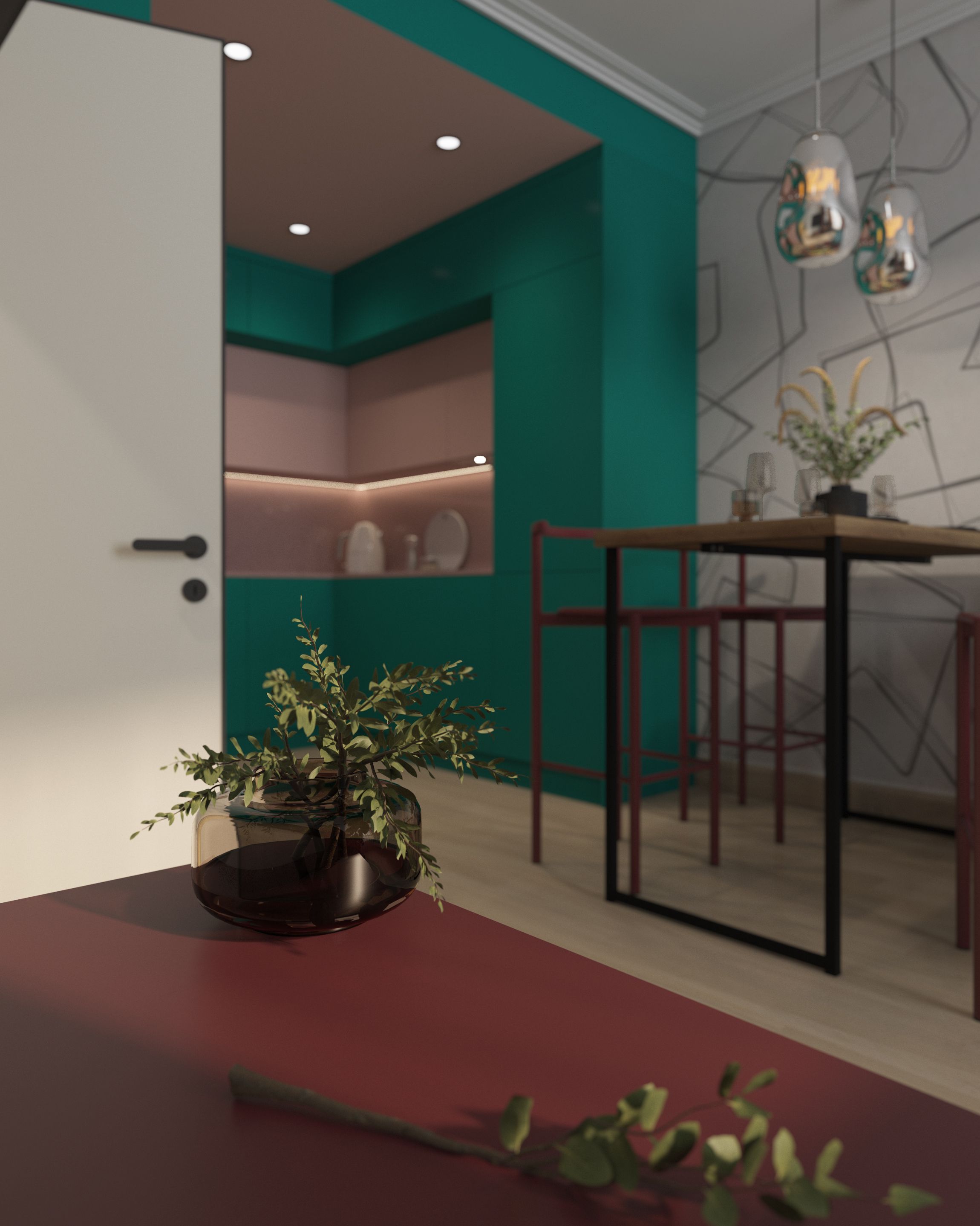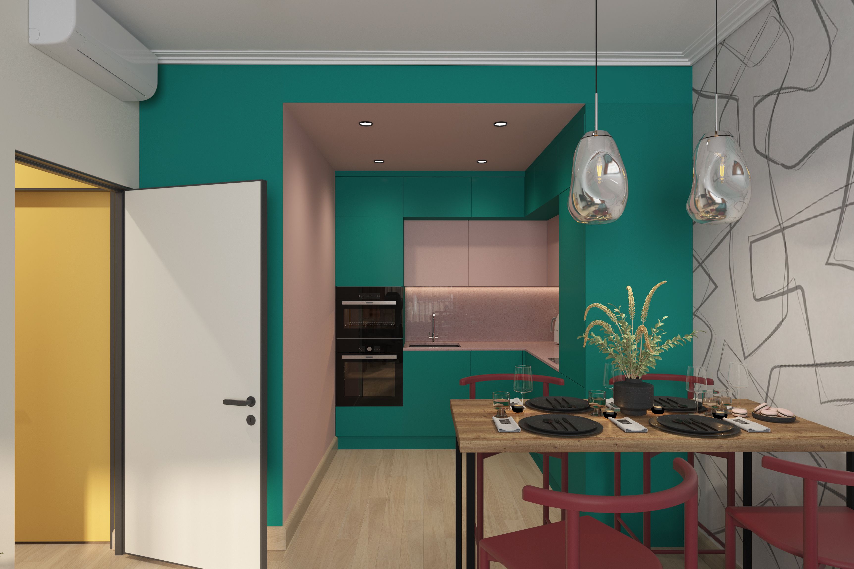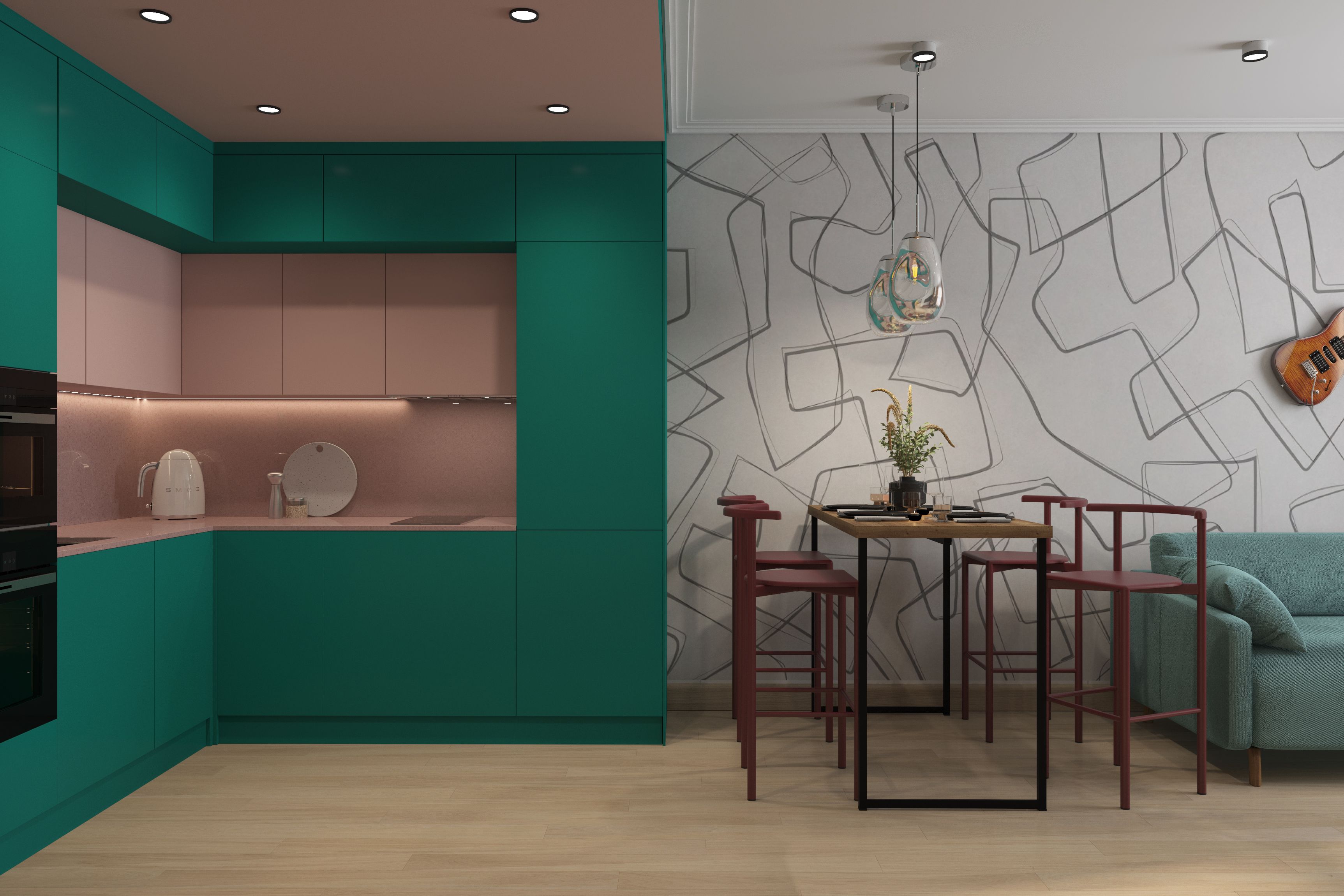 Цветовая палитра выбрана из ярких приятных глазу цветов. Клиенты пришли с конкретным запросом на дофаминовый интерьер с розово-зеленой кухней. Розовый с зеленым цвета сами по себе являются акцентными. Чтобы вся квартира выглядела ярко, были добавлены желтый, голубой, коричневый, бордовый. Золотисто-коричневые оттенки дерева сочетаются с пепельно розовым, бирюзово зеленым, оранжевым, бордовым. Такой дофаминовый интерьер призван дарить счастье.