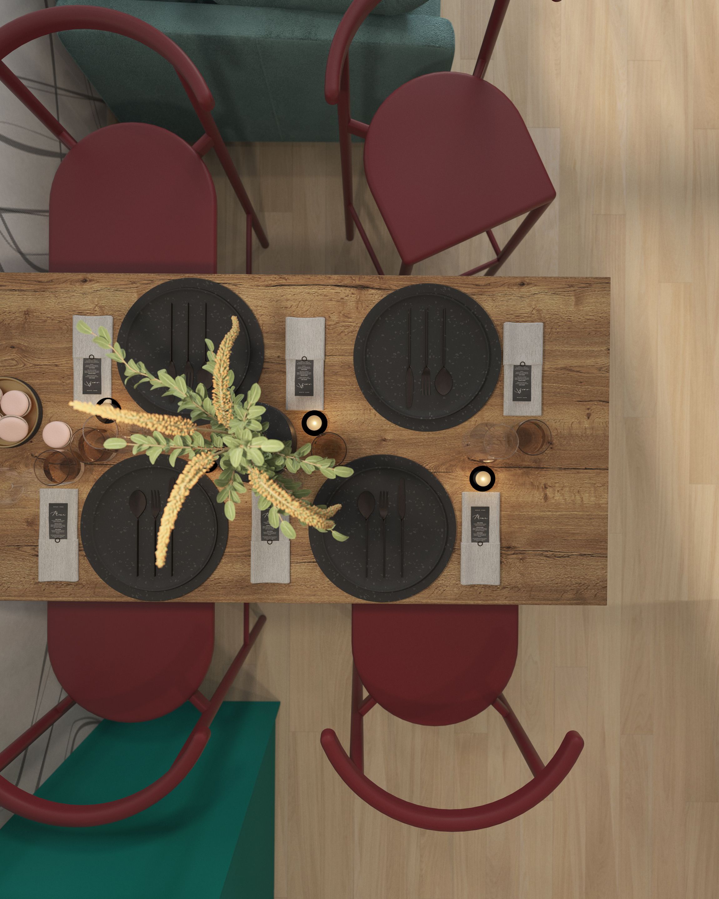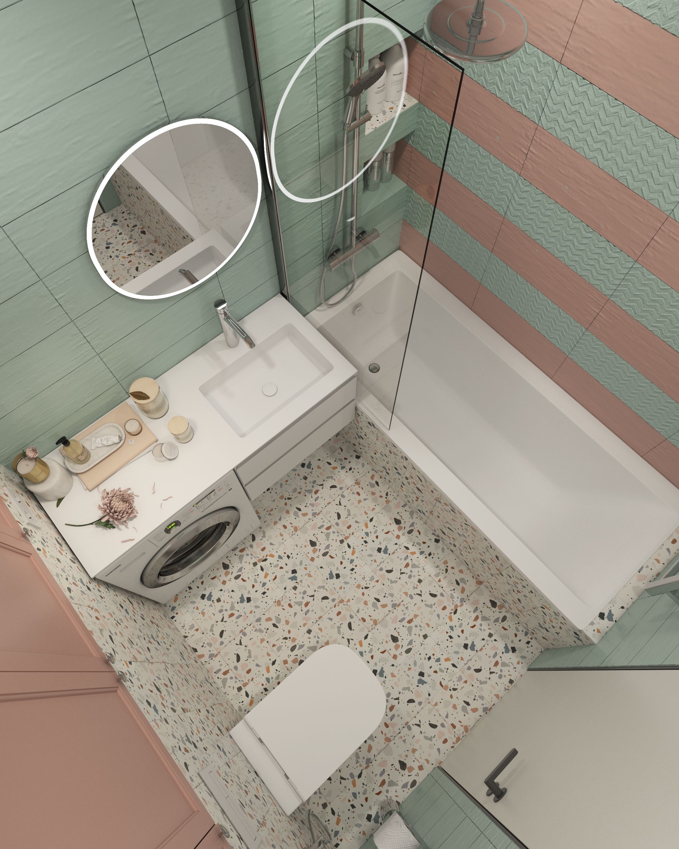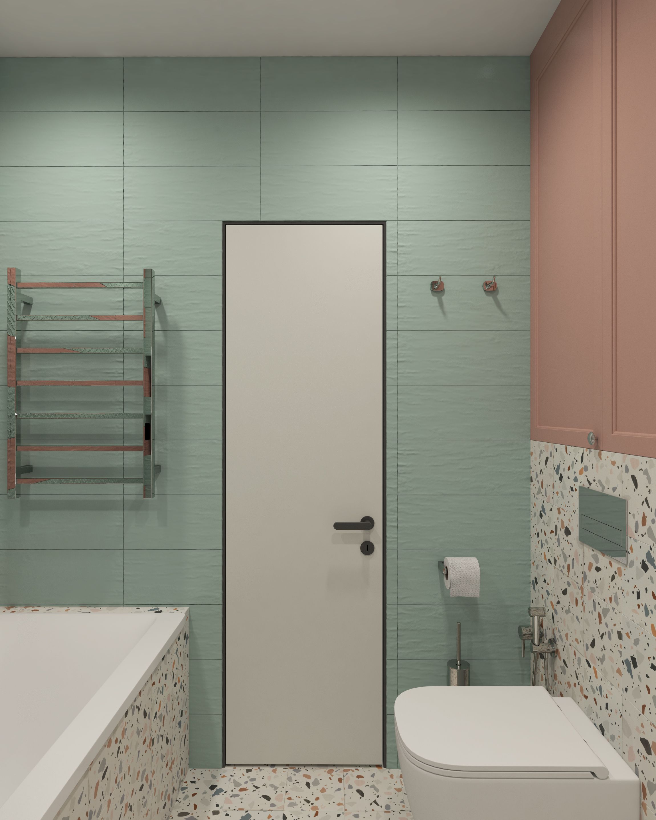Цветовая палитра выбрана из ярких приятных глазу цветов. Клиенты пришли с конкретным запросом на дофаминовый интерьер с розово-зеленой кухней. Розовый с зеленым цвета сами по себе являются акцентными. Чтобы вся квартира выглядела ярко, были добавлены желтый, голубой, коричневый, бордовый. Золотисто-коричневые оттенки дерева сочетаются с пепельно розовым, бирюзово зеленым, оранжевым, бордовым. Такой дофаминовый интерьер призван дарить счастье.
