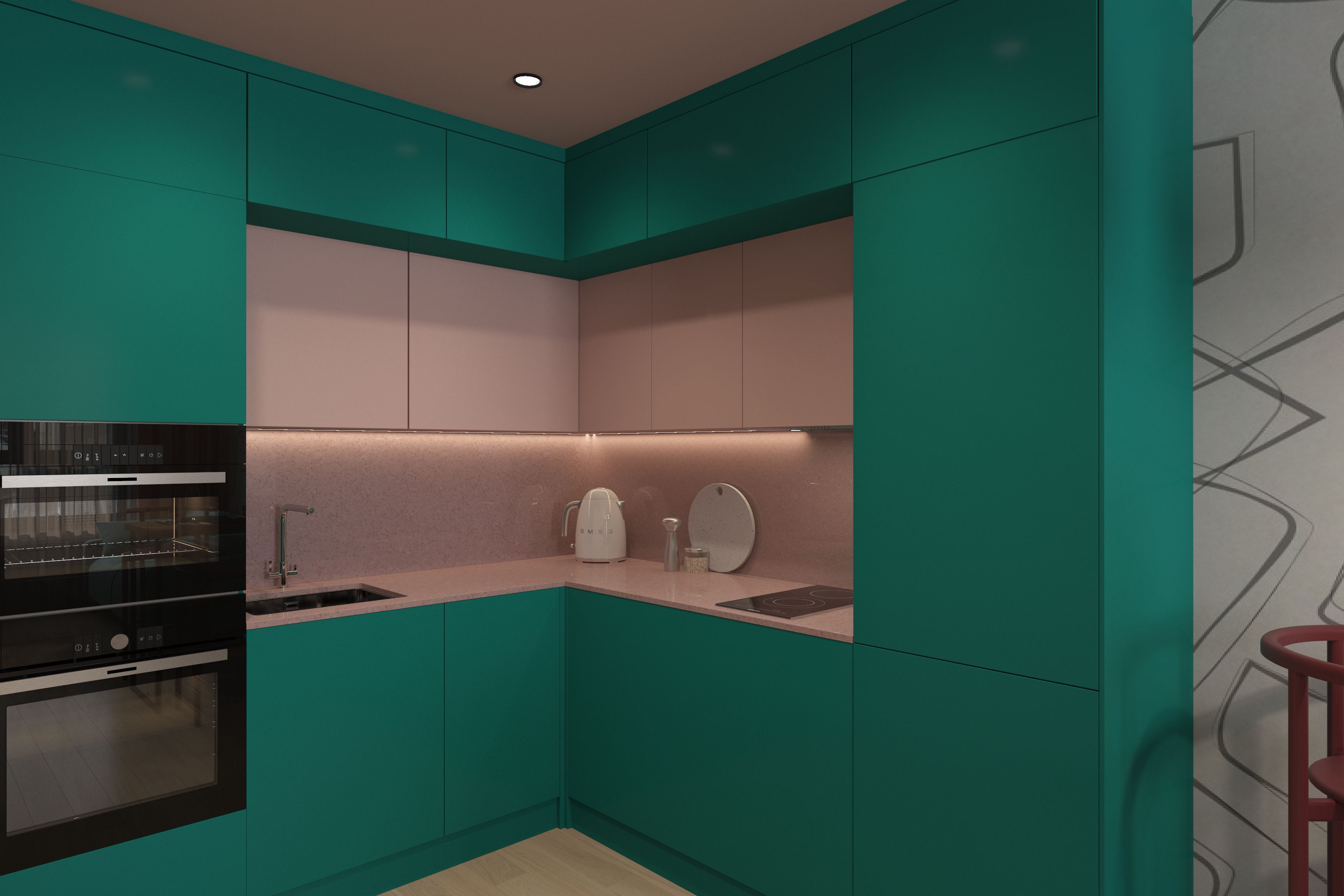 Самым сложным было найти материал для столешницы и стеновой панели розового цвета. Камень Staron, выбранный для этих целей был снят производства. Найти камень розового цвета оказалось не простой задачей. Тем не менее мы нашли нужный цвет у Petrobeton, в цветовой палитре которых был бетон нужного розового цвета. Также нашли искусственный камень у Kerrock тоже розового цвета. Получилось, что от выбранного розового цвета камня зависит выкрас по NCS фасадов кухни и краски для стен.