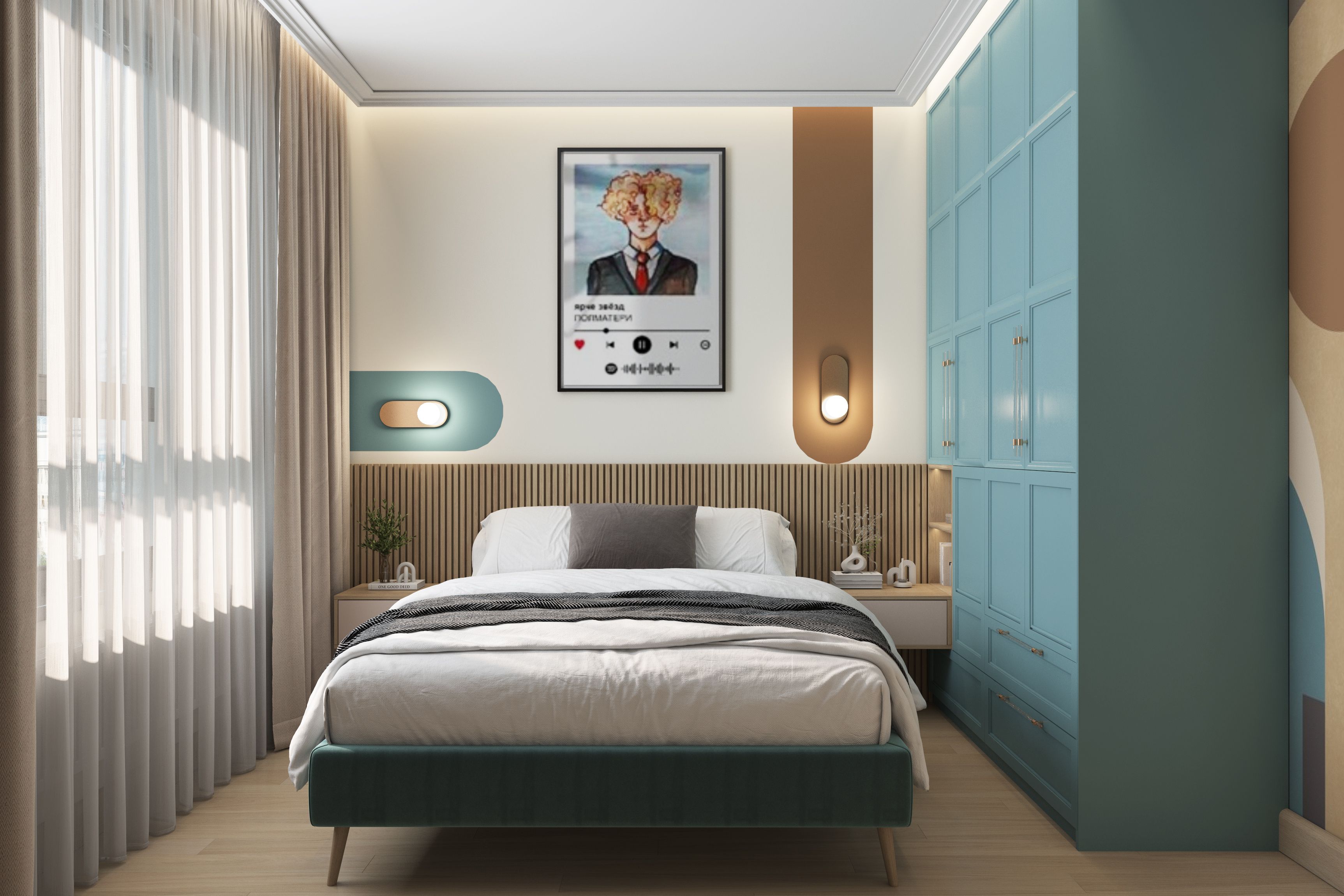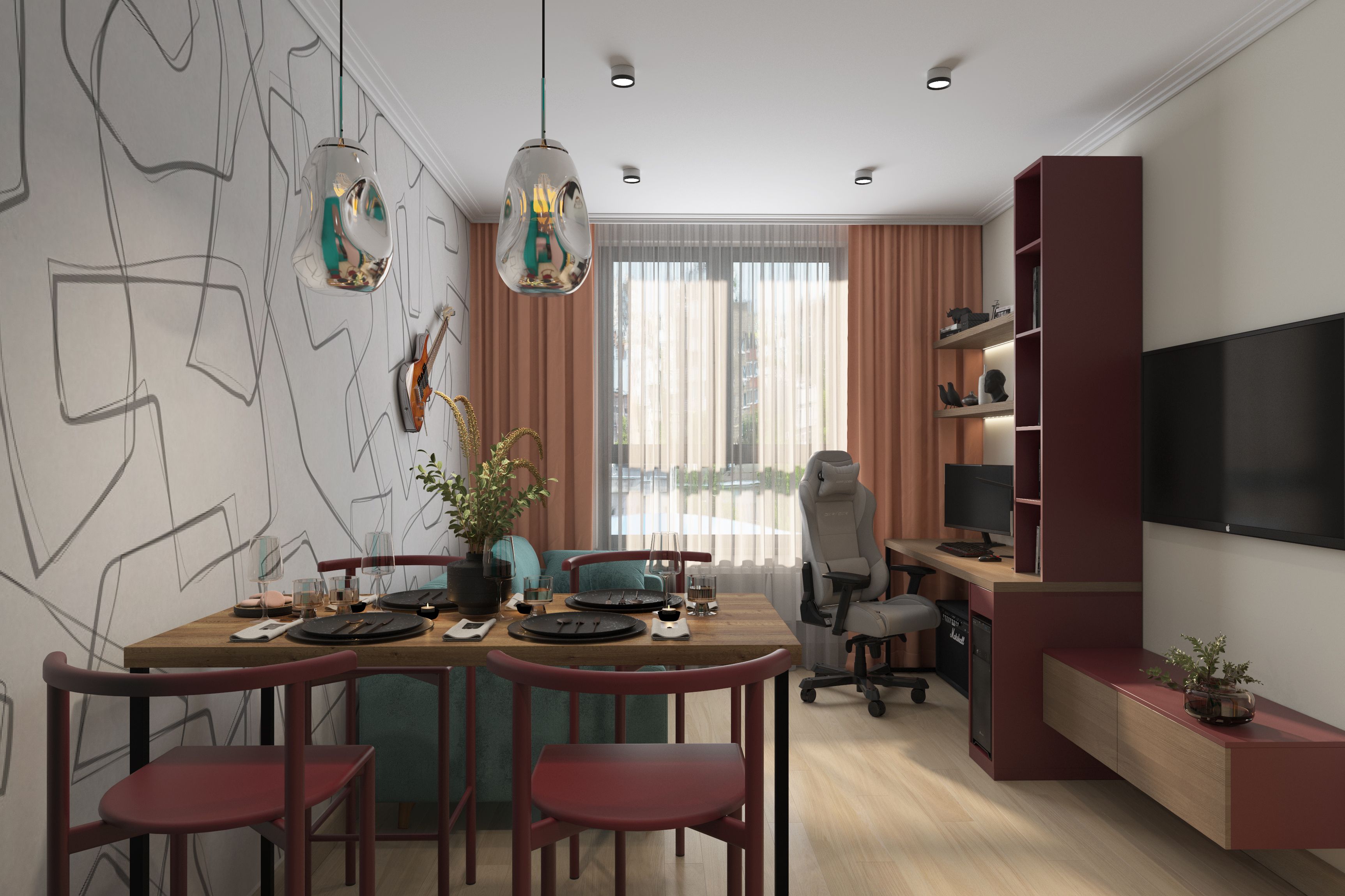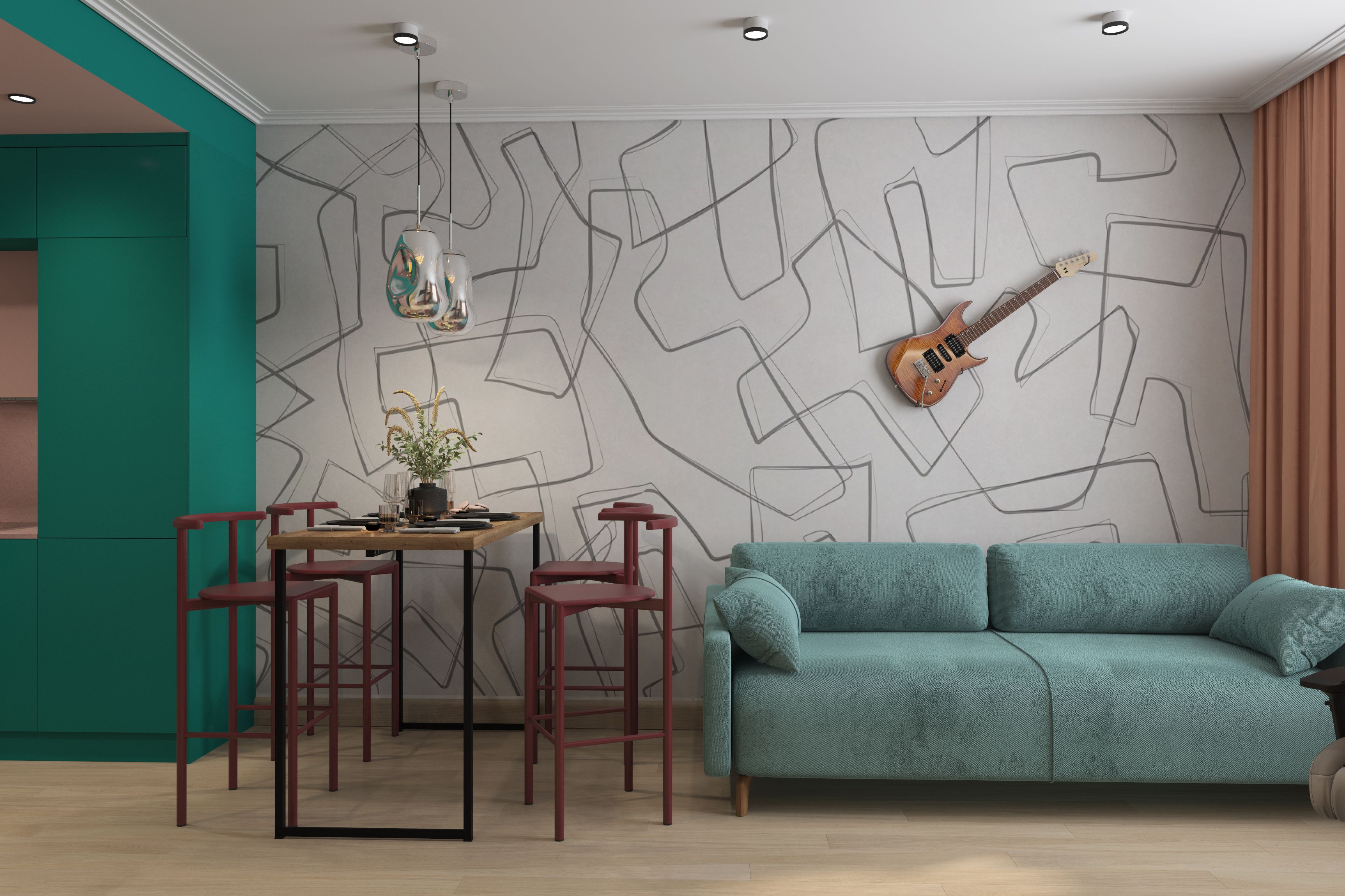 У молодого человека-хозяина квартиры был куплен постер. Его мы разместили в спальне. Еще он увлекается игрой на электро гитаре. Она висит в гостиной.