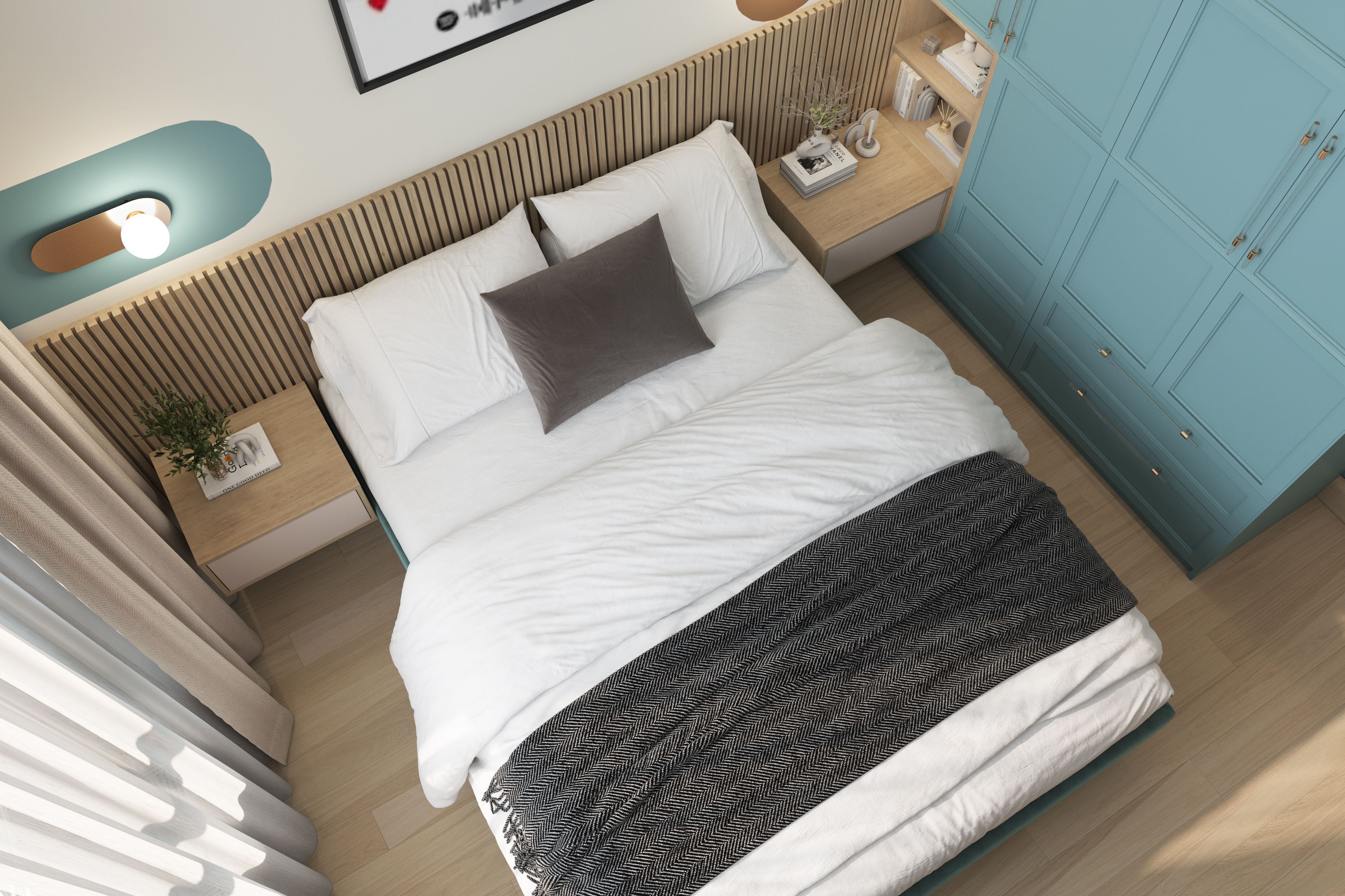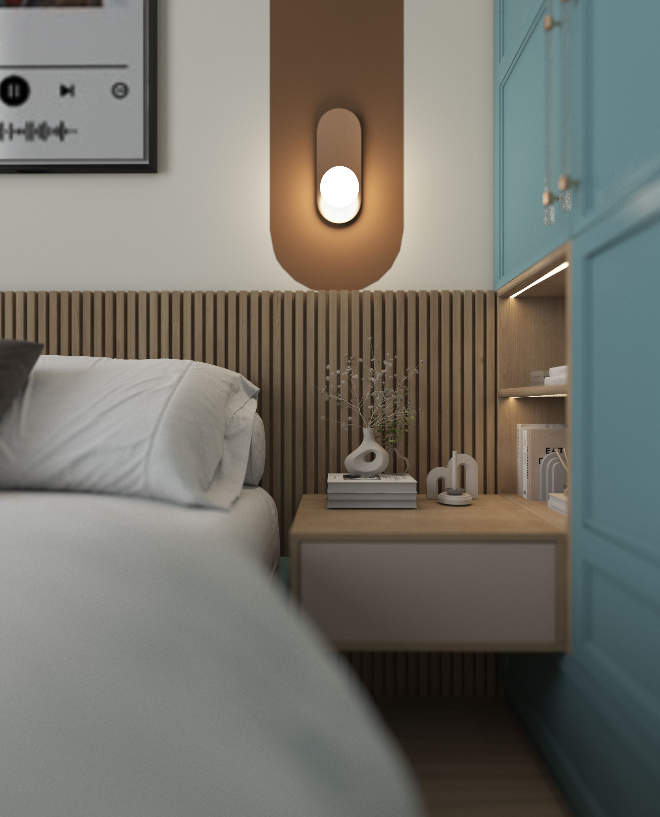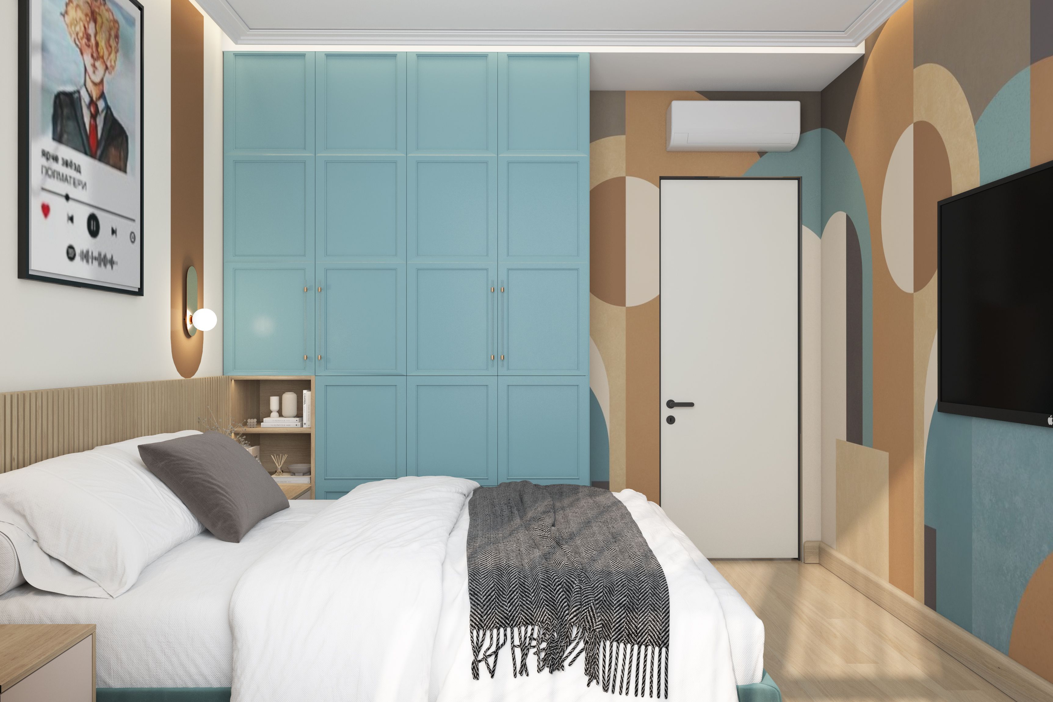 У молодого человека-хозяина квартиры был куплен постер. Его мы разместили в спальне. Еще он увлекается игрой на электро гитаре. Она висит в гостиной.