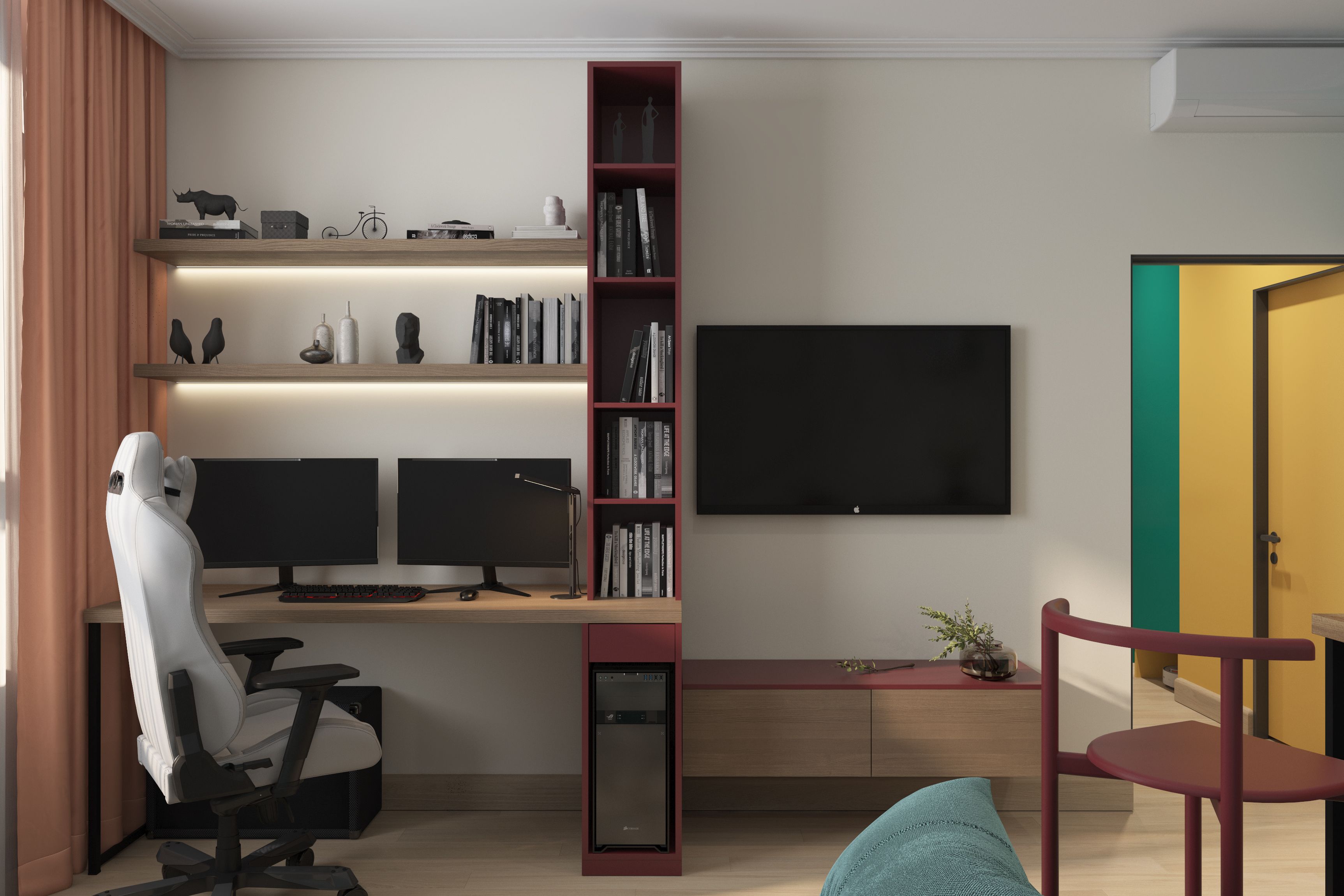 Квартира предназначается мальчику-студенту 1 курса. За оформление квартиры выступала мама мальчика. Молодой человек увлекается программированием и хочет связать с этим свою жизнь. Родители тоже программисты, работают в IT компаниях. Обсуждая проект, оказалось, что клиенты очень любят цвет. Мама задала сочетание розового с бирюзово-зеленым, который мы поддержали другими яркими цветами по всей квартире. Так появился желтый, голубой и коричневые цвета.