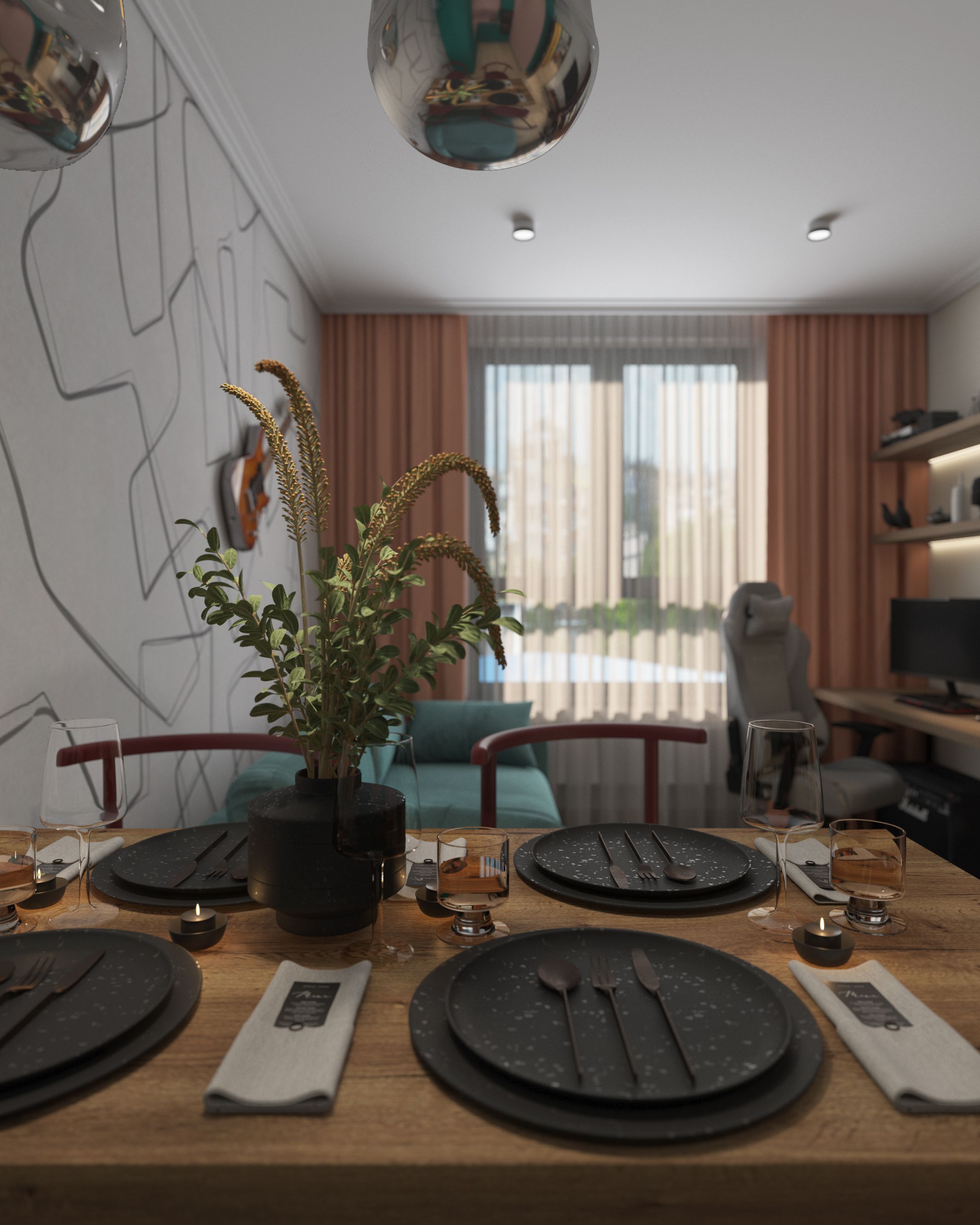 Освещение в квартире проектировалось двух типов: общее освещение и акцентное освещение. В зоне кухни располагаются накладные споты - общее освещение. Акцент над обеденным столом - подвесы. В зоне гостиной только технический общий свет.