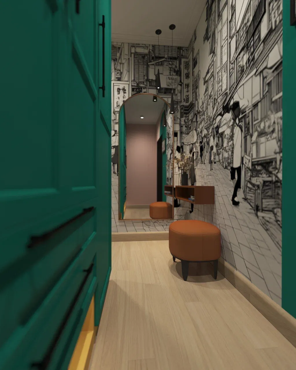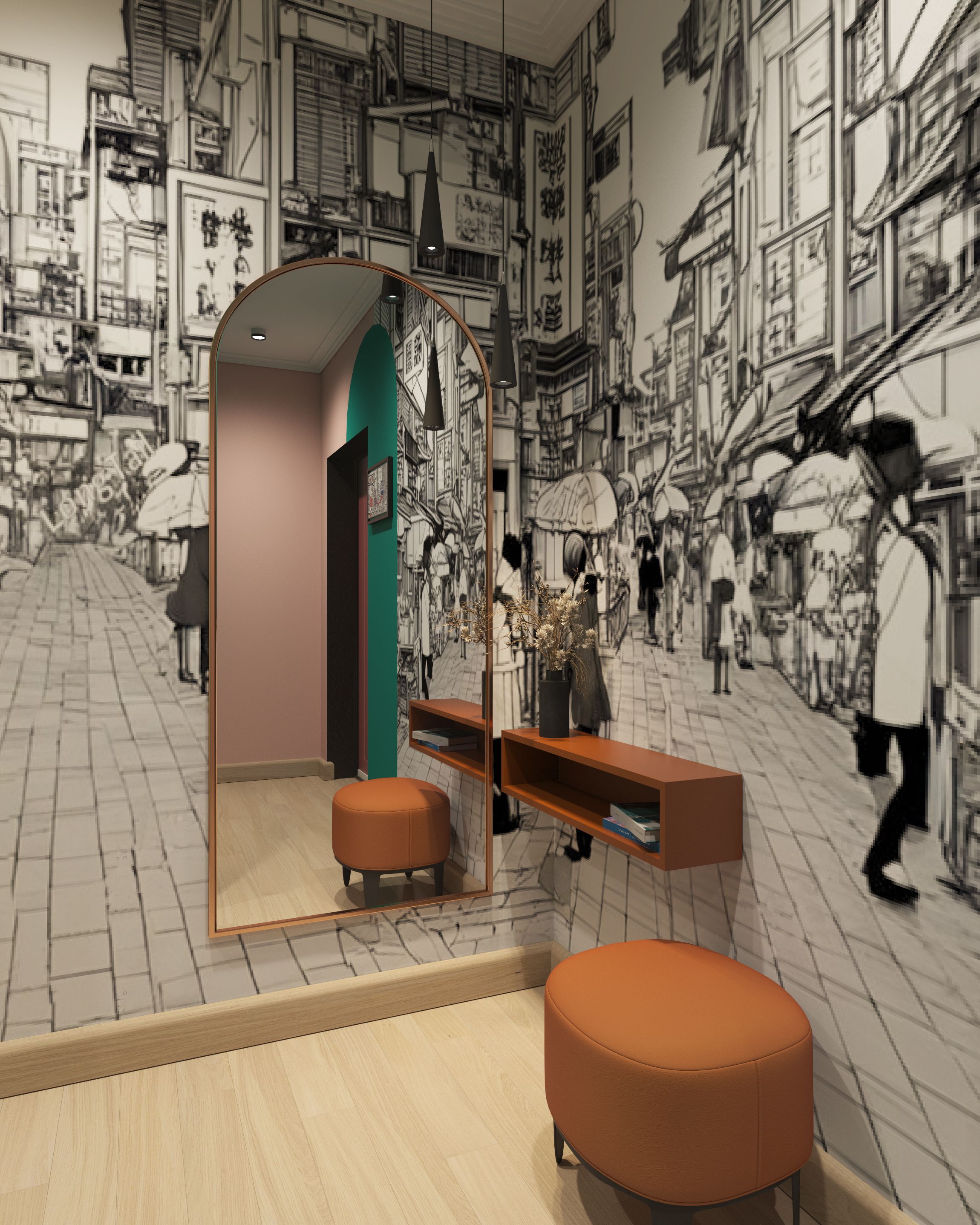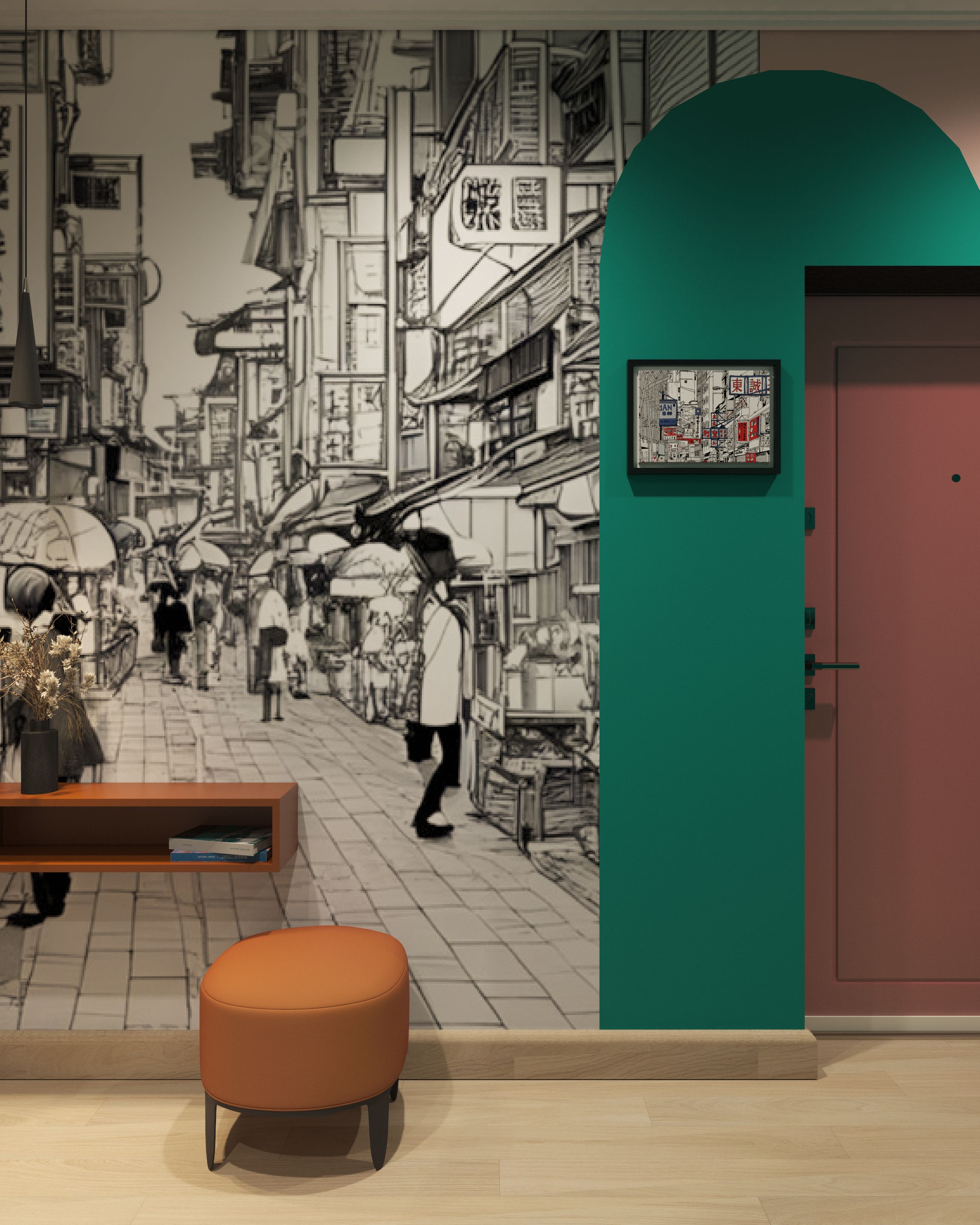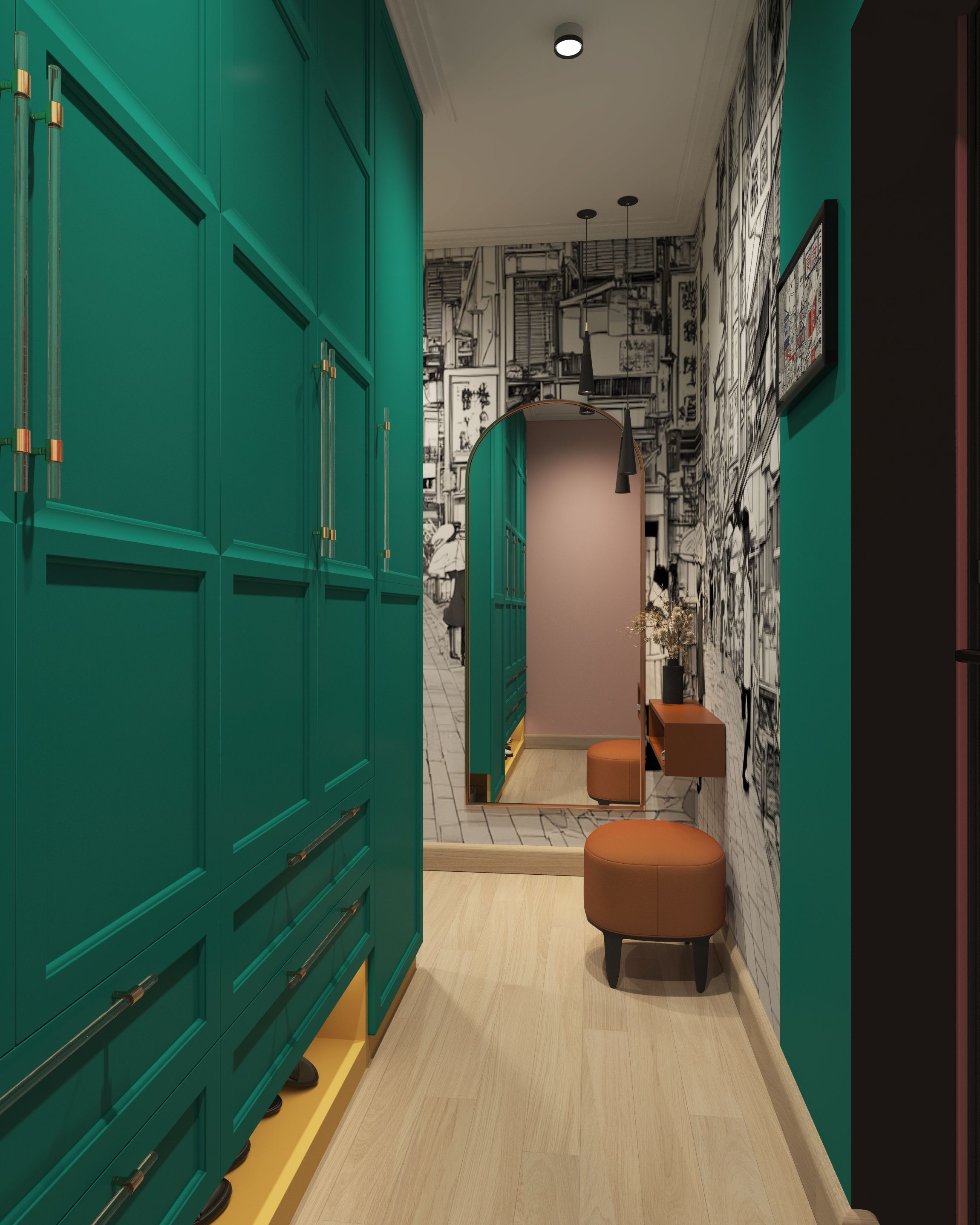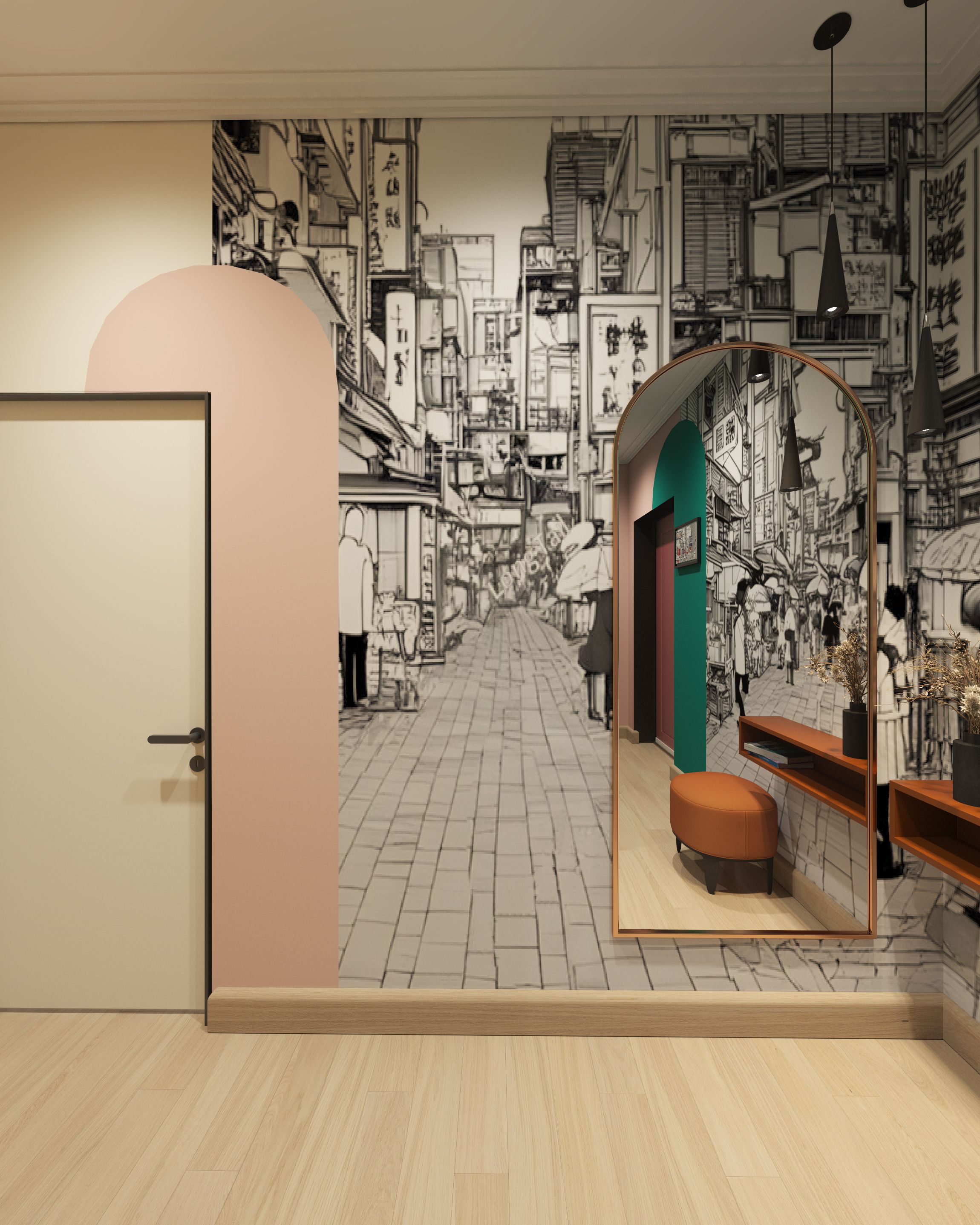 В проекте присутствует яркая мебель: кухня розово-зеленая, гостиная группа бордовая, зелено-желтый шкаф в коридоре, голубо-коричневый шкаф в спальне, оранжевая консоль. Эти же цвета повторяются краской на стенах. Некоторые стены мы украсили акцентными обоями. В коридоре индивидуальная печать изображения из шаттерстока — улица в Корейском квартале. Молодой человек увлечен k-попом. Фреска черно-белая. Колорблоками на нее наложены контрастные арки, выкрашенные краской. Заказчики не скрывали своей любви к цвету. Такие цветные интерьеры принято называть дофаминовыми.