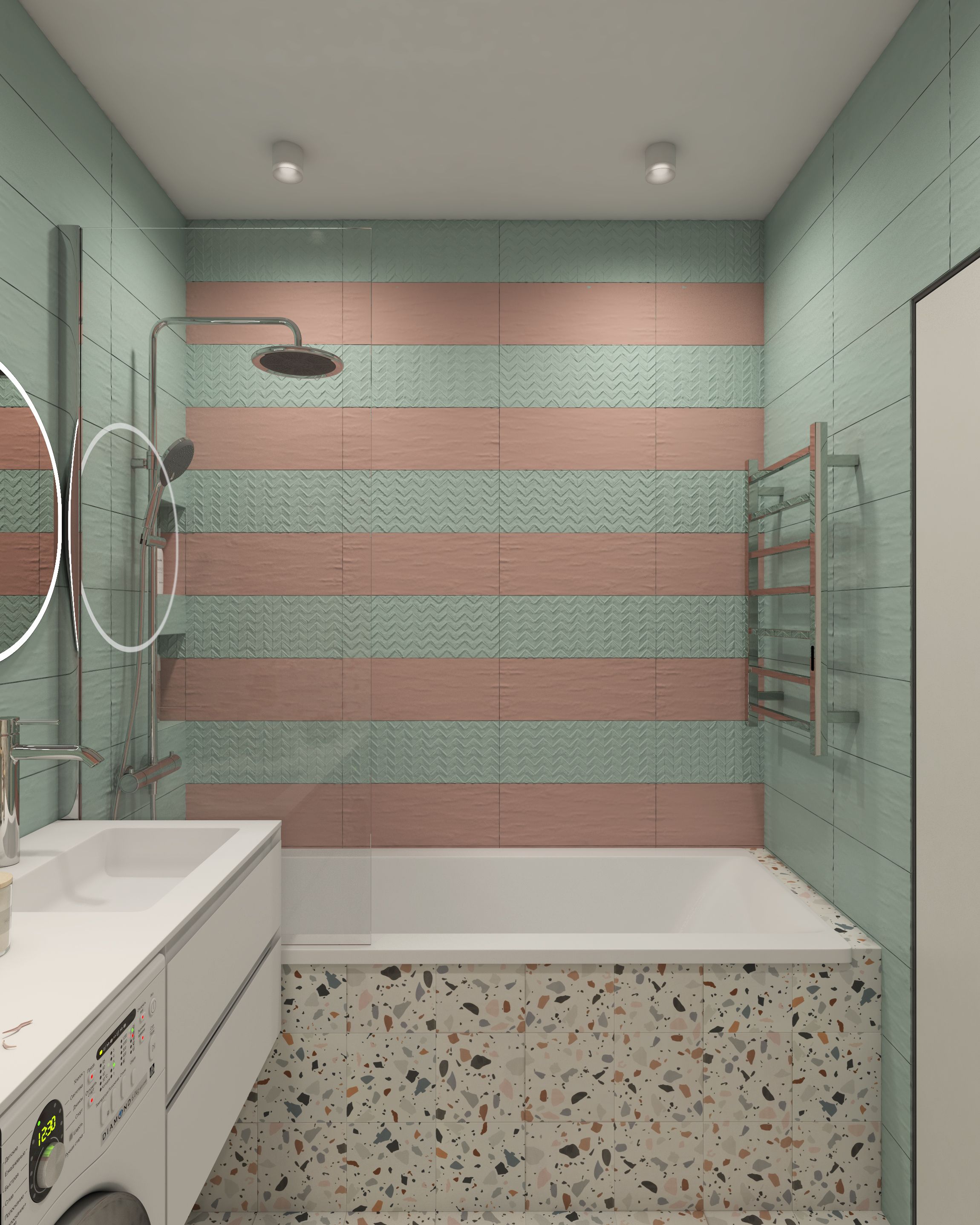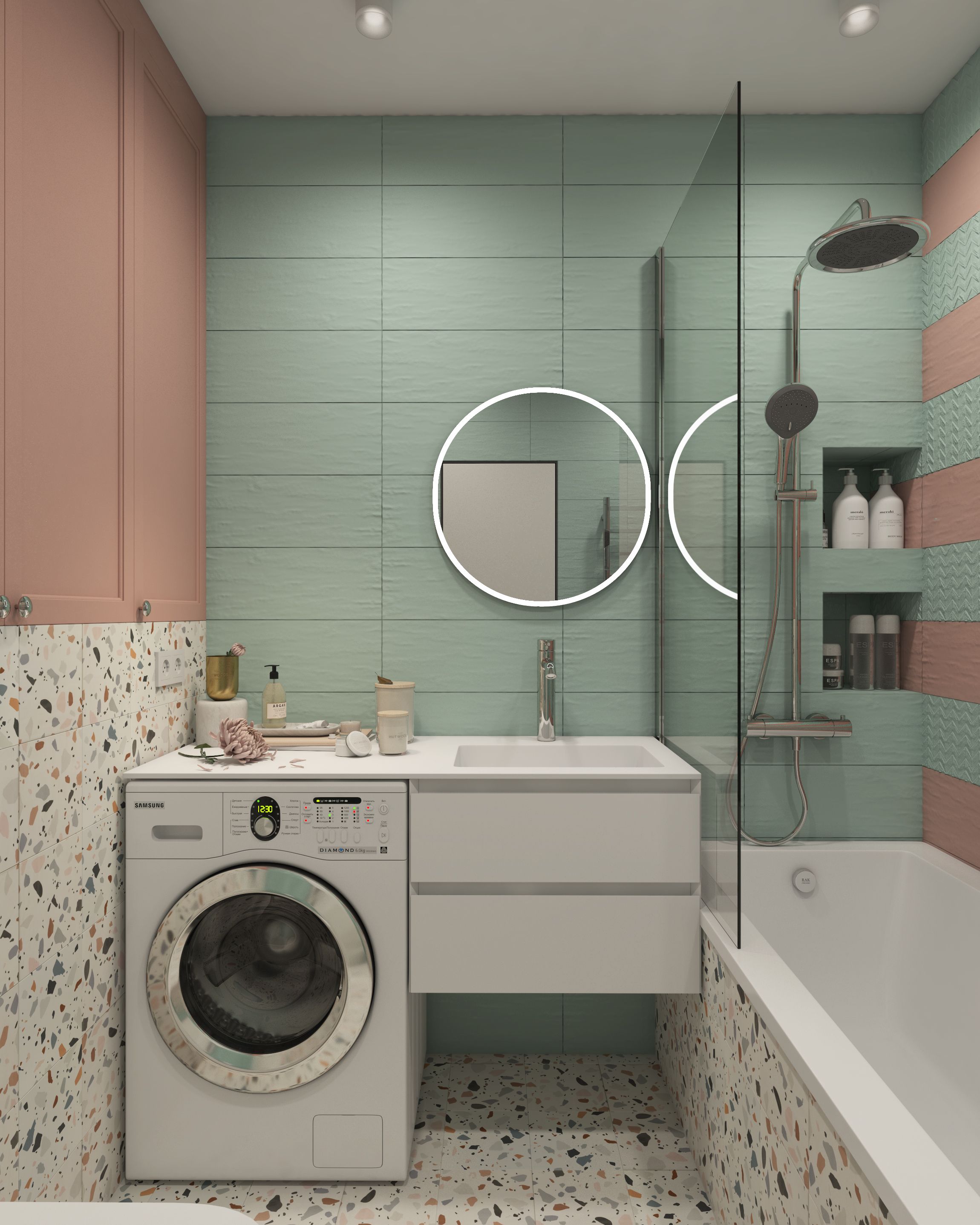 В ванной запроектирован шкафчик над инсталяцией. Дверки в нем размещены так, что позволяют удобно хранить сушилку.