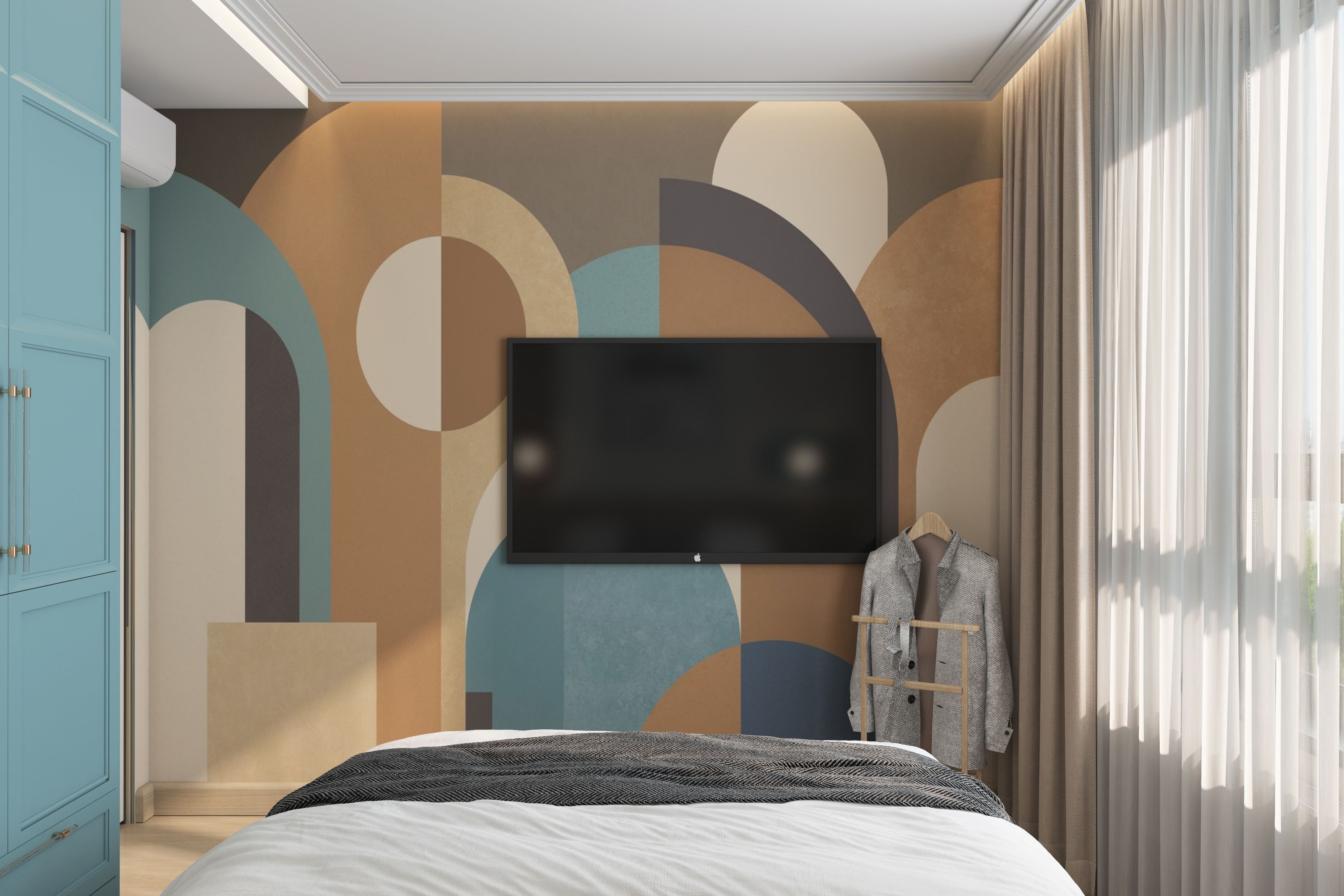Это современный дофаминовый интерьер с активным использованием цвета. Как и все современные интерьеры, данная квартира эклектична. Здесь есть что-то от минимализма и что-то от модернизма и колорблока. Особенно это проявляется в цветных арках в коридоре, в нарисованных рисунках под бра в спальне, в арочных, совершенно модернистки, обоях с арками.