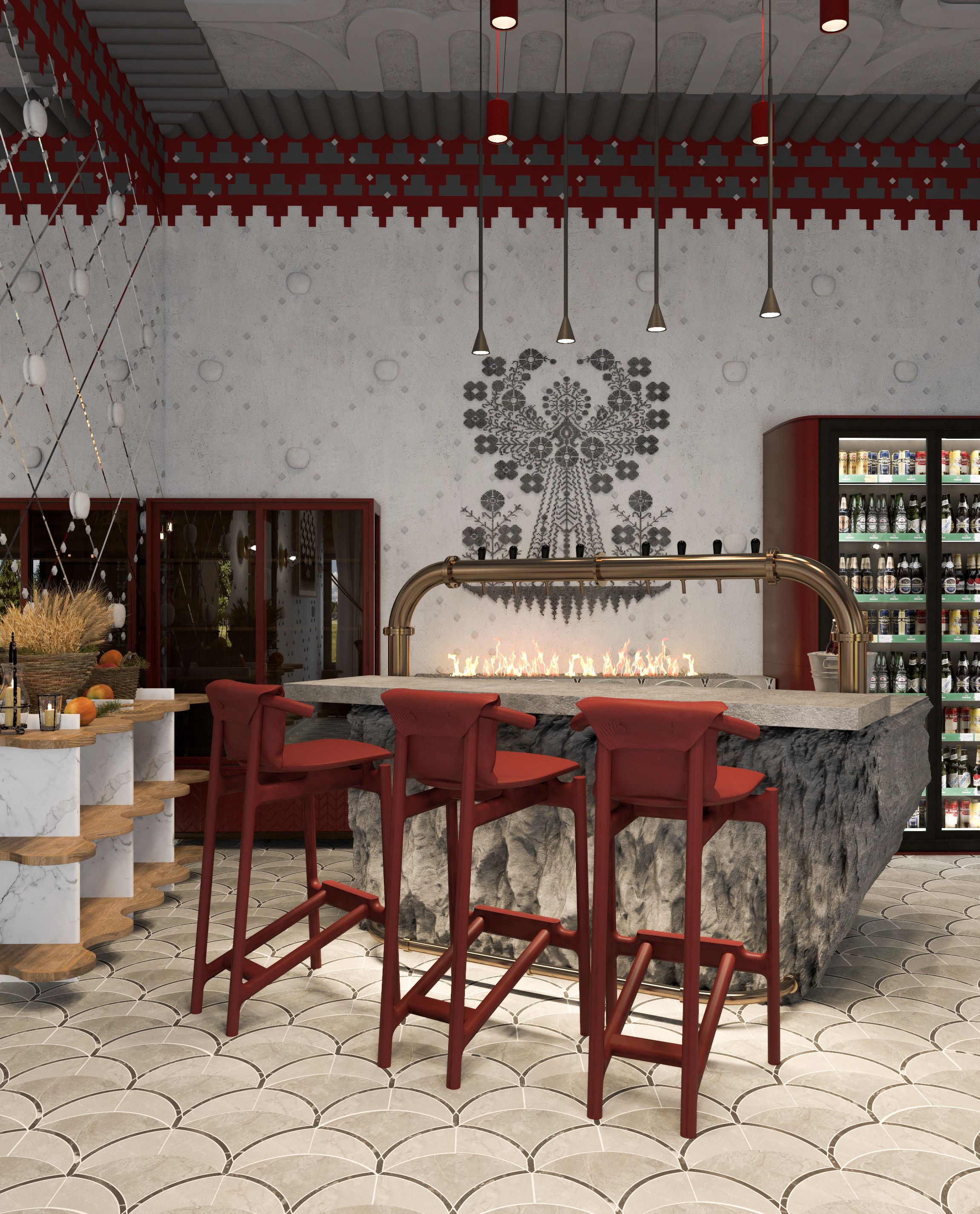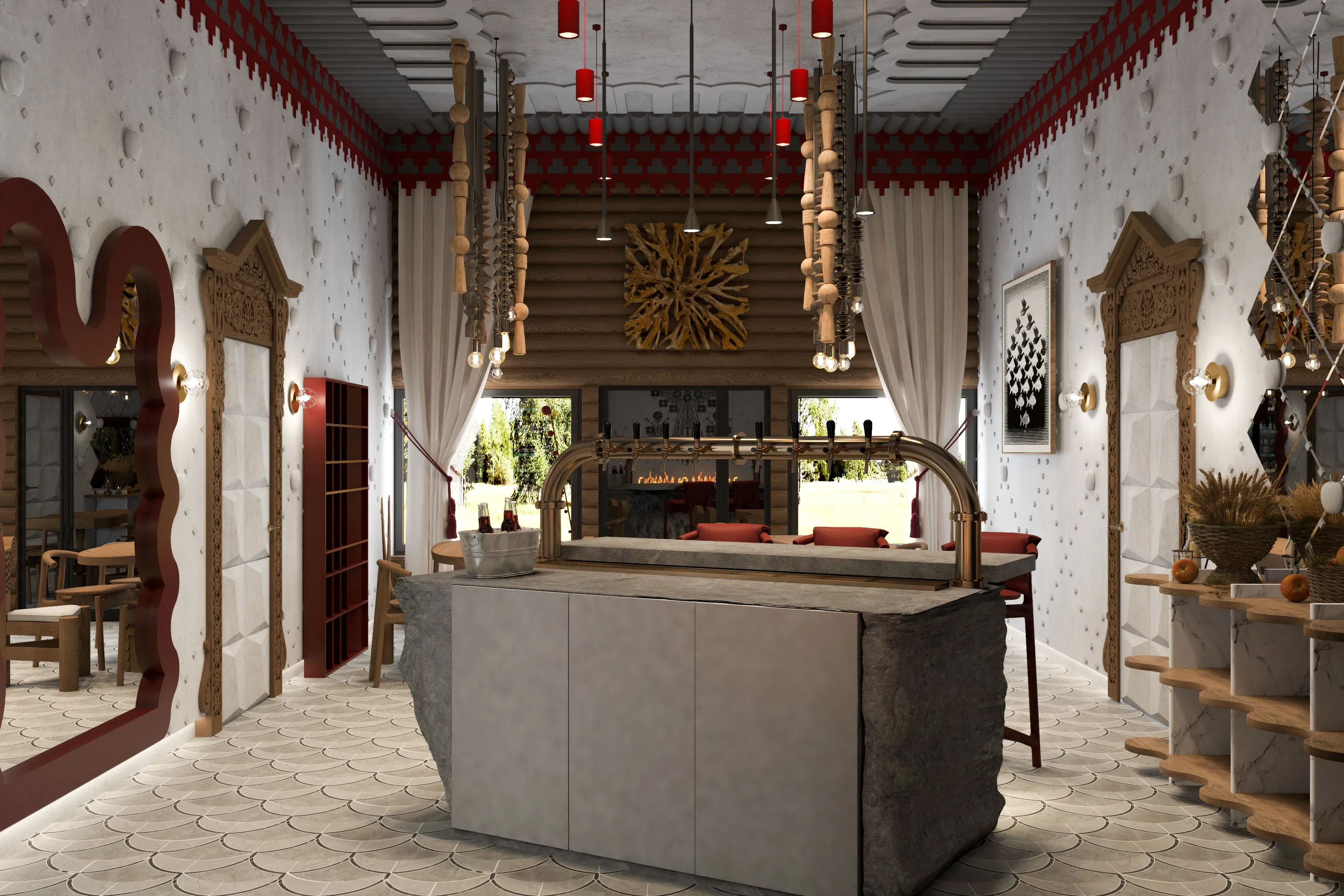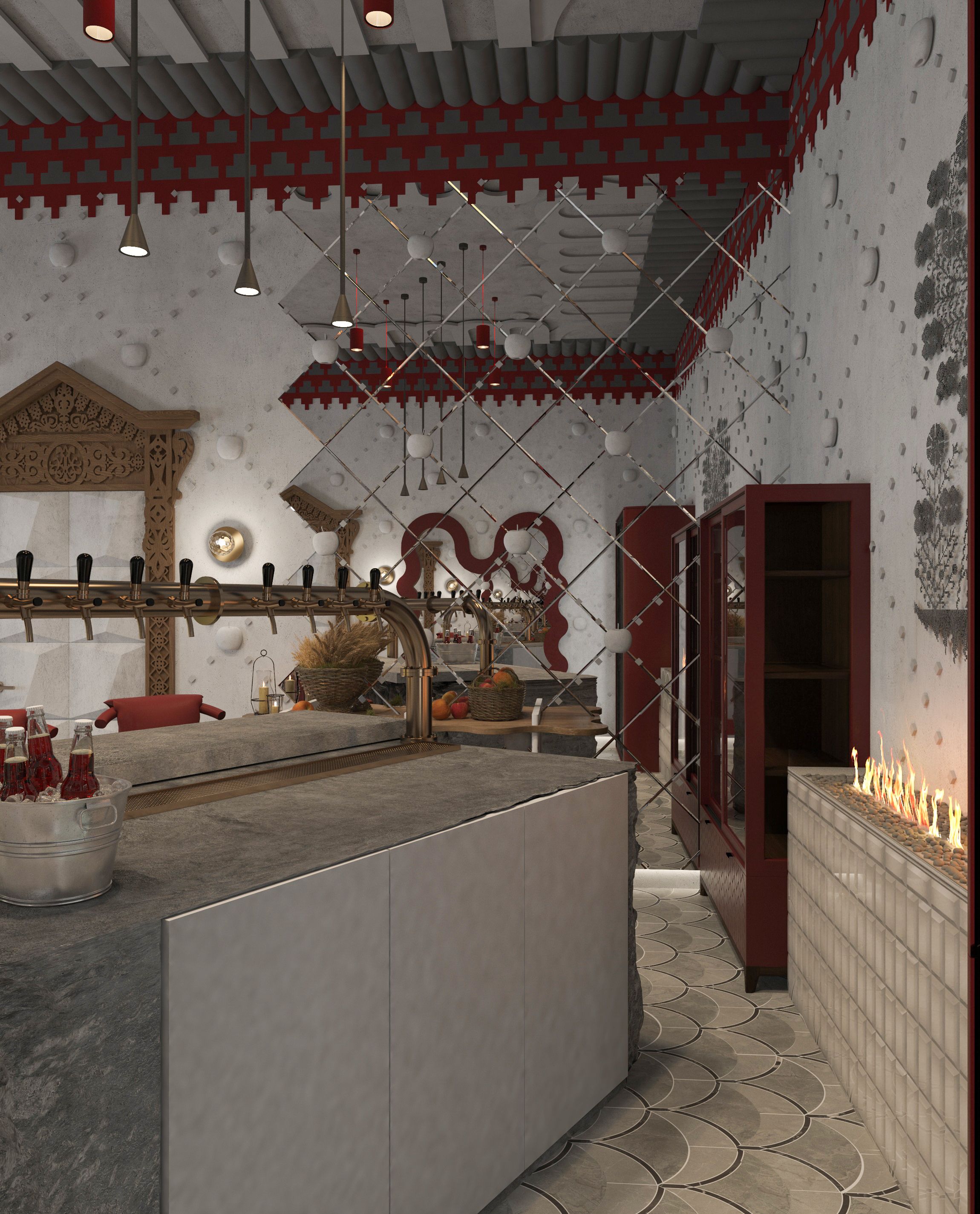 Сидр - слабоалкогольный напиток сделанный на основе фруктов, в данном случае яблок. Идея интерьера Сидрерии - это собирательные образы из русской культуры, народных промыслов, паттернов, напоминающих о славянской культуре и истории, и все вместе является переосмыслением нового русского культурного кода. Мы использовали явления и силы природы, в одушевленность которых верили древние славяне, это огонь, вода, дерево, камень. Их можно в тех или иных образах увидеть в интерьере. Проект за кадром получил название "Светлица".