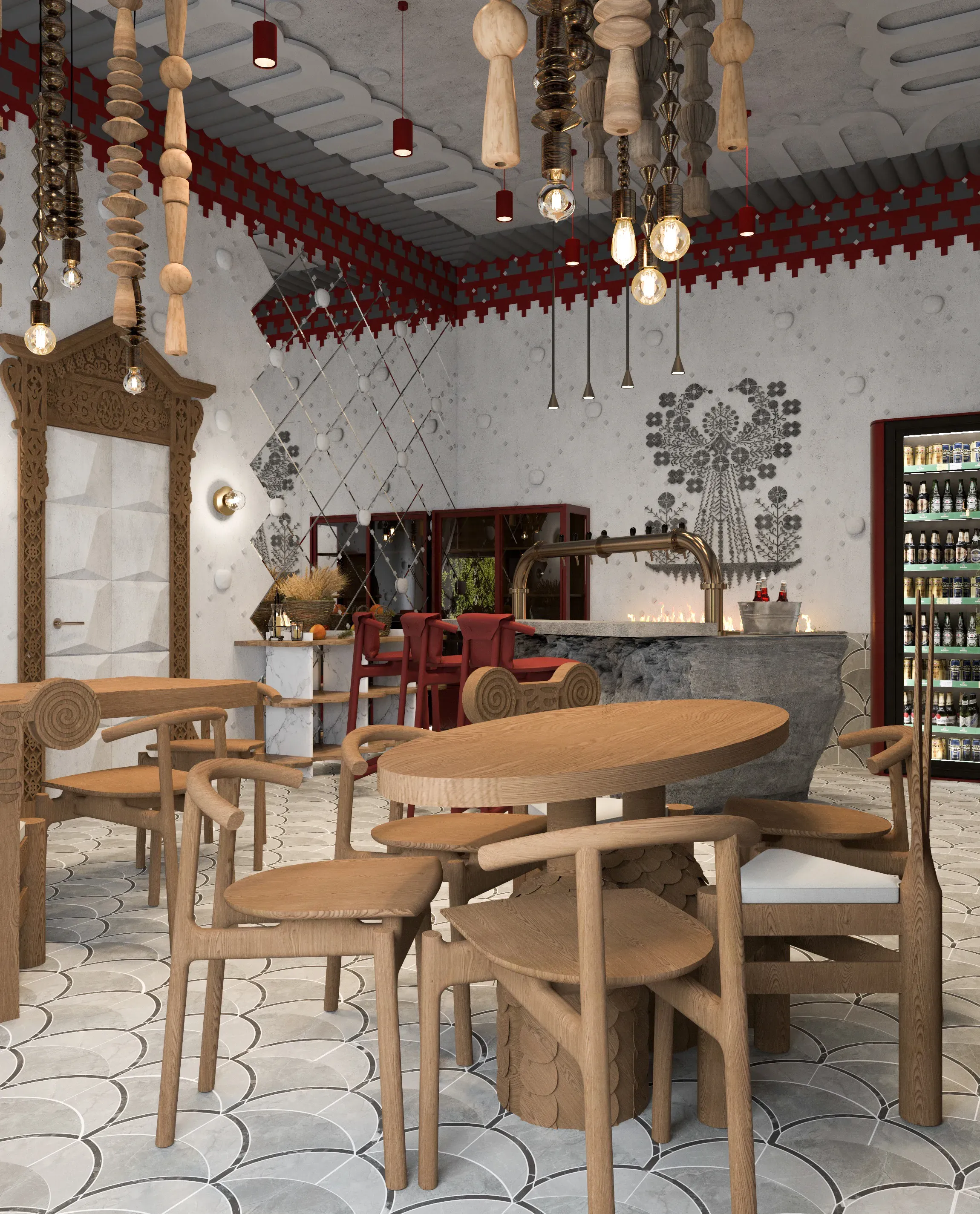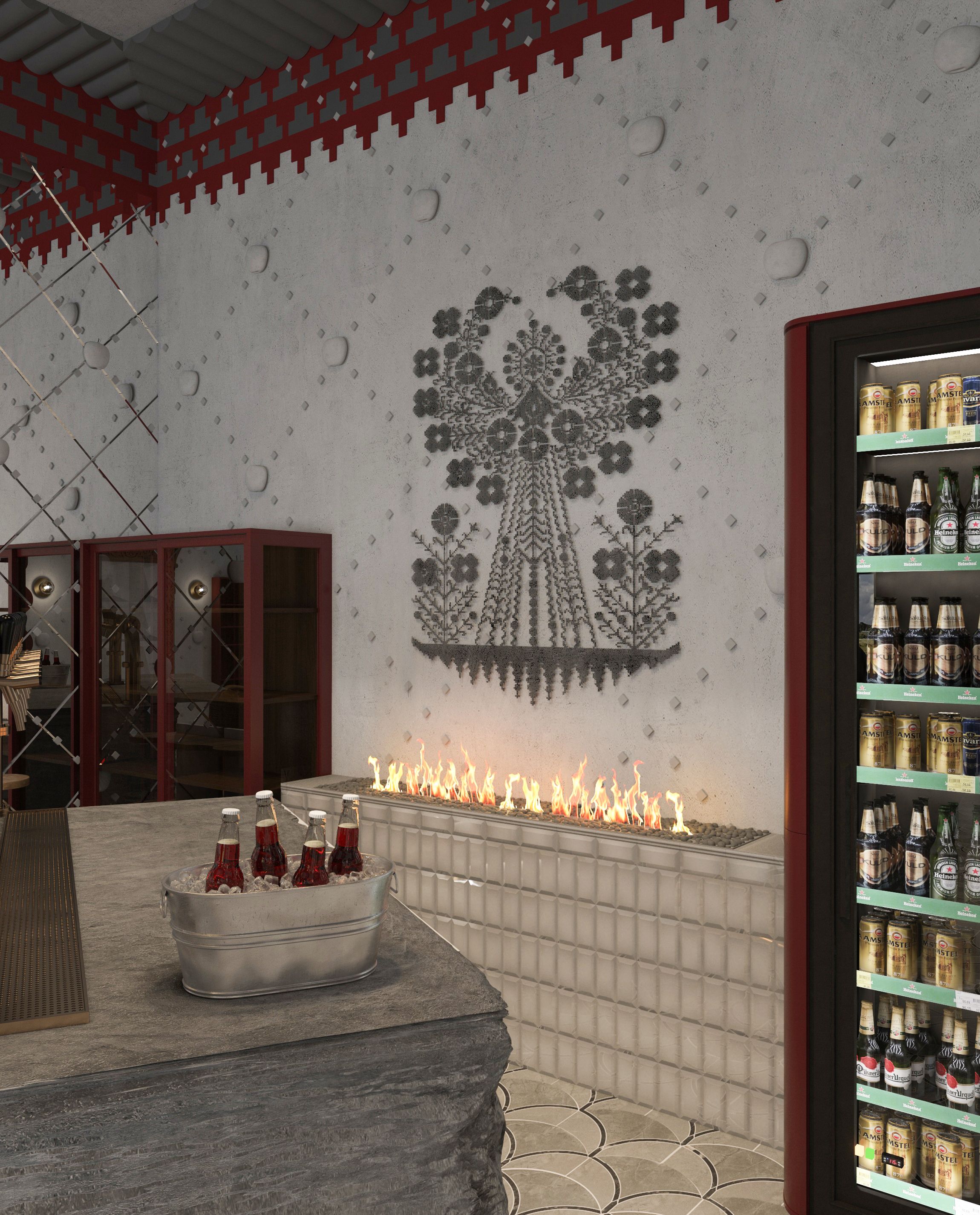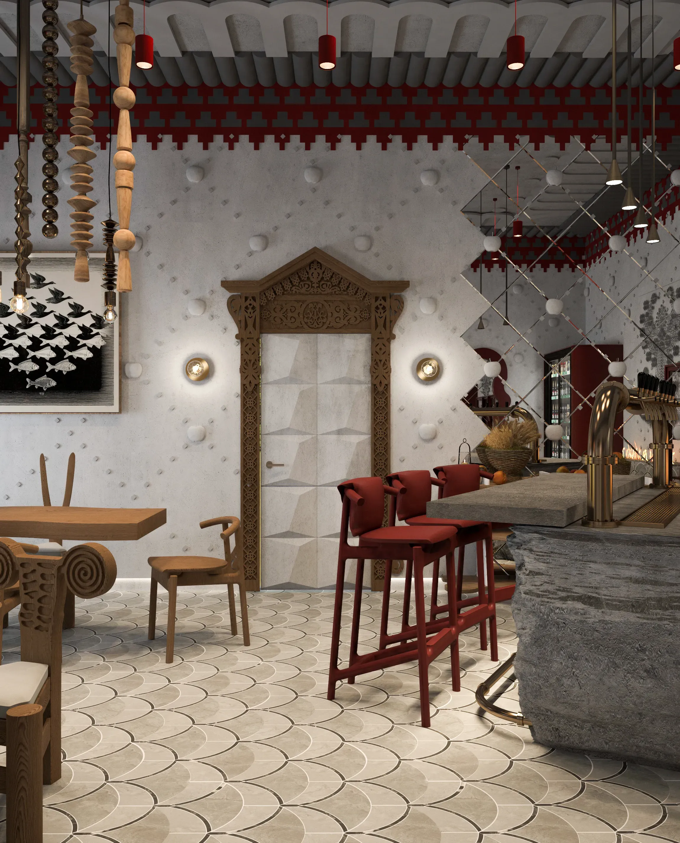 Сидр - слабоалкогольный напиток сделанный на основе фруктов, в данном случае яблок. Идея интерьера Сидрерии - это собирательные образы из русской культуры, народных промыслов, паттернов, напоминающих о славянской культуре и истории, и все вместе является переосмыслением нового русского культурного кода. Мы использовали явления и силы природы, в одушевленность которых верили древние славяне, это огонь, вода, дерево, камень. Их можно в тех или иных образах увидеть в интерьере. Проект за кадром получил название "Светлица".