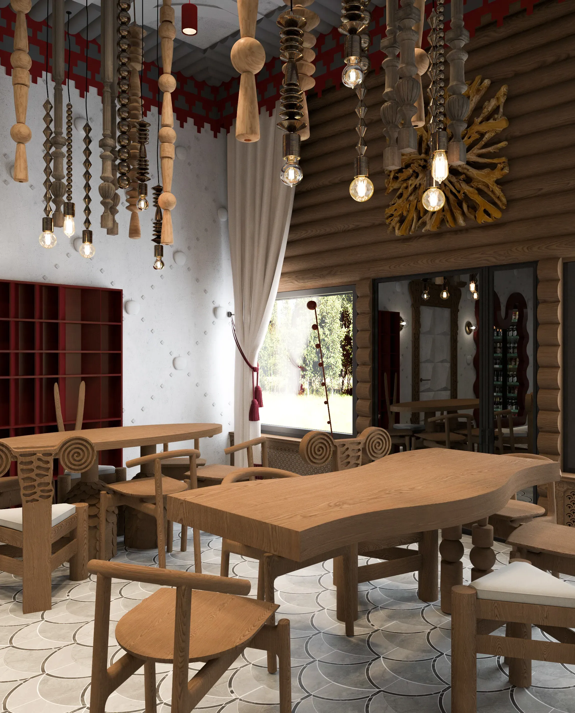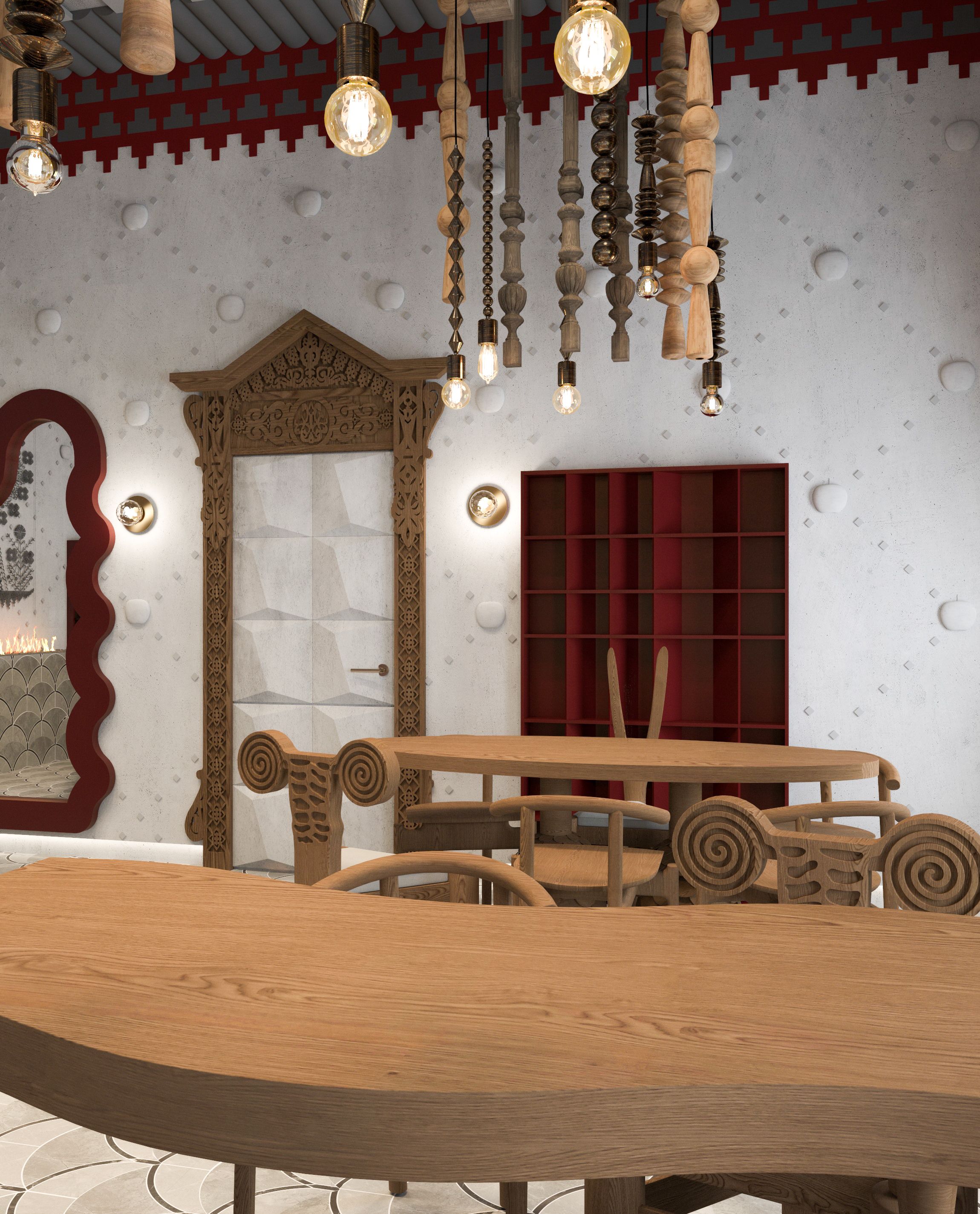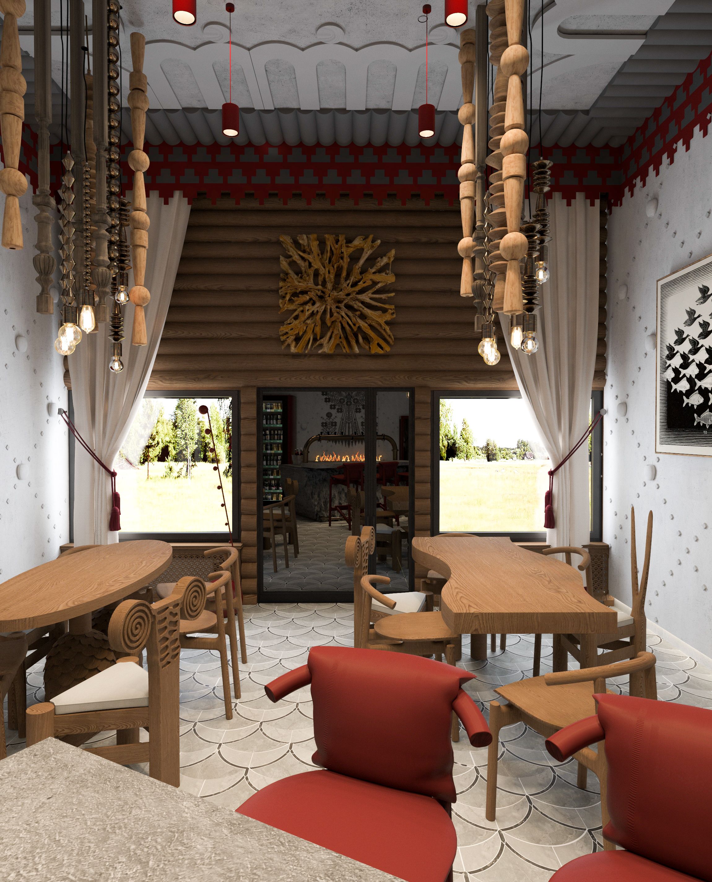 Помимо того, что ряд мебели был создан непосредственно для этого интерьера, чтобы подчеркнуть его славянское происхождение, была и мебель, которую мы нашли у отечественных производств. Например стулья в проекте Unika Moblar Hans, стулья козел и баран от бренда INA, подошла в интерьер красная вешалка Веселица от Zapazuha, стеллаж Yaratam, сервант от Idea.