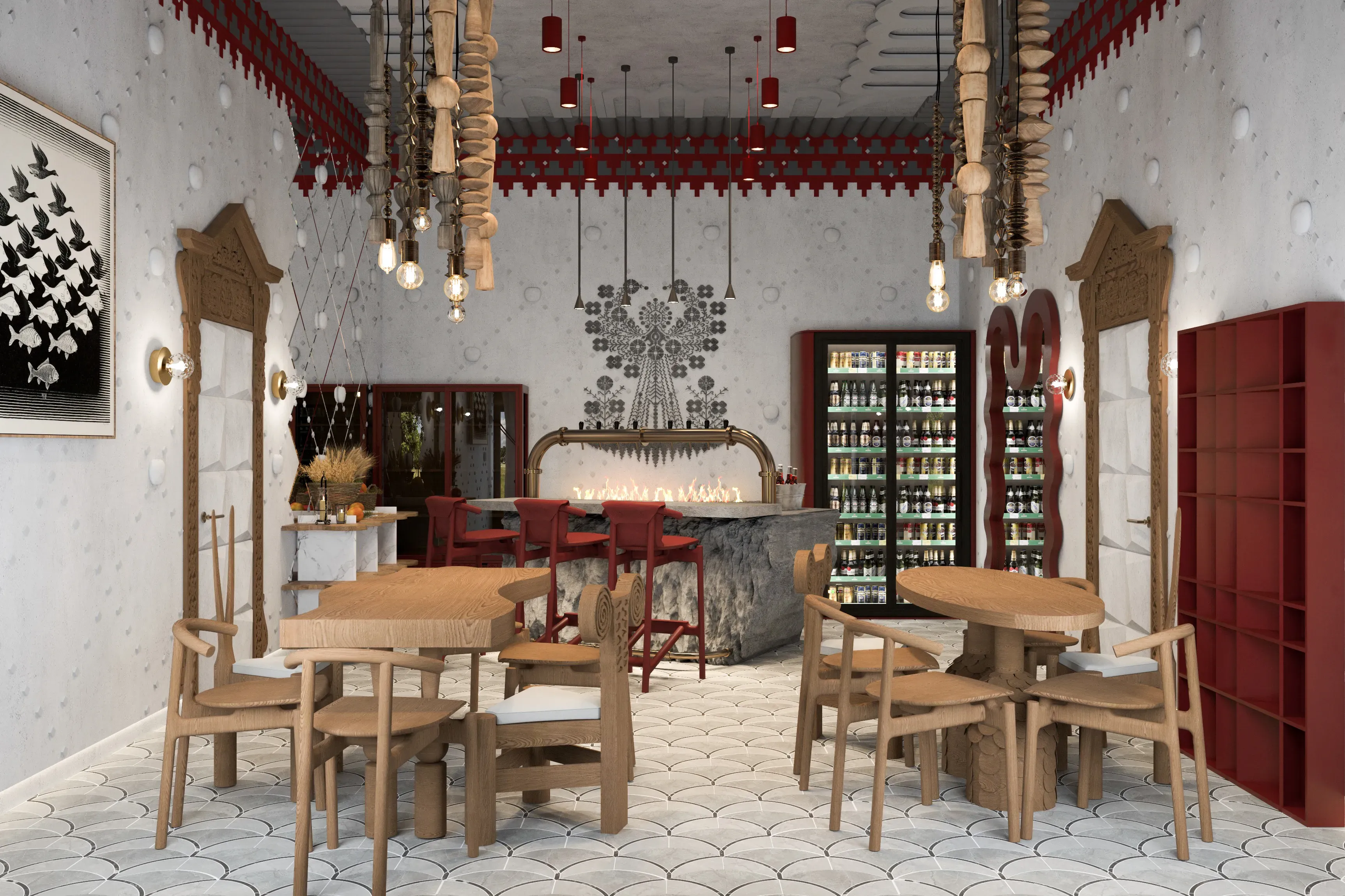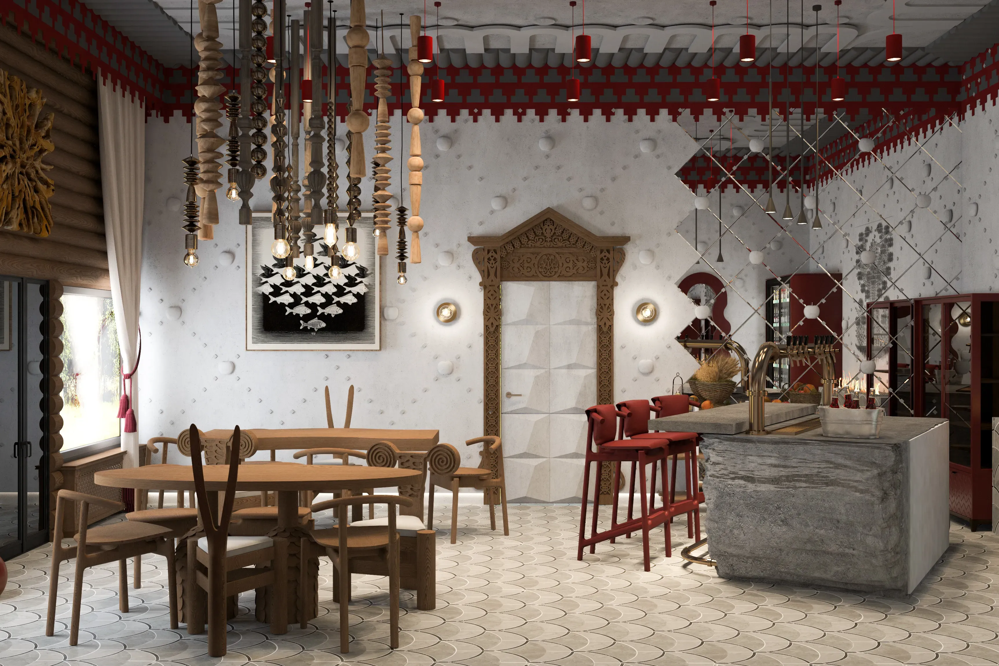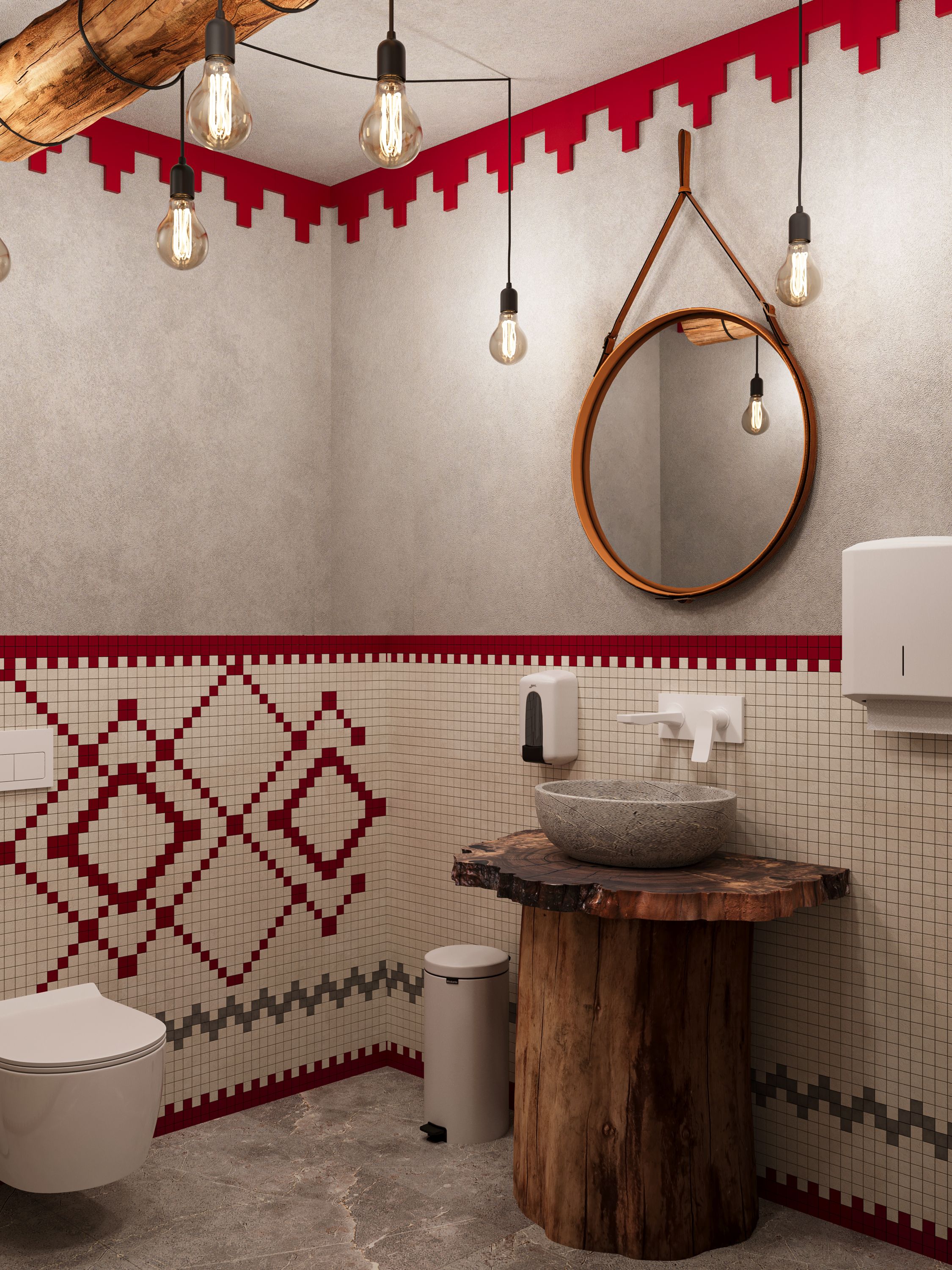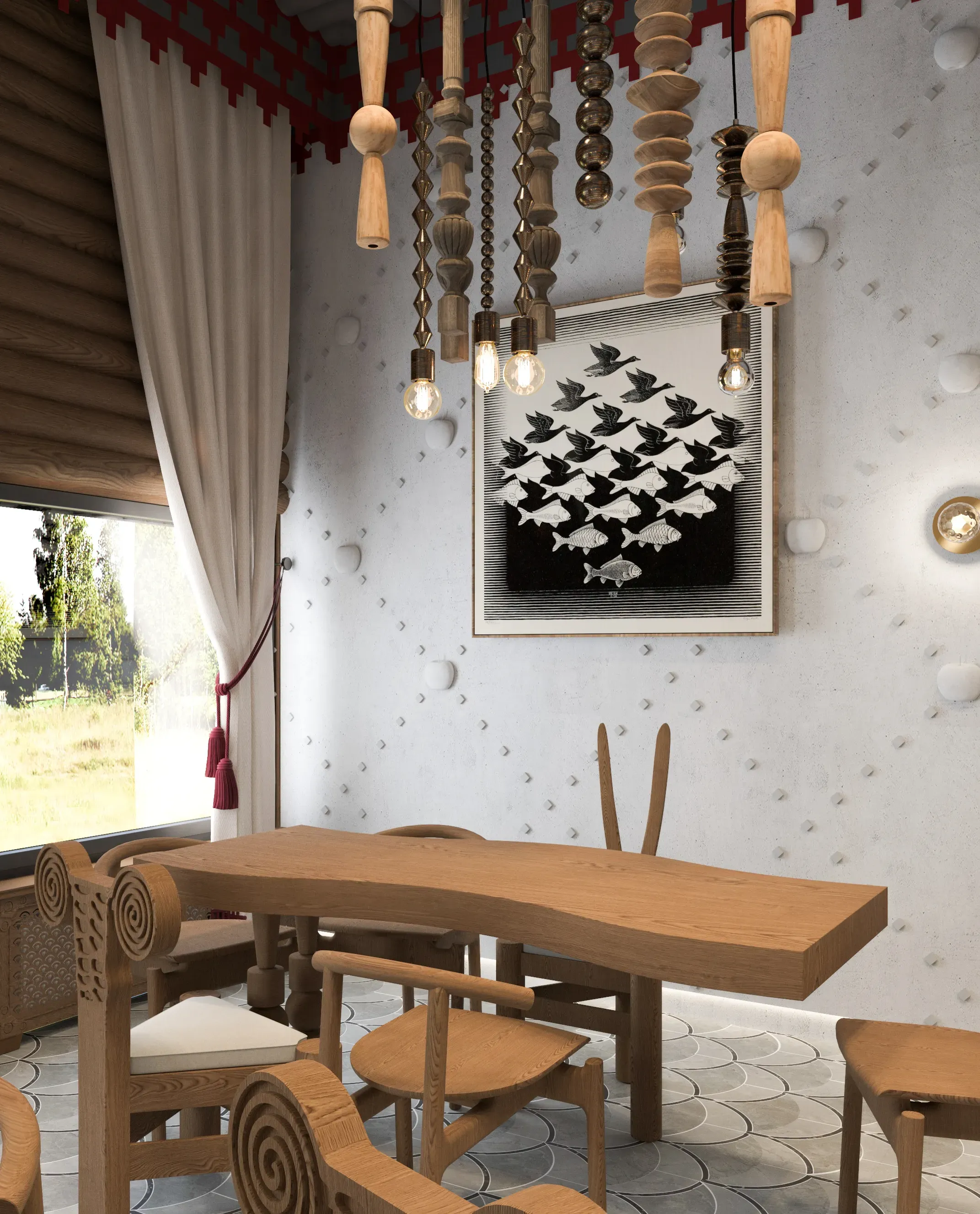 Помимо того, что ряд мебели был создан непосредственно для этого интерьера, чтобы подчеркнуть его славянское происхождение, была и мебель, которую мы нашли у отечественных производств. Например стулья в проекте Unika Moblar Hans, стулья козел и баран от бренда INA, подошла в интерьер красная вешалка Веселица от Zapazuha, стеллаж Yaratam, сервант от Idea.