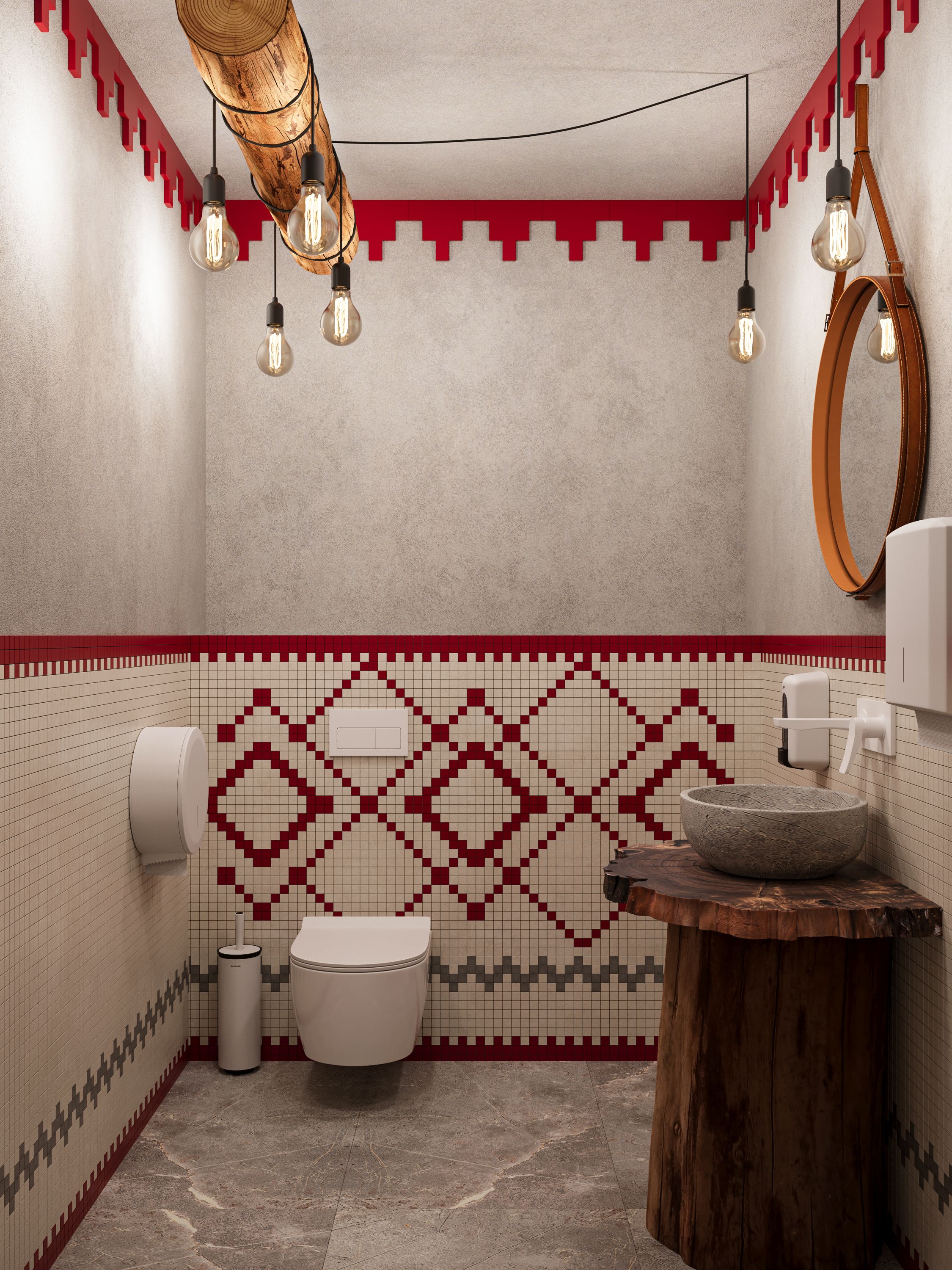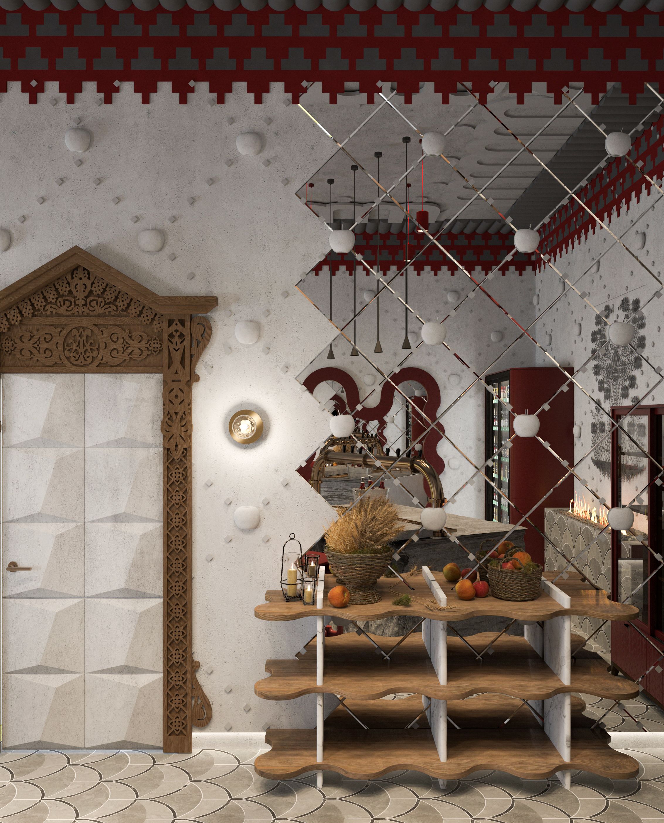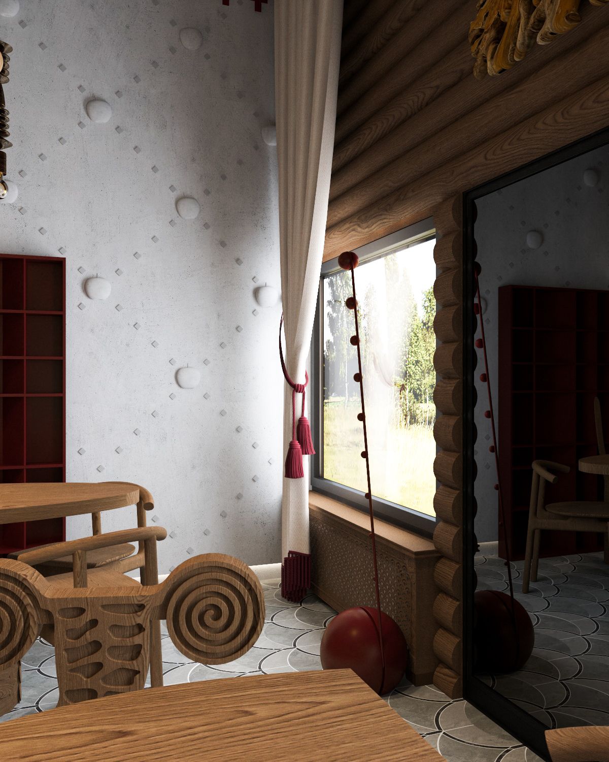 Цветовая палитра была выбрана нейтрально серо-белая с добавление контрастного красного цвета и золотистого цвета дерева. Цвета тоже должны давать отсылки к общему неорусскому стилю интерьера Сидрерии.