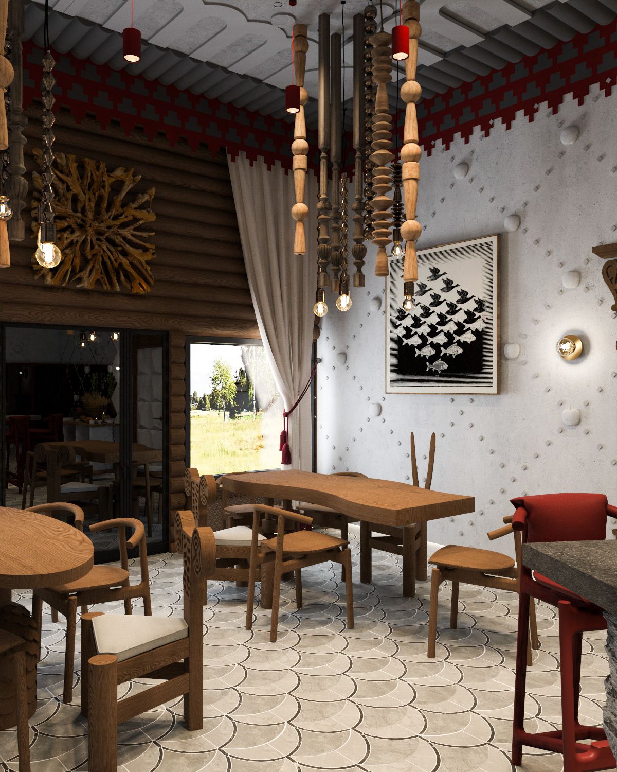 В зале находятся два деревянных дегустационных стола с общей посадкой. Один стол мы назвали “река”, другой - “селедка”. Над столами висят деревянные резные тотемы и подвесы с источниками освещения. За столами стоят стулья. Некоторые стулья выполнены в игровой форме и напоминают животных: козла и барана. Необычную волнообразную форму стола-реки поддерживает стеллаж-река, который стоит у стены рядом с “тем самым камнем”.