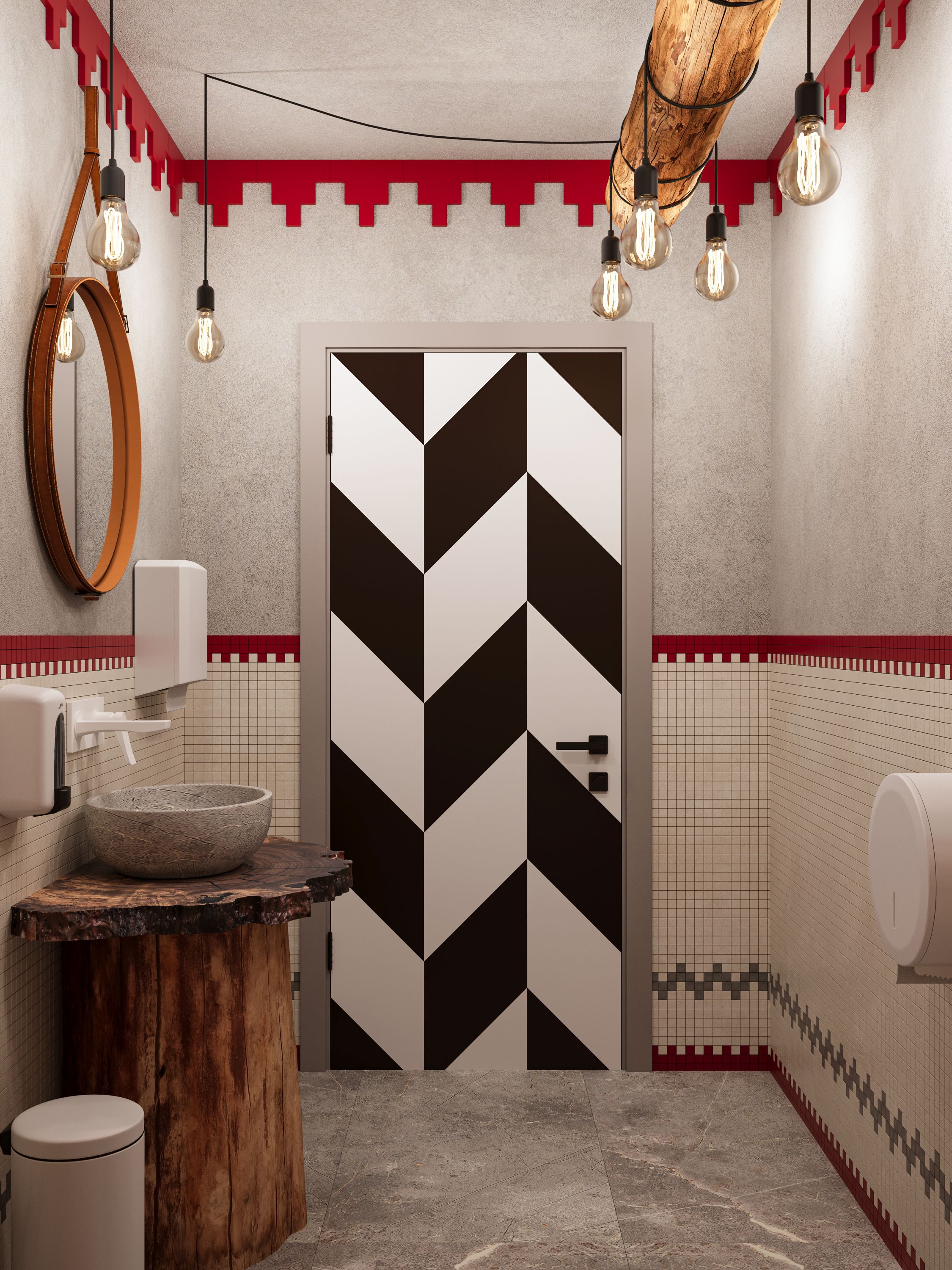 Освещение в баре не должно быть. (Шутка.) Замечено психологическое поведение людей, когда в темном месте начинают алкоголь пить больше. Но у нас дегустационный зал. Мы запроектировали общее освещение. В зале будут рассказывать о напитках, их истории в формате лекции или ненавязчивого рассказа, поэтому возможно будет важным разглядеть, что в бокале. На всякий случай общее освещение на диммере, если вдруг все таки захочется потемнее. Далее светом выделены зоны посадки гостей. Свет сосредоточен над столами. Свет разный. Чтобы сделать световую атмосферу интереснее, мы добавили бра на стены, которые акцентируют двери в производственные помещения, ярко оформленные наличниками.