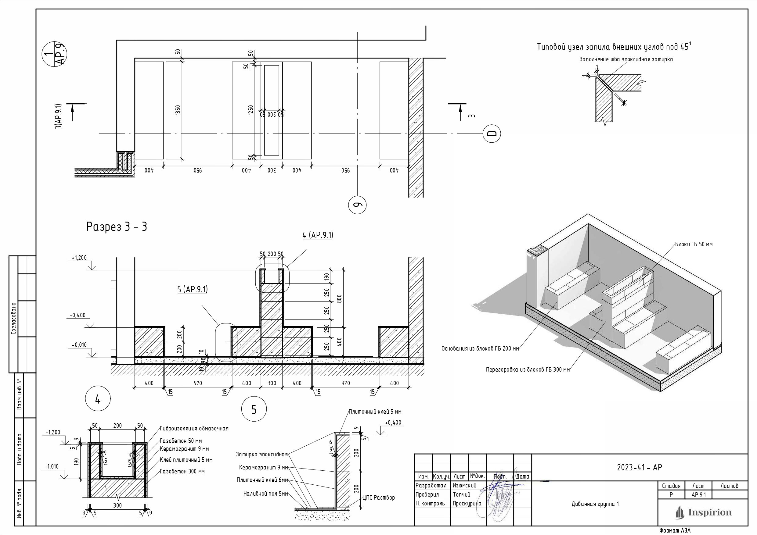 Устройство мягких диванных зон из газоблоков толщин: 50, 100, 200, 300 мм- Устройство простенков и потолочных конструкций из ГКЛ-конструкций на металличском профиле КНАУФ - Устройство внутренних остеклённых перегородок с двумя стёклами на алюминиевом каркасе- Частичная замена цементно-песчаной стяжки-Отделочные работы по помещениям