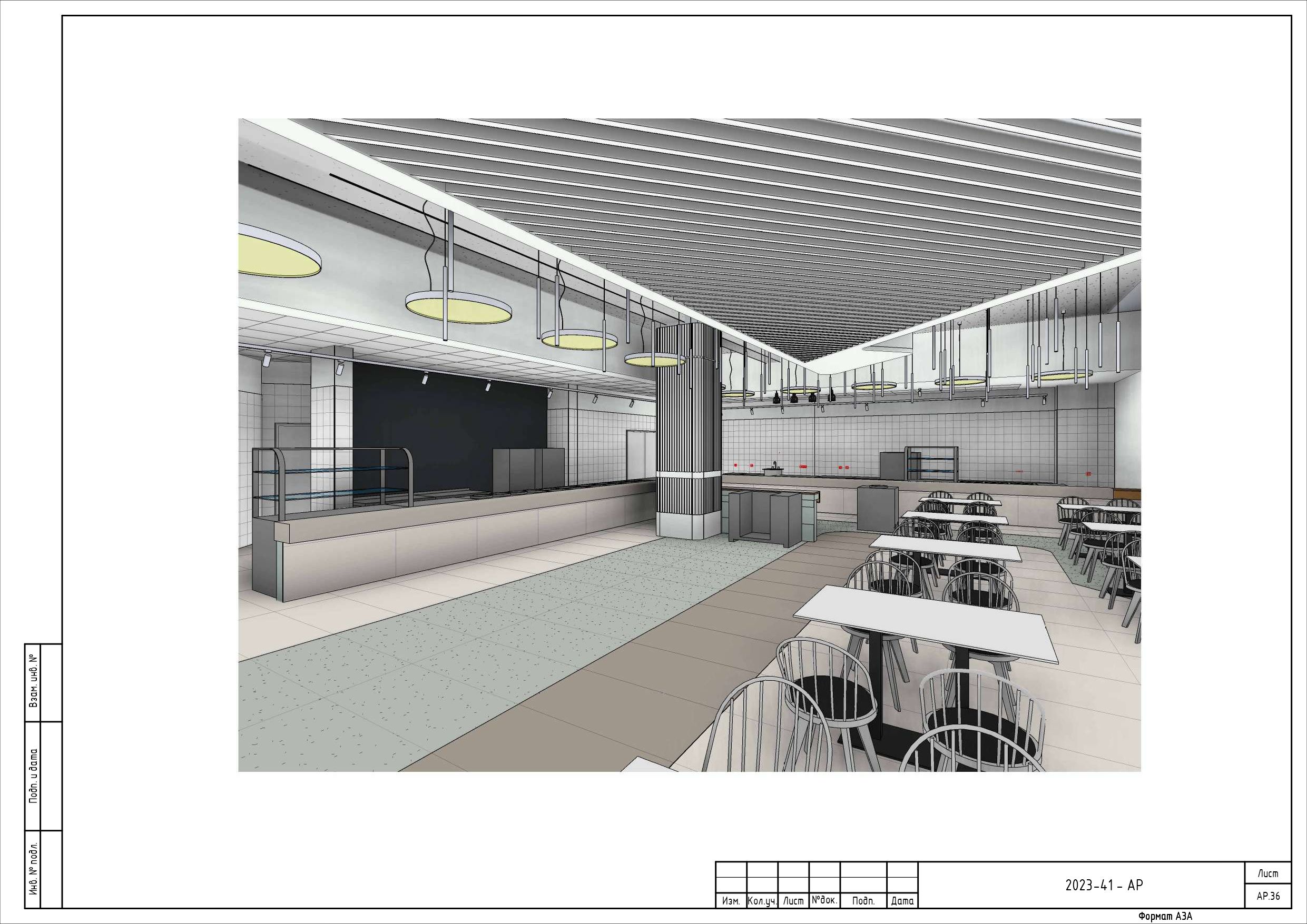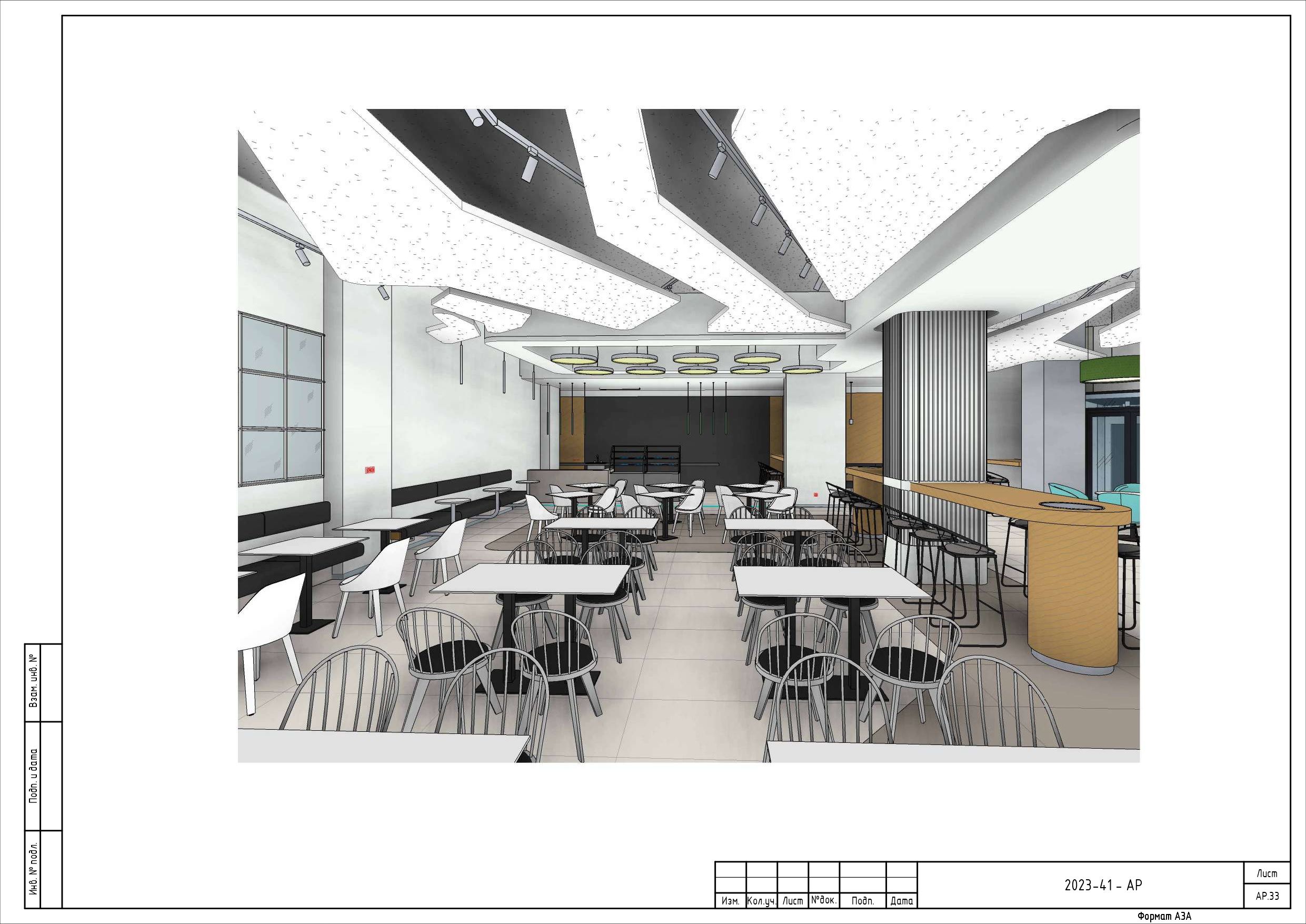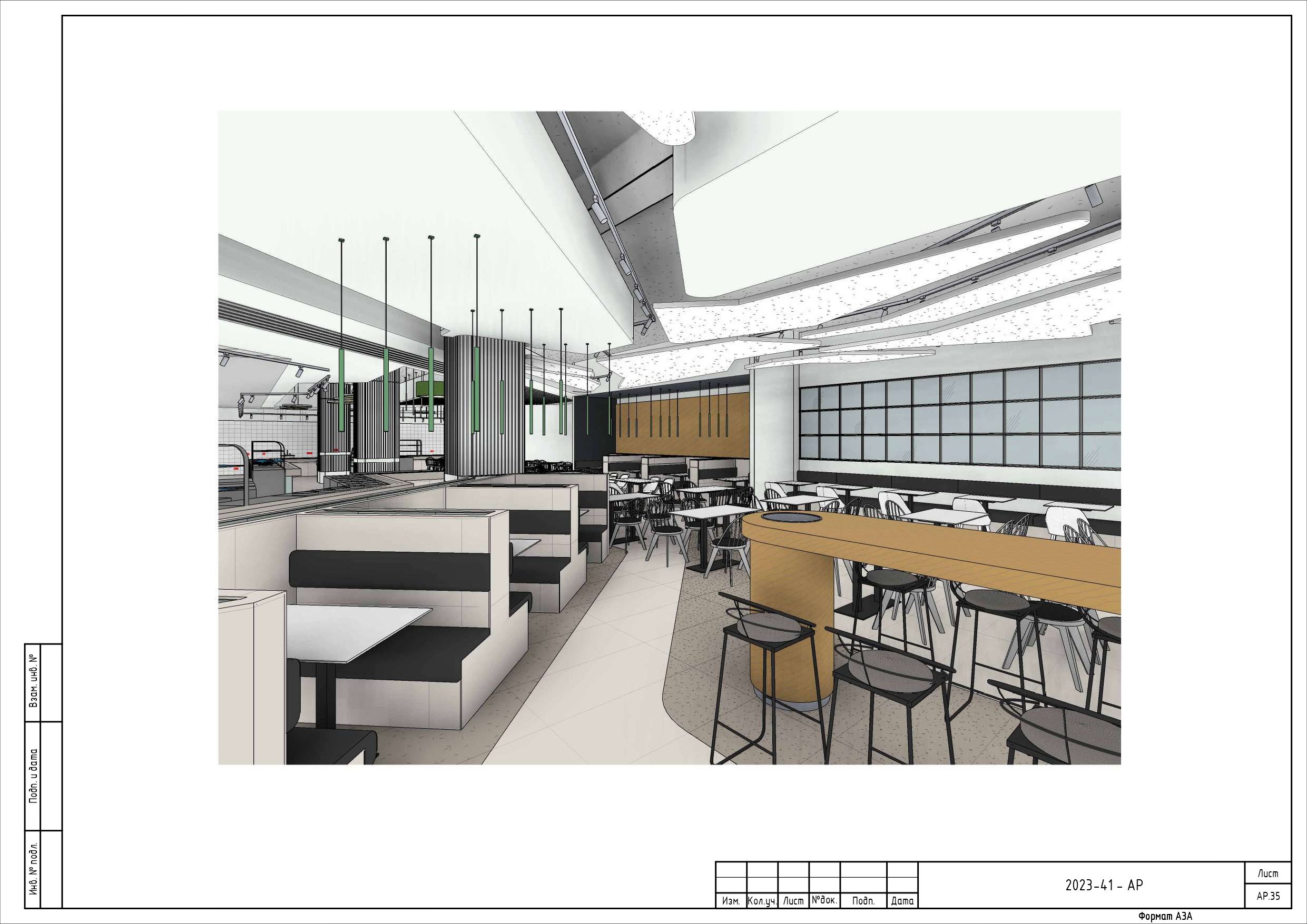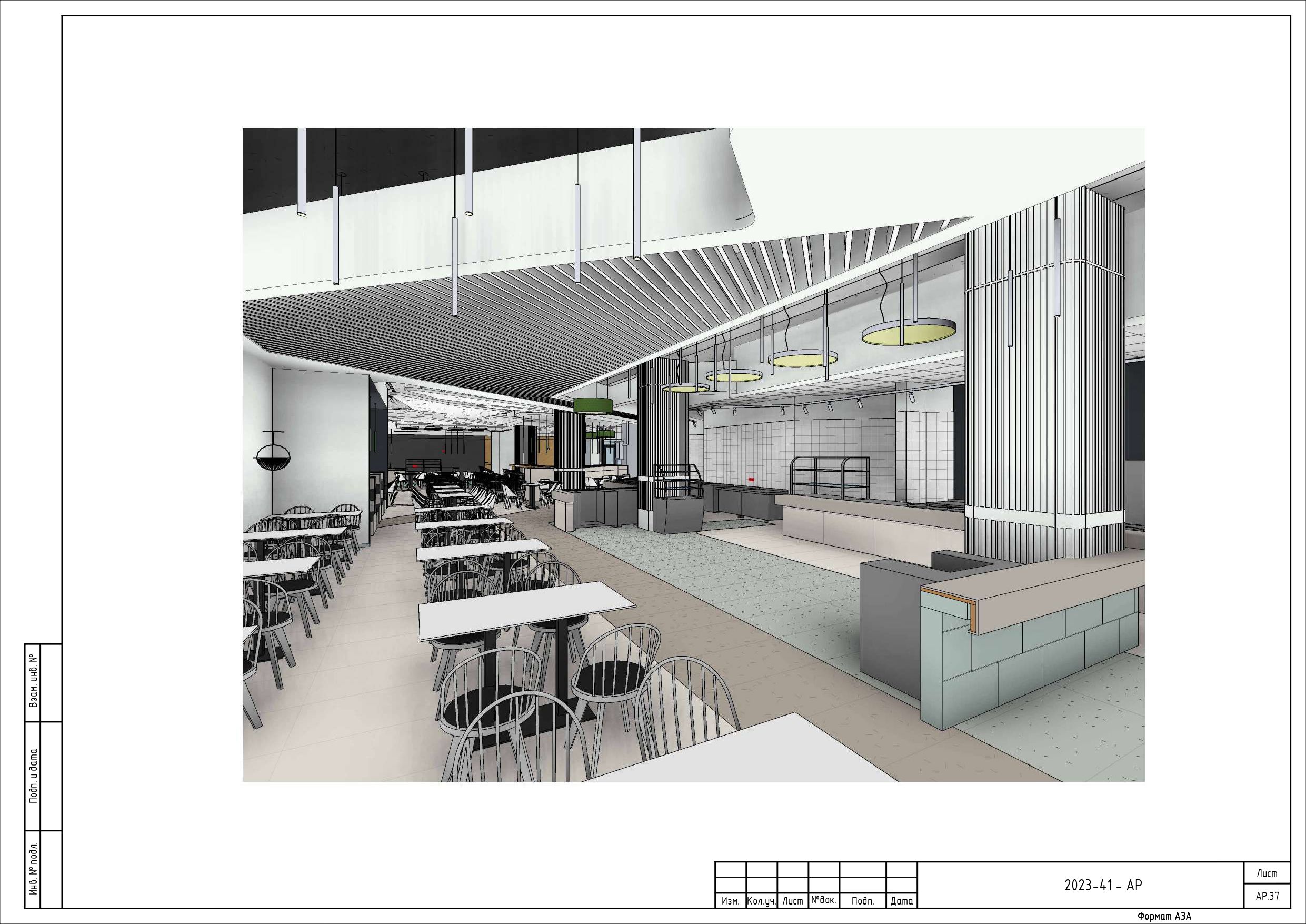 Задача была разработать АР для поэтапного ремонта в столовой, которая должна не прекращать работать. Был разработан АР временной схемы размещения кухни столовой и АР постоянной схемы. Здесь выложен АР постоянной схемы размещения вместе с зоной посадки. Работа в Revit. Архитектурные решения и инженерные решения адаптированы друг к другу. Также были разработаны проекты ОВ, ВК, ЭОМ и СКС под штампом Подрядчика.