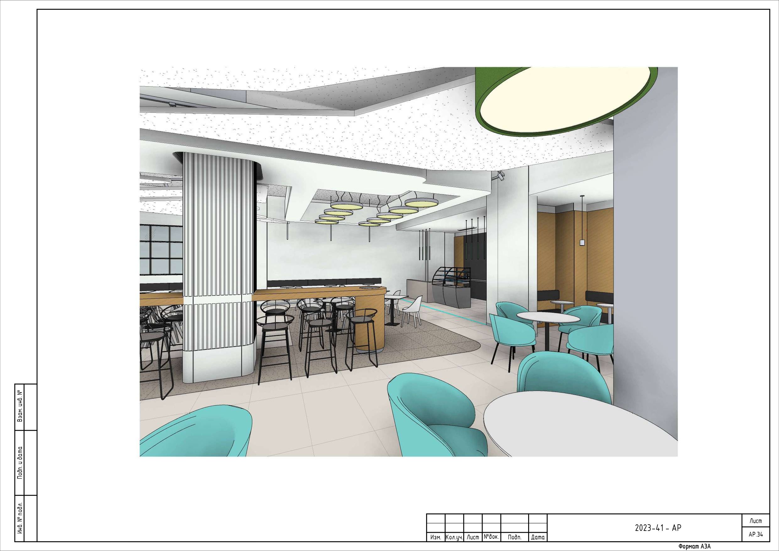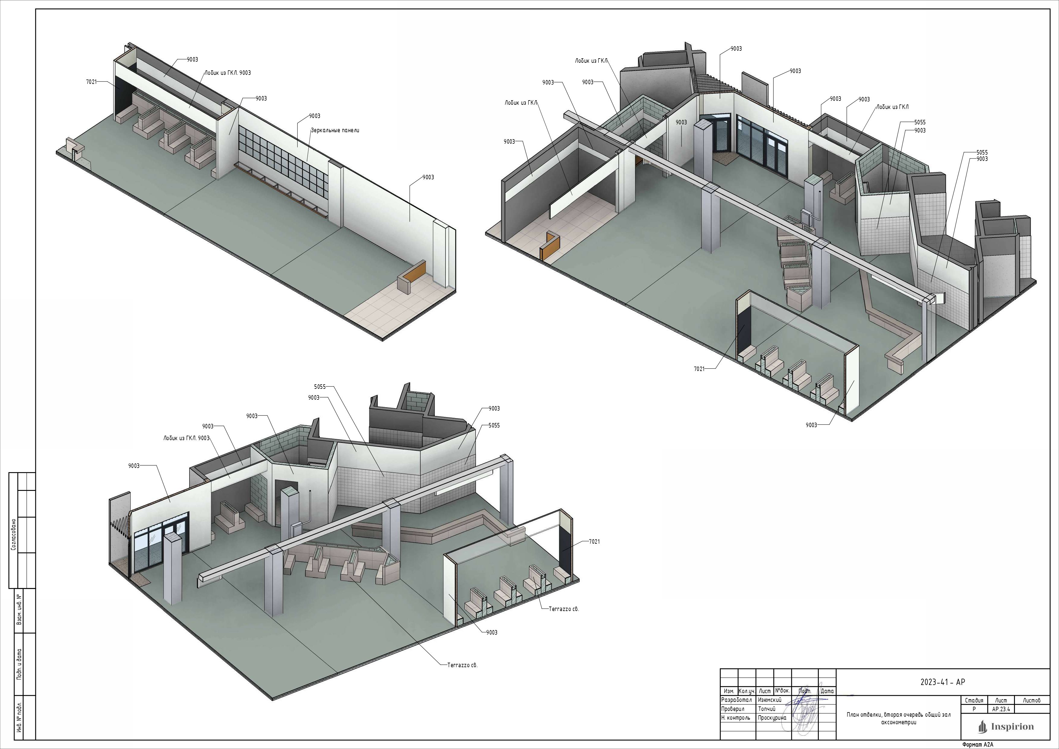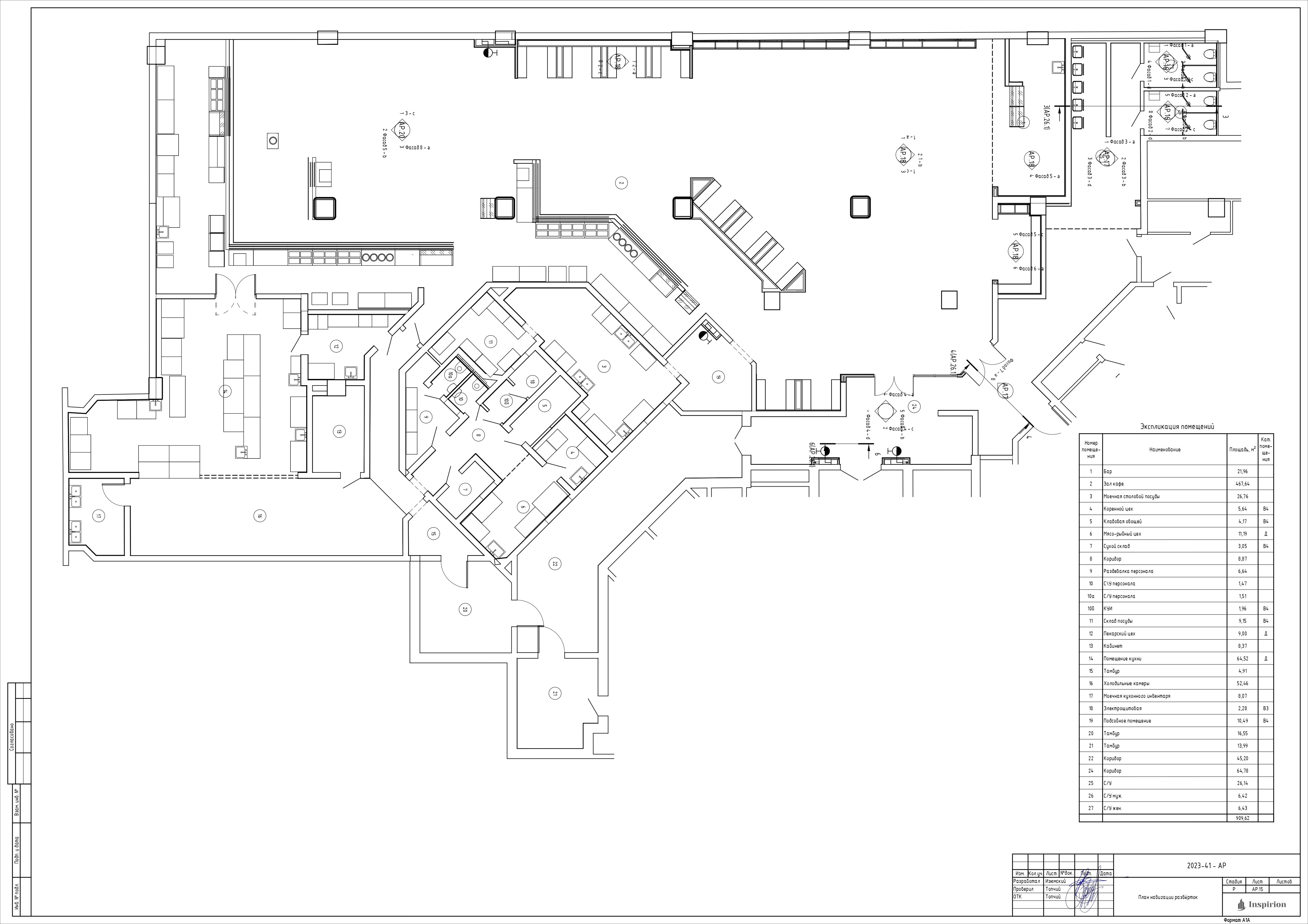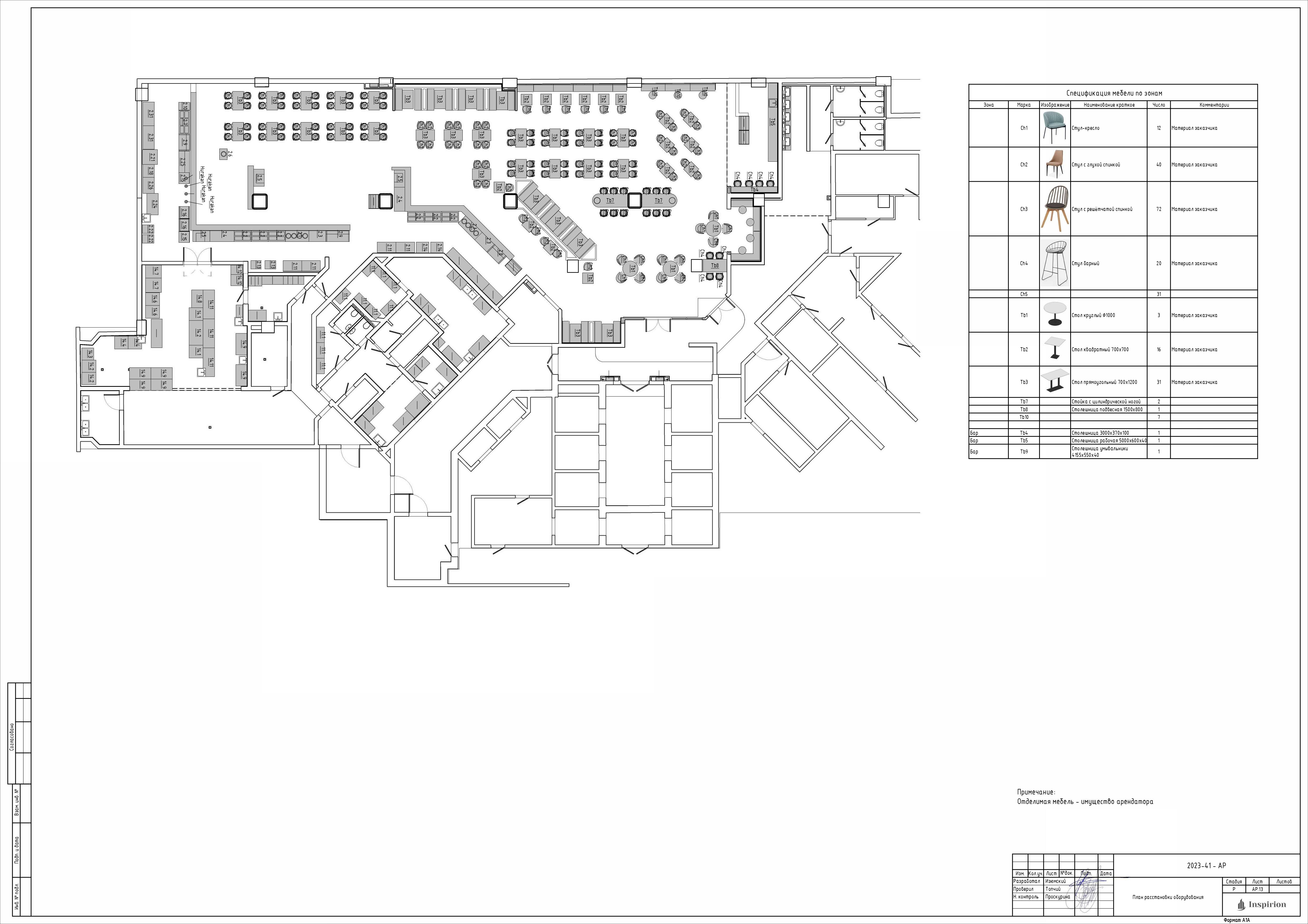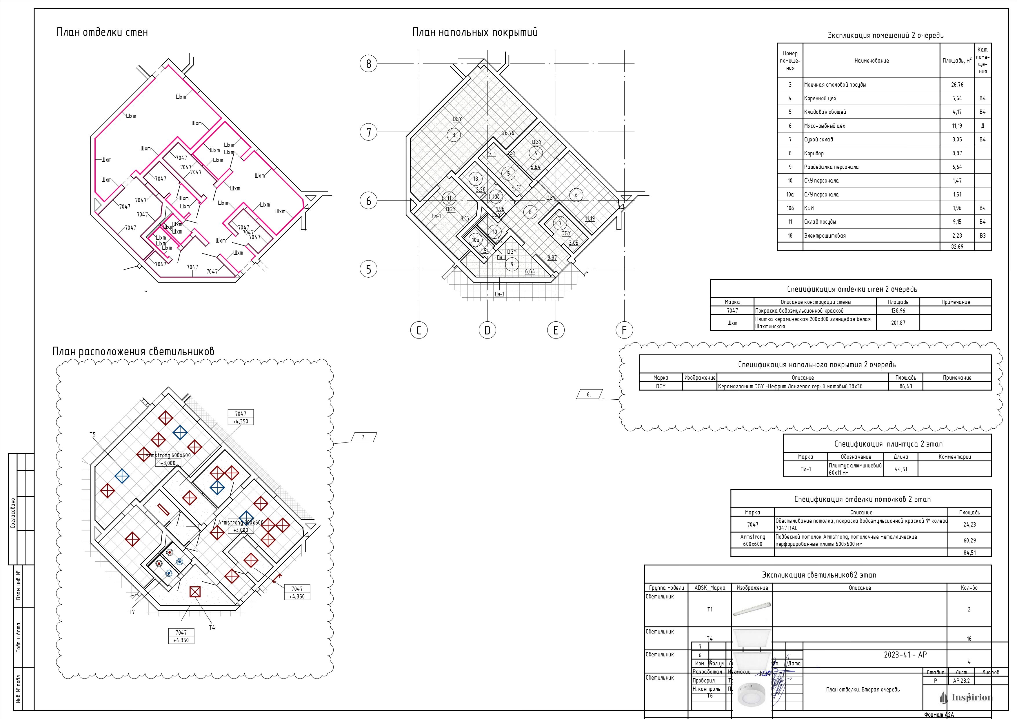 Задача была разработать АР для поэтапного ремонта в столовой, которая должна не прекращать работать. Был разработан АР временной схемы размещения кухни столовой и АР постоянной схемы. Здесь выложен АР постоянной схемы размещения вместе с зоной посадки. Работа в Revit. Архитектурные решения и инженерные решения адаптированы друг к другу. Также были разработаны проекты ОВ, ВК, ЭОМ и СКС под штампом Подрядчика.