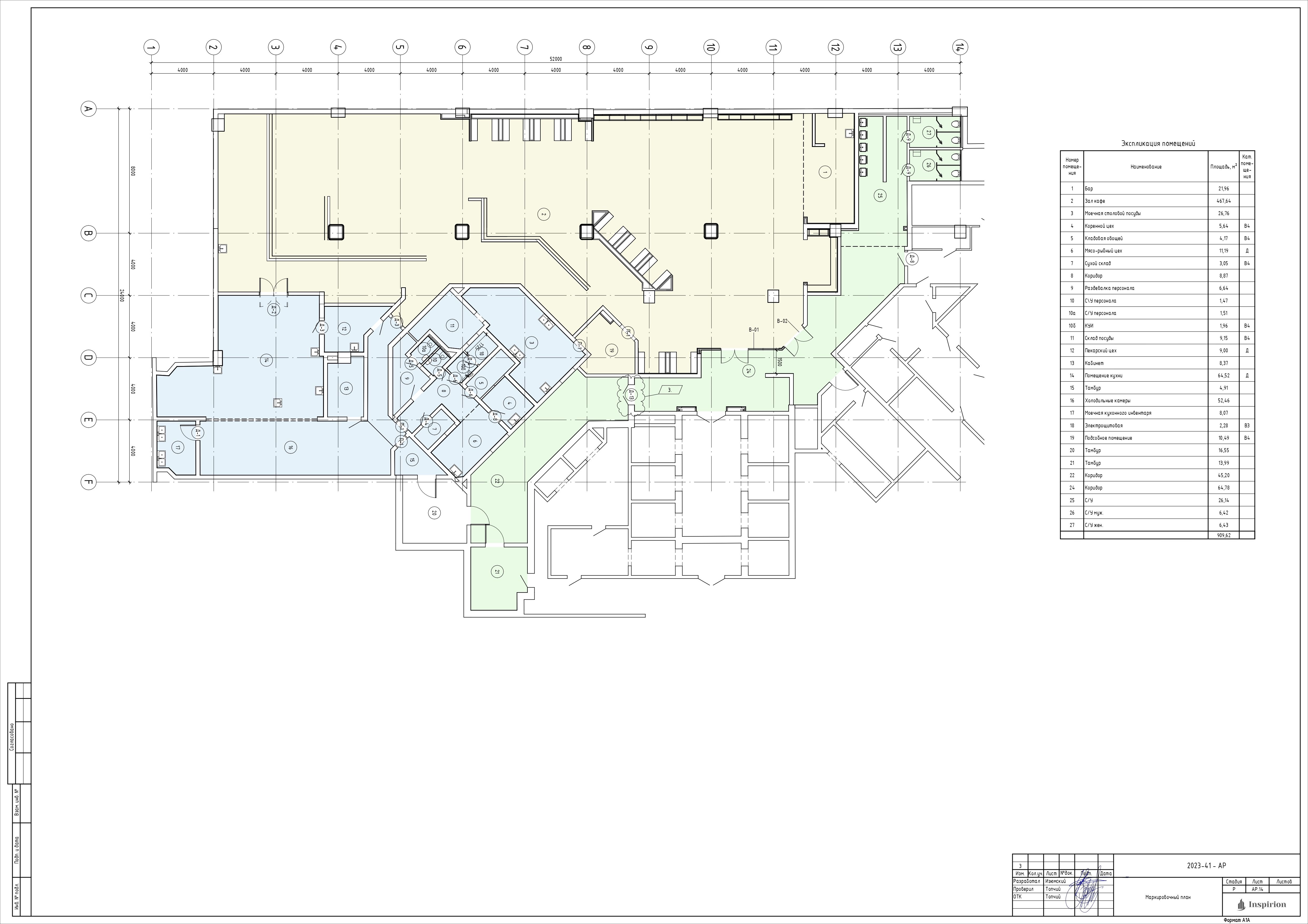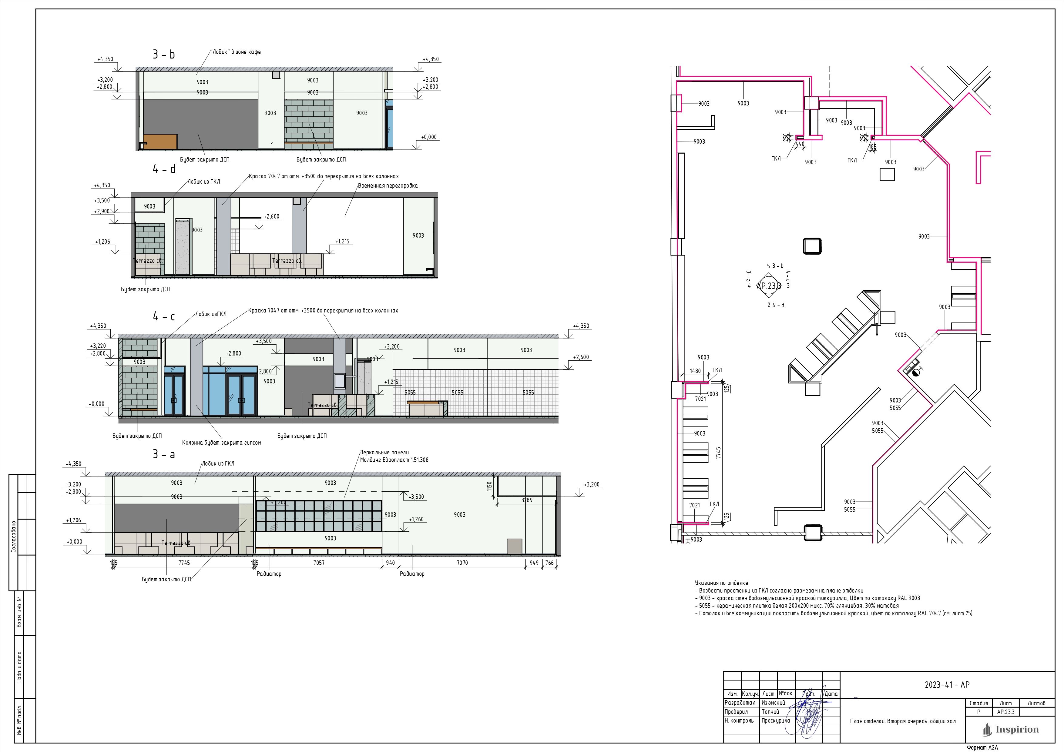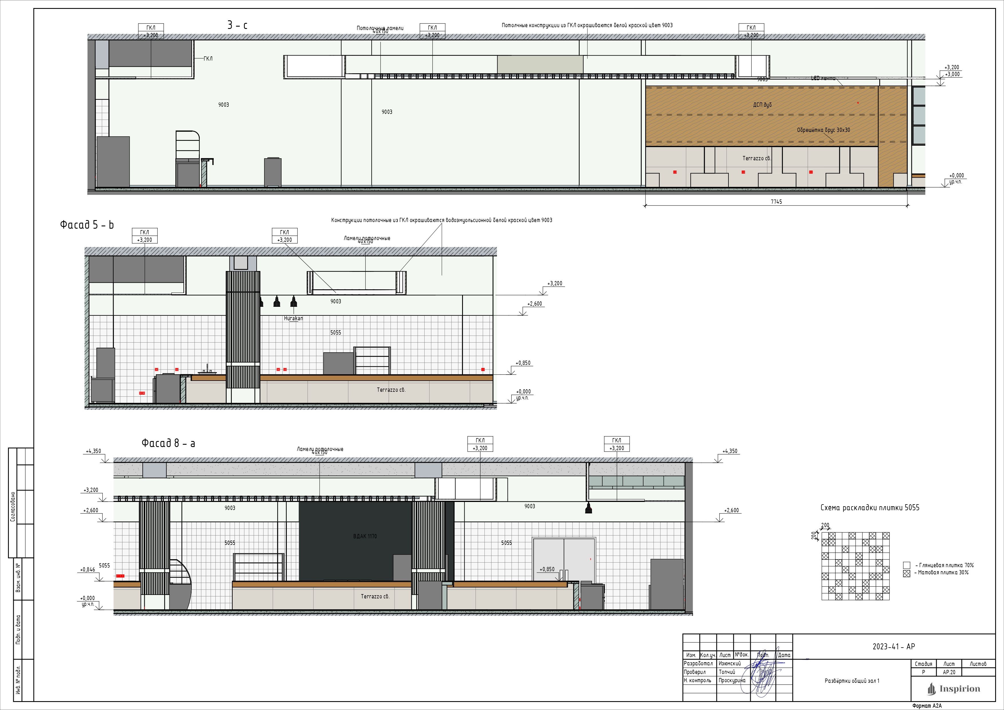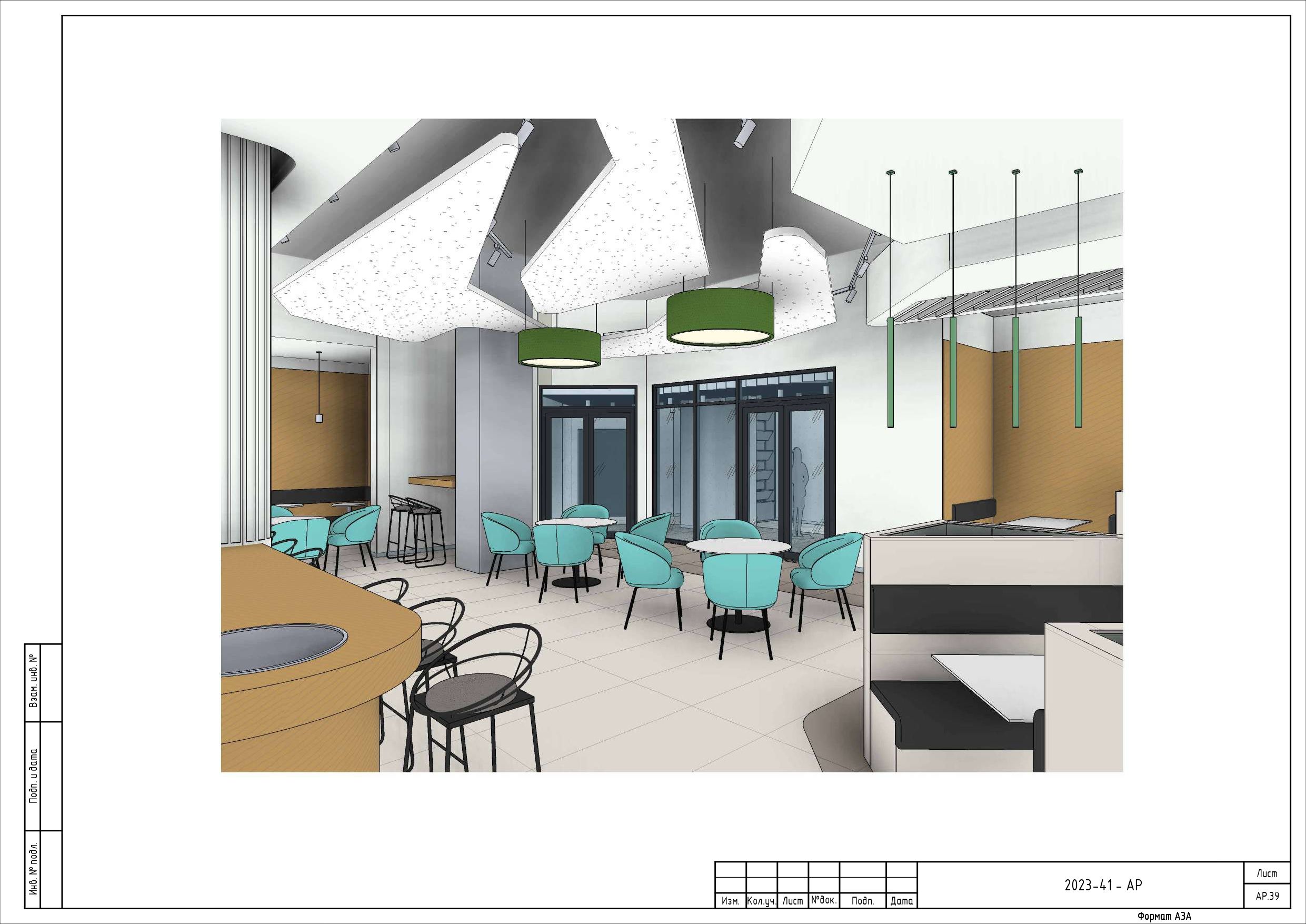 Задача была разработать АР для поэтапного ремонта в столовой, которая должна не прекращать работать. Был разработан АР временной схемы размещения кухни столовой и АР постоянной схемы. Здесь выложен АР постоянной схемы размещения вместе с зоной посадки. Работа в Revit. Архитектурные решения и инженерные решения адаптированы друг к другу. Также были разработаны проекты ОВ, ВК, ЭОМ и СКС под штампом Подрядчика.