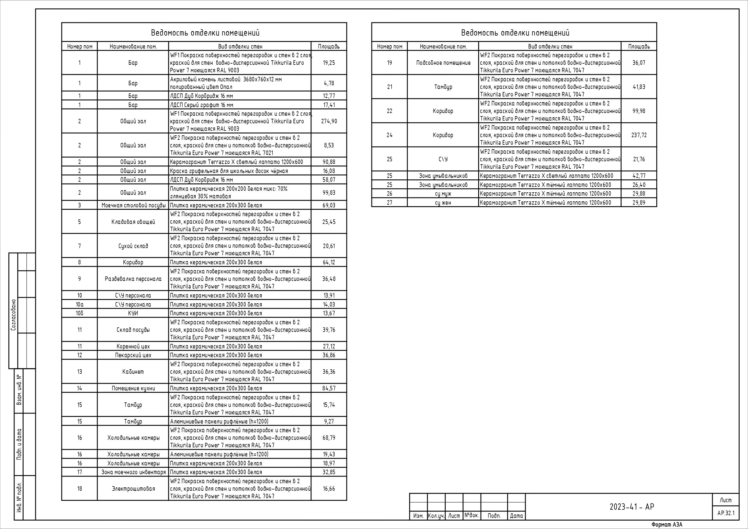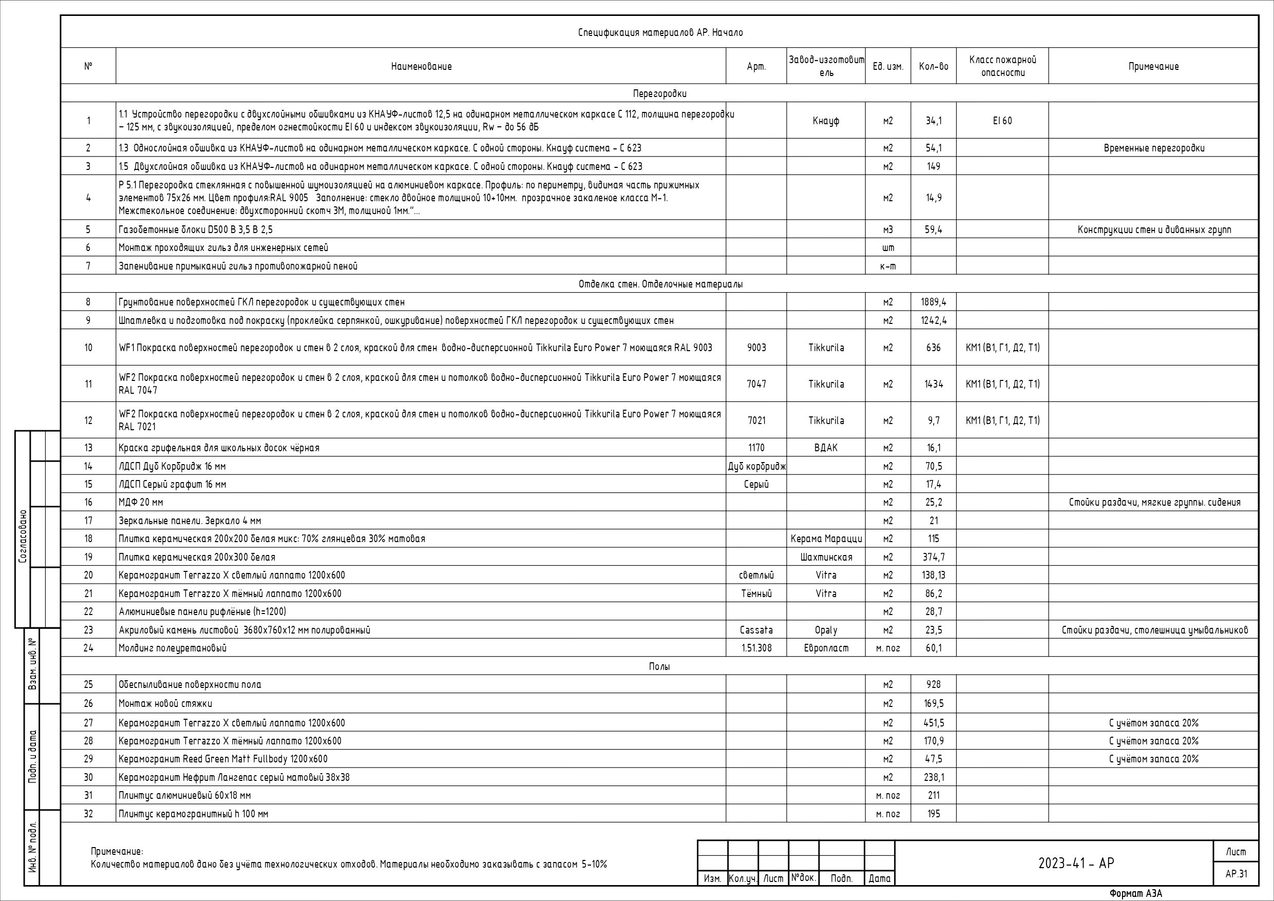 Для отделки стен, потолков предусмотреть материалы групп не ниже чем класс КМ2 (Г1, В2, Д2, Т2, РП1), и материалы для покрытия пола не ниже чем класс КМ3 (Г2, В2, Д3, Т2, РП2). Категория качества отделки стен - улучшенная: для укладки плитки и листовых материалов - К1, для покраски - К3.